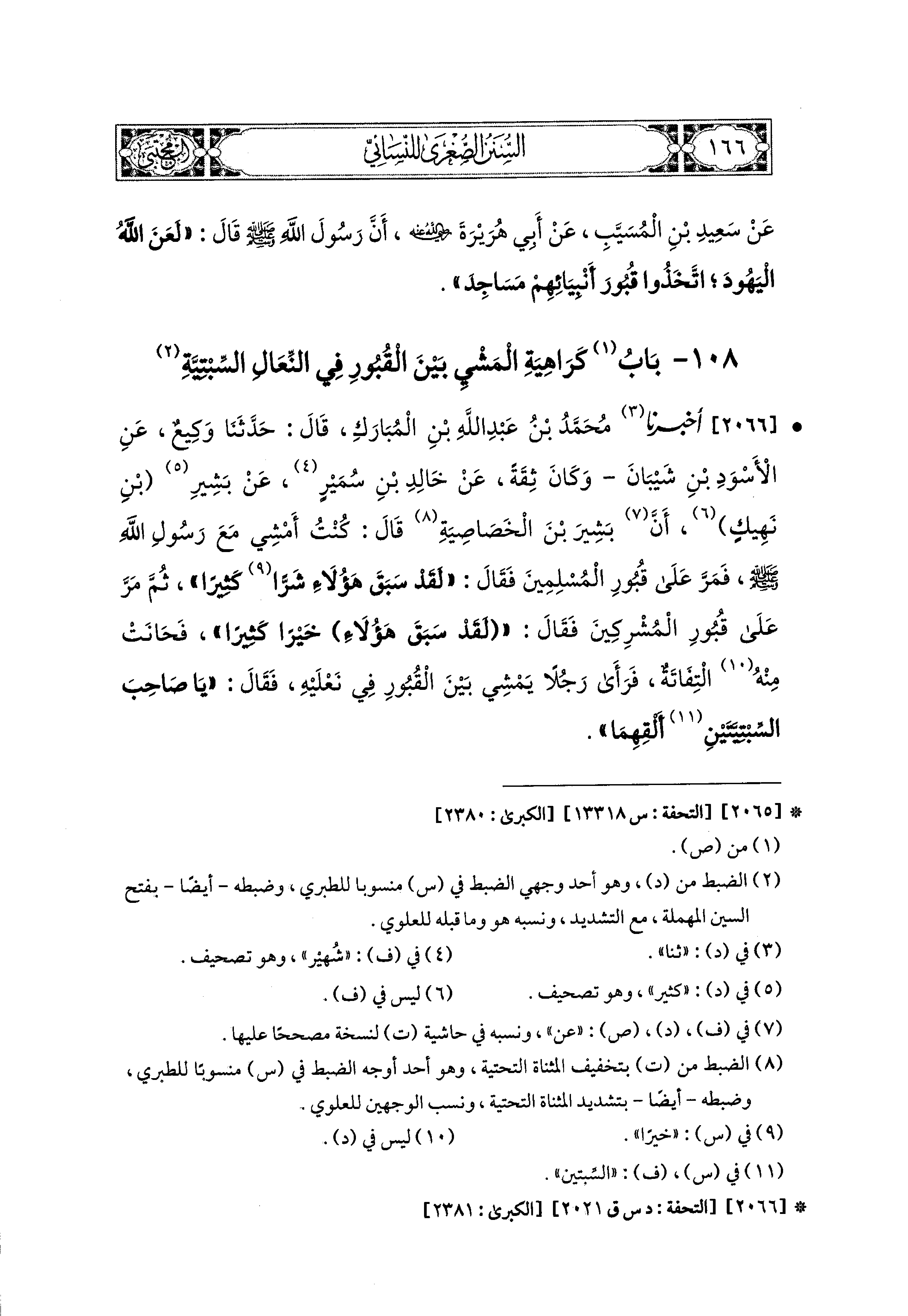 2066- أَخبَرَنا مُحَمد بْنُ عَبدِ اللهِ بْنِ المُبَارَكِ، قال: حَدثنا وَكِيعٌ، عَنِ الأَسْوَدِ بْنِ شَيْبَانَ، وَكَانَ ثِقَةً، عَن خَالِدِ بْنِ سُمَيْرٍ، عَن بَشِيرِ بْنِ نَهِيكٍ، أَنَّ بَشِيرَ بْنَ الخَصَاصِيَةِ قَالَ: كُنْتُ أَمْشِي مَعَ رَسُولِ اللهِ صَلى الله عَليه وسَلم فَمَرَّ عَلَى قُبُورِ المُسْلِمينَ، فَقَالَ: لَقَدْ سَبَقَ هَؤُلاَءِ شَرًّا كَثِيرًا، ثُمَّ مَرَّ عَلَى قُبُورِ المُشْرِكِينَ، فَقَالَ: لَقَدْ سَبَقَ هَؤُلاَءِ خَيْرًا كَثِيرًا، فَحَانَتْ مِنْهُ التِفَاتَةٌ، فَرَأَى رَجُلاً يَمْشِي بَيْنَ القُبُورِ فِي نَعْلَيْهِ، فَقَالَ: يَا صَاحِبَ السِّبْتِيَّتَيْنِ أَلْقِهِمَا.