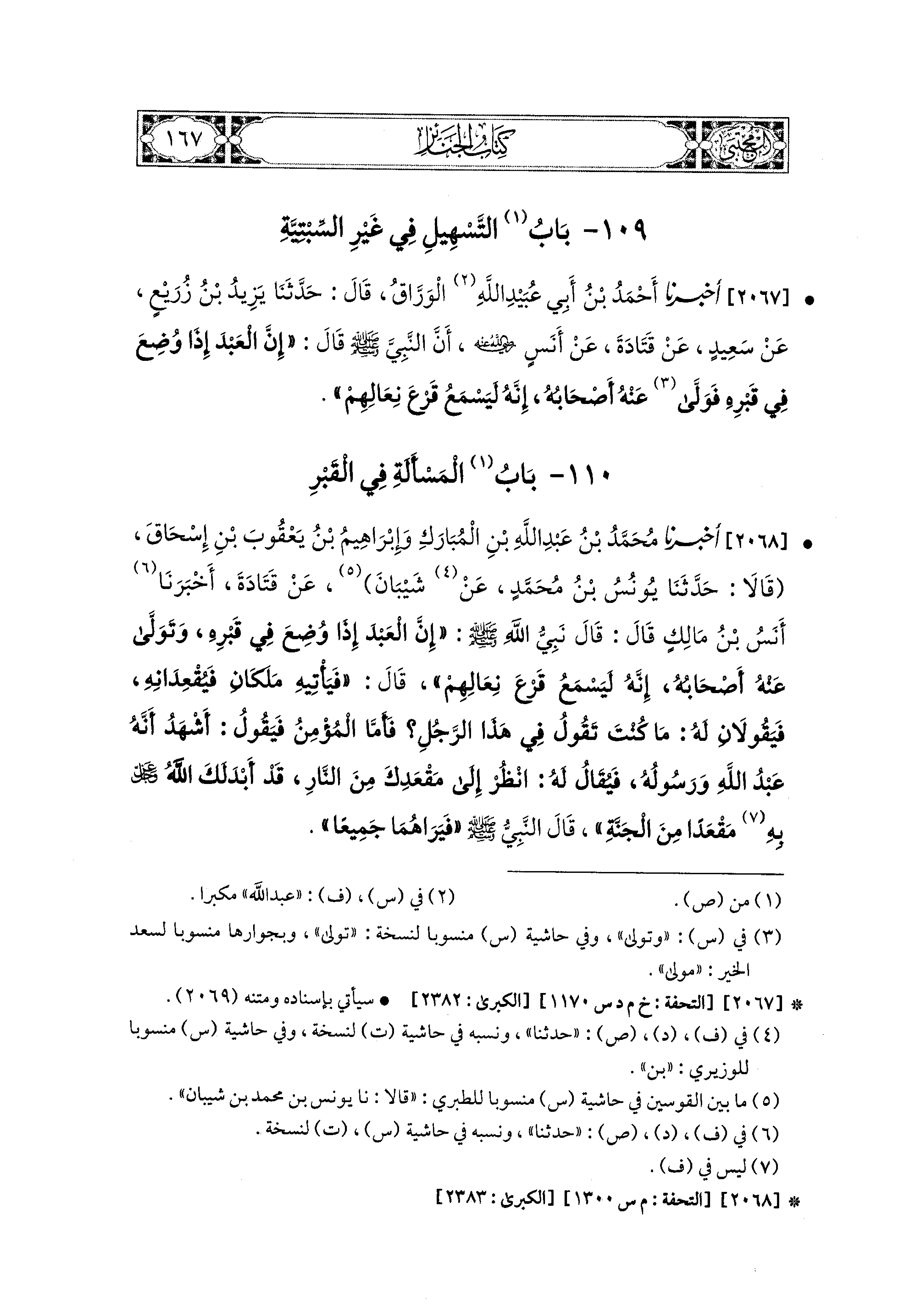 2067- أَخبَرَنا أَحْمَدُ بْنُ أَبي عُبَيدِ اللهِ الوَرَّاقُ، قال: حَدثنا يَزِيدُ بْنُ زُرَيْعٍ، عَن سَعيدٍ، عَن قَتَادَةَ، عَن أَنَسٍ رَضِيَ اللهُ عَنْهُ، أَنَّ النَّبيَّ صَلى الله عَليه وسَلم قَالَ: إِنَّ العَبدَ إِذَا وُضِعَ فِي قَبْرِهِ فولى عَنهُ أَصْحَابُهُ إِنَّهُ لَيَسْمَعُ قَرْعَ نِعَالِهِمْ.