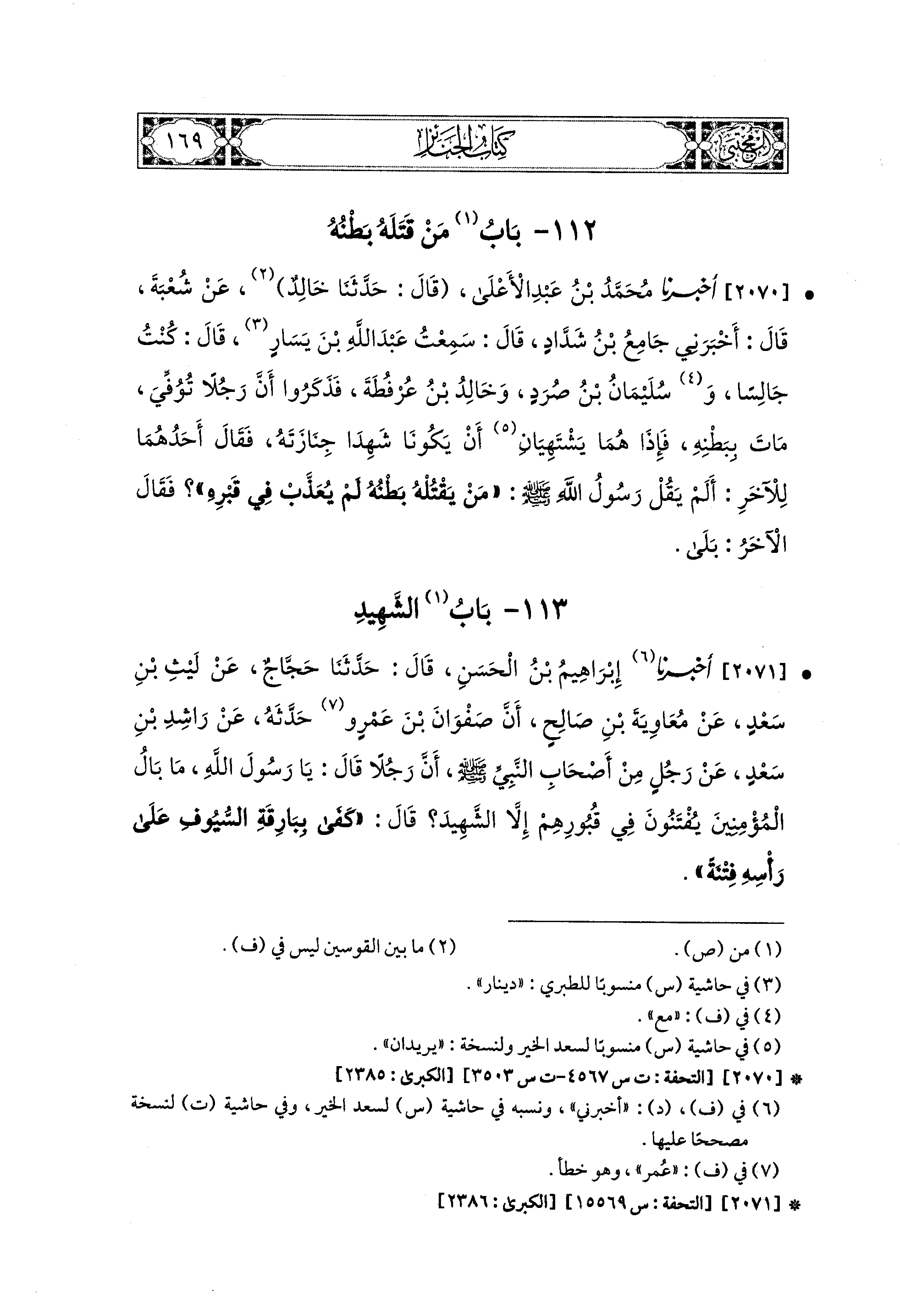 2070- أَخبَرَنا مُحَمد بن عَبدِ الأَعلَى، قال: حَدثنا خَالِدٌ، عَن شُعبَةَ، قَالَ: أَخبَرني جَامِعُ بْنُ شَدَّادٍ، قَالَ: سَمِعْتُ عَبدَ اللهِ بْنَ يَسَارٍ، قَالَ: كُنْتُ جَالِسًا وَسُلَيمَانُ بْنُ صُرَدٍ وخَالِدُ بْنُ عُرْفُطَةَ، فَذَكَرُوا أَنَّ رَجُلاً تُوُفِّيَ مَاتَ بِبَطْنِهِ، فَإِذَا هُمَا يَشْتَهِيَانِ أَنْ يَكُونَا شهَدَا جَنَازَتِهِ، فَقَالَ أَحَدُهُمَا لِلآخَرِ: أَلَمْ يَقُلْ رَسُولُ اللهِ صَلى الله عَليه وسَلم: مَنْ يَقْتُلْهُ بَطْنُهُ، لَم يُعَذَّبَ فِي قَبْرِهِ؟ فَقَالَ الآخَرُ: بَلَى.