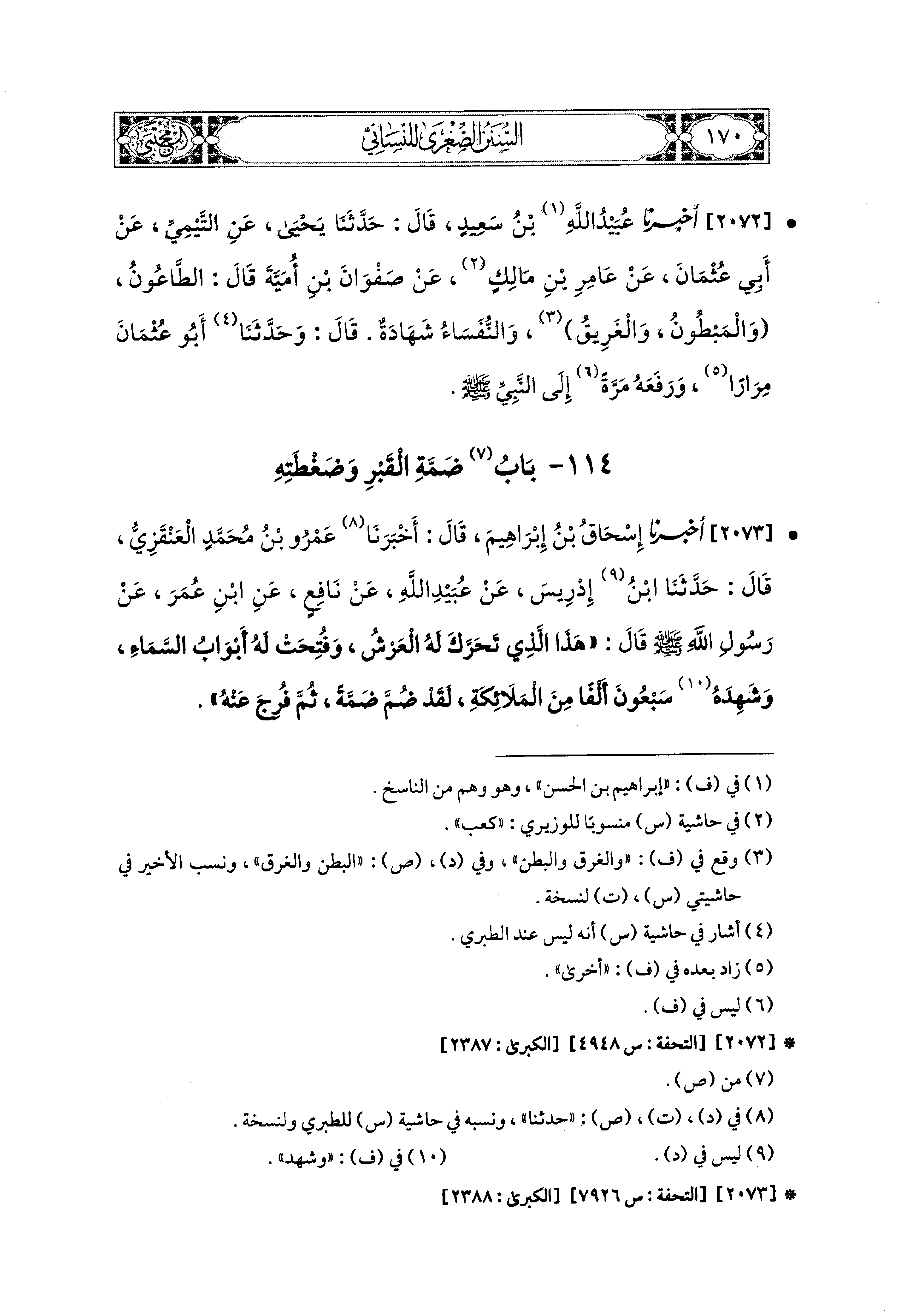 2073- أَخبَرَنا إِسحَاقُ بْنُ إِبراهِيمَ، قال: أَخبَرَنا عَمْرُو بْنُ مُحَمدٍ العَنقَزِيُّ، قال: حَدثنا ابنُ إِدْرِيسَ، عَن عُبَيدِ اللهِ، عَن نَافِعٍ، عَنِ ابنِ عُمَرَ، عَن رَسُولِ اللهِ صَلى الله عَليه وسَلم قَالَ: هَذَا الَّذِي تَحَرَّكَ لَهُ العَرْشُ، وَفُتِحَتْ لَهُ أَبْوَابُ السَّمَاءِ، وَشَهِدَهُ سَبْعُونَ أَلْفًا مِنَ المَلاَئِكَةِ، لَقَدْ ضُمَّ ضَمَّةً، ثُمَّ فُرِّجَ عَنهُ.