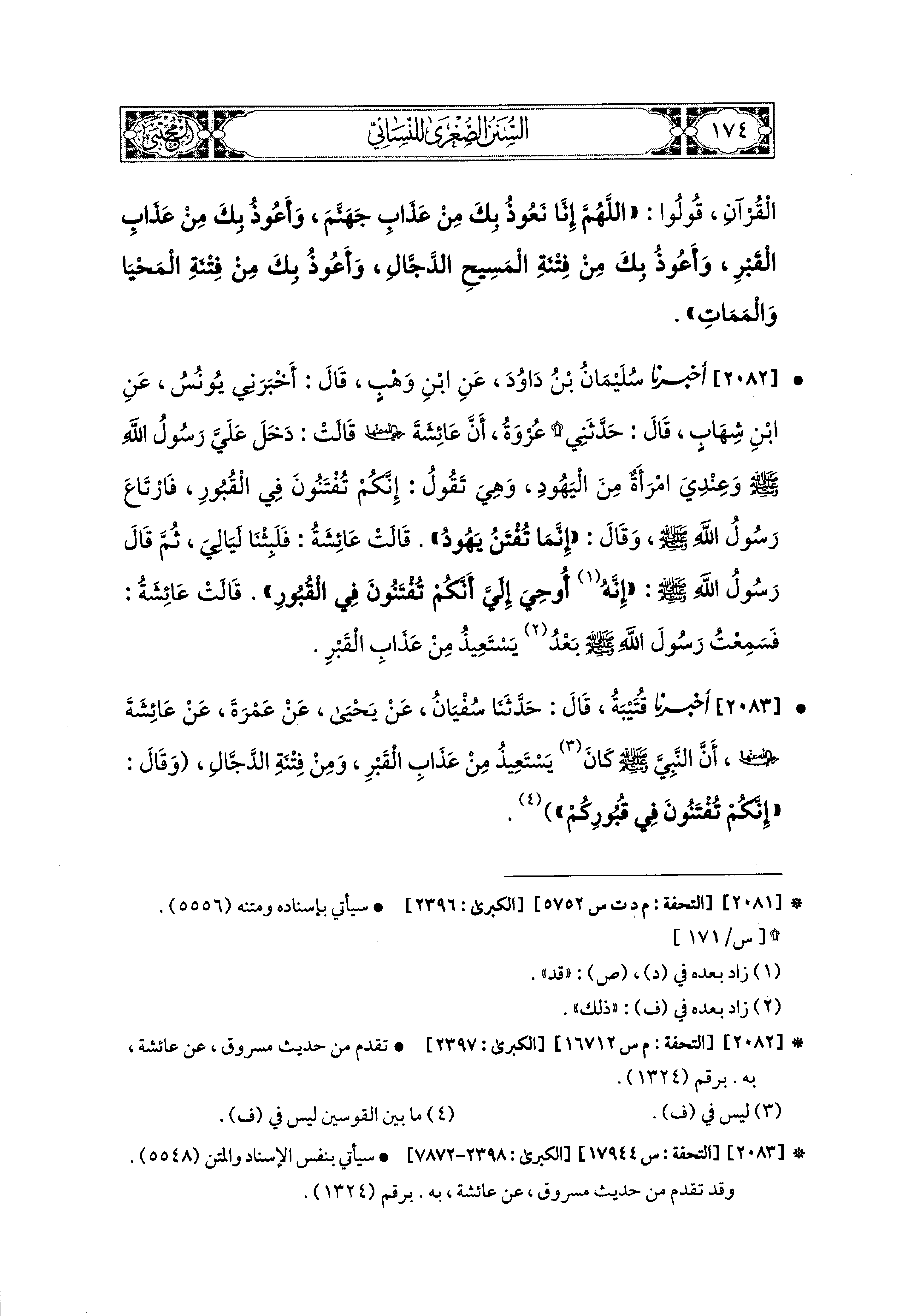 2083- أَخبَرَنا قُتَيبَةُ، قال: حَدثنا سُفيَانُ، عَن يَحيَى، عَن عَمْرَةَ، عَن عَائِشَةَ رَضِيَ اللهُ عَنْهَا، أَنَّ النَّبيَّ صَلى الله عَليه وسَلم كَانَ يَسْتَعِيذُ مِنْ عَذَابِ القَبْرِ، وَمِنْ فِتْنَةِ الدَّجَّالِ، وَقَالَ: إِنَّكُمْ تُفْتَنُونَ فِي قُبُورِكُمْ.