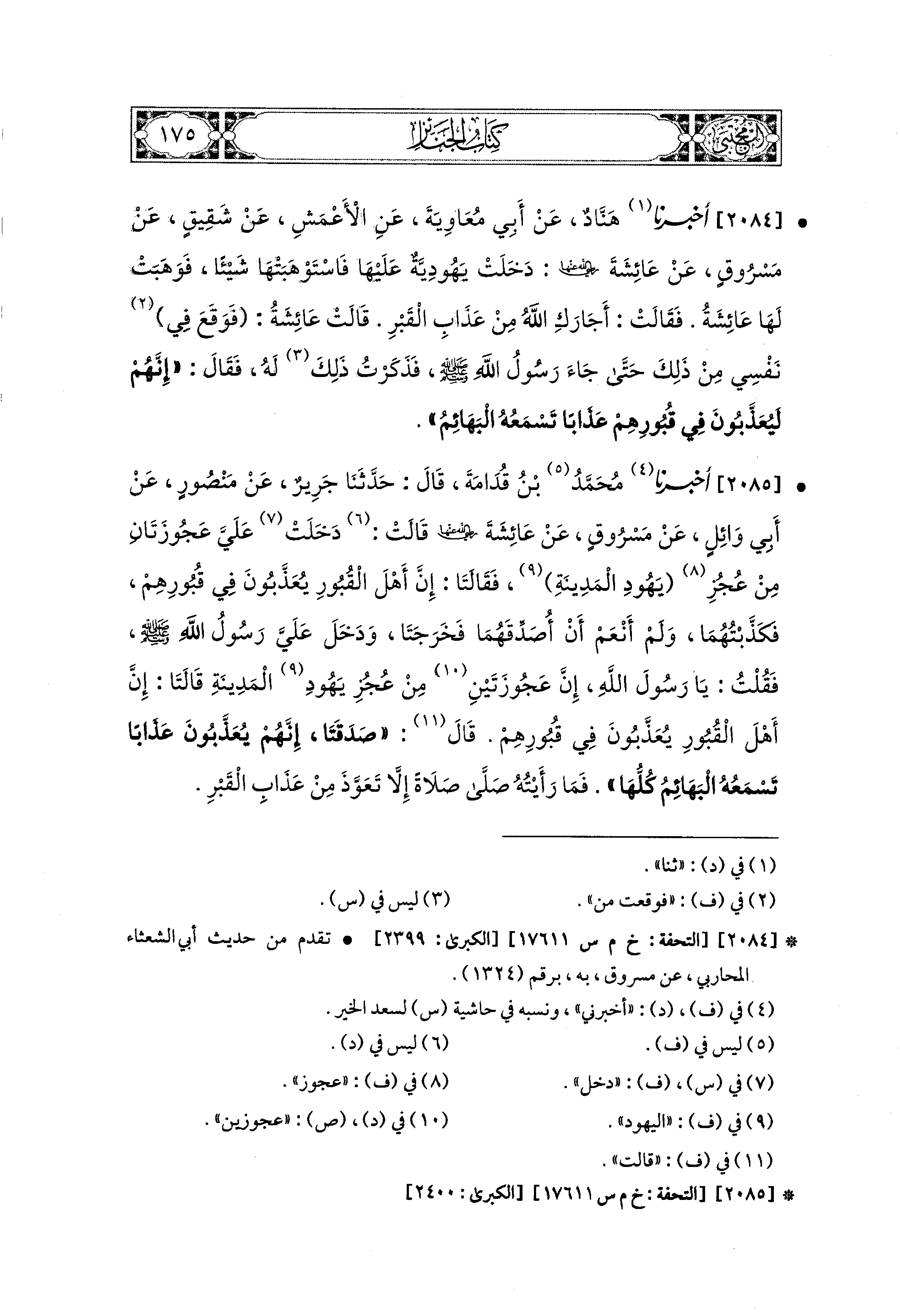 2085- أَخبَرَنا مُحَمد بْنُ قُدَامَةَ، قال: حَدثنا جَرِيرٌ، عَن مَنْصُورٍ، عَن أَبي وَائِلٍ، عَن مَسْرُوقٍ، عَن عَائِشَةَ رَضِيَ اللهُ عَنْهَا قَالَتْ: دَخَلَتْ عَلَيَّ عَجُوزَتَانِ مِنْ عُجُزِ يَهُودِ المَدِينَةِ، فَقَالَتَا: إِنَّ أَهْلَ القُبُورِ يُعَذَّبُونَ فِي قُبُورِهِمْ، فَكَذَّبْتُهُمَا وَلَمْ أَنْعَمْ أَنْ أُصَدِّقَهُمَا، فَخَرَجَتَا وَدَخَلَ عَلَيَّ رَسُولُ اللهِ صَلى الله عَليه وسَلم، فَقُلْتُ: يَا رَسُولَ اللهِ، إِنَّ عَجُوزَتَيْنِ مِنْ عُجُزِ يَهُودِ المَدِينَةِ قَالَتَا: إِنَّ أَهْلَ القُبُورِ يُعَذَّبُونَ فِي قُبُورِهِمْ، قَالَ: صَدَقَتَا، إِنَّهُمْ يُعَذَّبُونَ عَذَابًا تَسْمَعُهُ البَهَائِمُ كُلُّهَا، فَمَا رَأَيْتُهُ صَلَّى صَلاَةً إِلاَّ تَعَوَّذَ مِنْ عَذَابِ القَبْرِ.