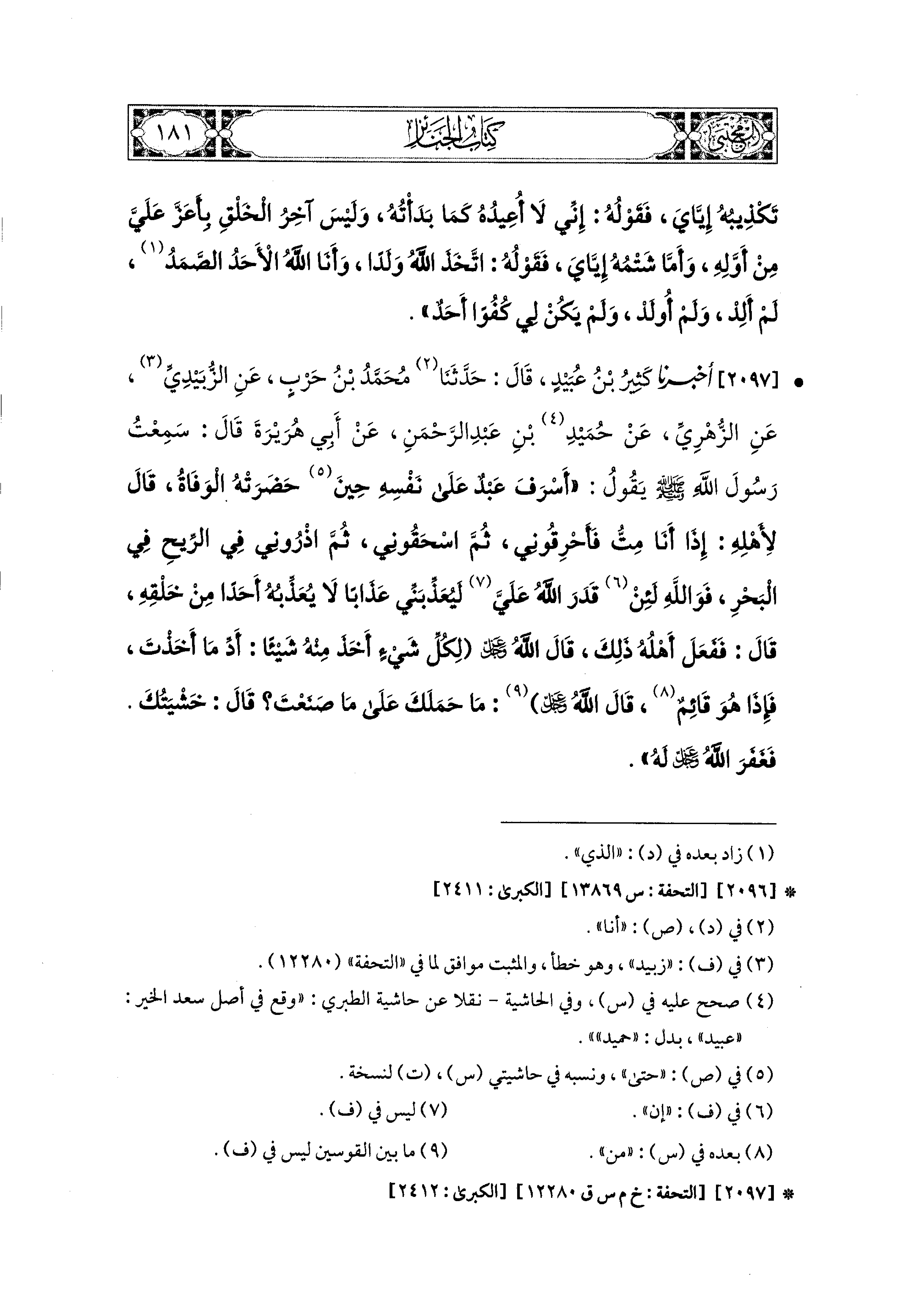 2097- أَخبَرَنا كَثِيرُ بْنُ عُبَيدٍ، قال: حَدثنا مُحَمدُ بْنُ حَرْبٍ، عَنِ الزُّبَيْدِيِّ، عَنِ الزُّهْرِيِّ، عَن حُمَيدِ بْنِ عَبدِ الرَّحمَنِ، عَن أَبي هُرَيرَةَ، قَالَ: سَمِعْتُ رَسُولَ اللهِ صَلى الله عَليه وسَلم يَقُولُ: أَسْرَفَ عَبدٌ عَلَى نَفْسِهِ حين حَضَرَتْهُ الوَفَاةُ، قَالَ لأَهْلِهِ: إِذَا أَنَا مُتُّ فَأَحْرِقُوني، ثُمَّ اسْحَقُوني، ثُمَّ اذْرُوني فِي الرِّيحِ فِي البَحْرِ، فَوَالله لَئِنْ قَدَرَ اللهُ عَلَيَّ لَيُعَذِّبَنِّي عَذَابًا لاَ يُعَذِّبُهُ أَحَدًا مِنْ خَلْقِهِ، قَالَ: فَفَعَلَ أَهْلُهُ ذَلِكَ، قَالَ اللهُ عَزَّ وَجَلَّ لِكُلِّ شَيْءٍ أَخَذَ مِنْهُ شَيْئًا: أَدِّ مَا أَخَذْتَ، فَإِذَا هُوَ قَائِمٌ، قَالَ اللهُ عَزَّ وَجَلَّ: مَا حَمَلَكَ عَلَى مَا صَنَعْتَ؟ قَالَ: خَشْيَتُكَ، فَغَفَرَ اللهُ عَزَّ وَجَلَّ لَهُ.