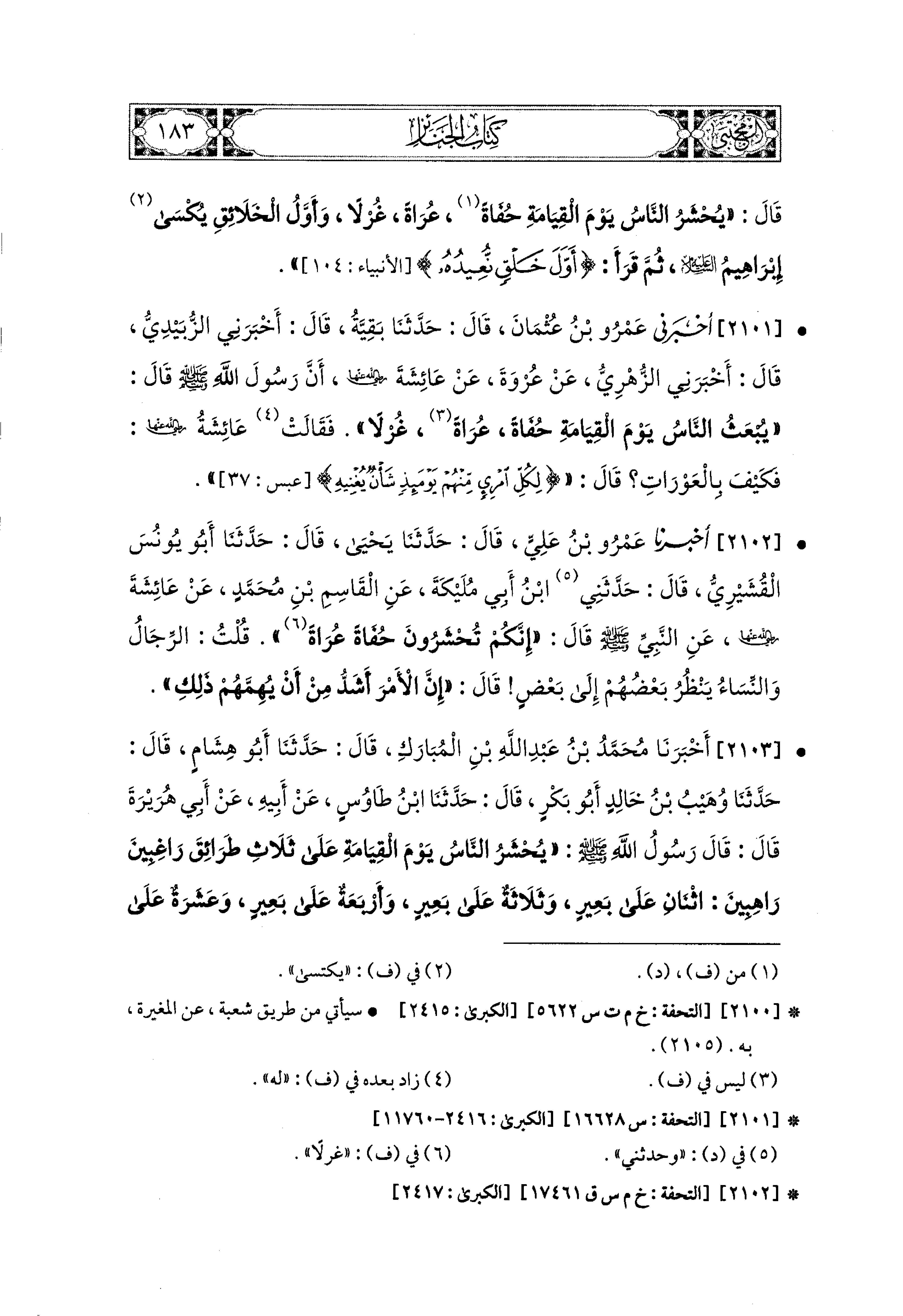 2101- أَخبَرني عَمْرُو بْنُ عُثمَانَ، قال: حَدثنا بَقِيَّةُ، قَالَ: أَخبَرني الزُّبَيْدِيُّ، قَالَ: أَخبَرني الزُّهْرِيُّ، عَن عُرْوَةَ، عَن عَائِشَةَ رَضِيَ اللهُ عَنْهَا، أَنَّ رَسُولَ اللهِ صَلى الله عَليه وسَلم قَالَ: يُبْعَثُ النَّاسُ يَوْمَ القِيَامَةِ حُفَاةً عُرَاةً غُرْلاً، فَقَالَتْ عَائِشَةُ رَضِيَ اللهُ عَنْهَا: فَكَيْفَ بِالعَوْرَاتِ؟ قَالَ: {لِكُلِّ امْرِئٍ مِنْهُمْ يَوْمَئِذٍ شَأْنٌ يُغْنيهِ}.