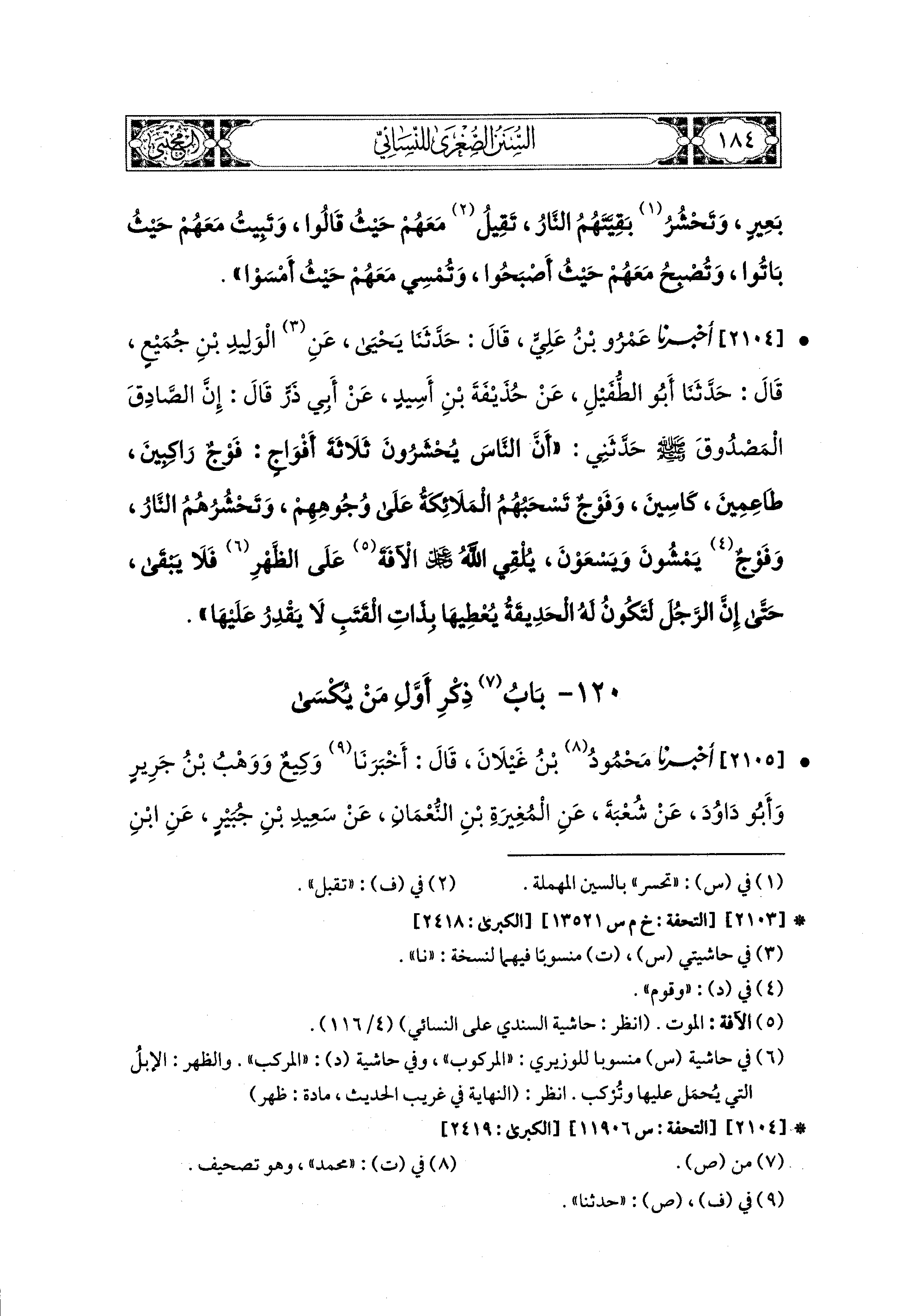 2104- أَخبَرَنا عَمْرُو بْنُ عَلِيٍّ، قال: حَدثنا يَحيَى، عَنِ الوَلِيدِ بْنِ جُمَيْعٍ، قال: حَدثنا أَبو الطُّفَيْلِ، عَن حُذَيفَةَ بْنِ أَسِيدٍ، عَن أَبي ذَرٍّ قَالَ: إِنَّ الصَّادِقَ المَصْدُوقَ صَلى الله عَليه وسَلم حَدَّثَني؛ أَنَّ النَّاسَ يُحْشَرُونَ ثَلاَثَةَ أَفْوَاجٍ: فَوْجٌ رَاكِبِينَ طَاعِمينَ كَاسِينَ، وَفَوْجٌ تَسْحَبُهُمُ المَلاَئِكَةُ عَلَى وُجُوهِهِمْ وَتَحْشُرُهُمُ النَّارُ، وَفَوْجٌ يَمْشُونَ وَيَسْعَوْنَ يُلْقِي اللهُ عَزَّ وَجَلَّ الآفَةَ عَلَى الظَّهْرِ فَلاَ يَبْقَى، حَتَّى إِنَّ الرَّجُلَ لَتَكُونُ لَهُ الحَدِيقَةُ يُعْطِيهَا بِذَاتِ القَتَبِ لاَ يَقْدِرُ عَلَيهَا.
