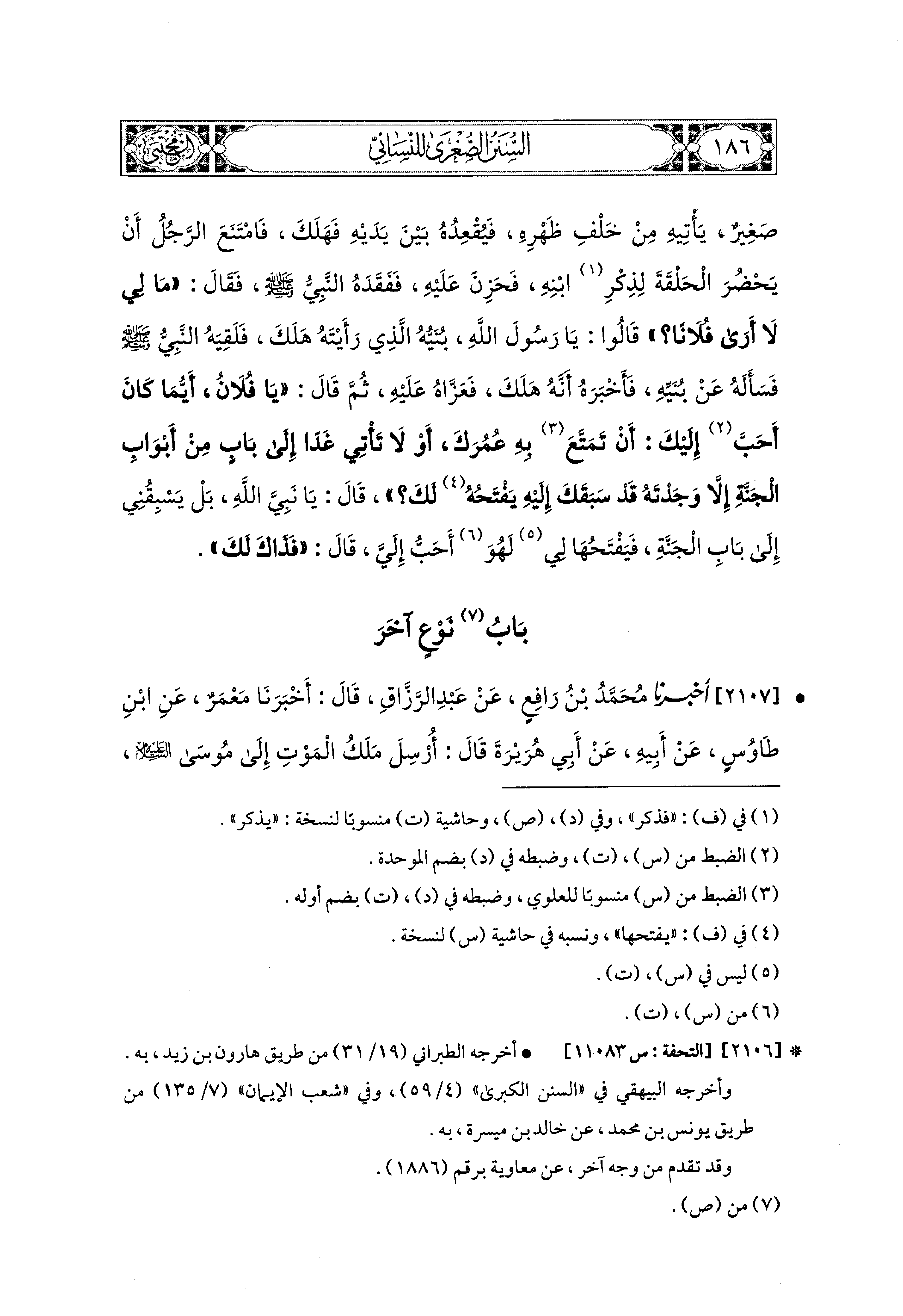 2107- أَخبَرَنا مُحَمد بْنُ رَافِعٍ، عَن عَبدِ الرَّزَّاقِ، قال: أَخبَرَنا مَعْمَرٌ، عَنِ ابنِ طَاوُوسٍ، عَن أَبيهِ، عَن أَبي هُرَيرَةَ قَالَ: أُرْسِلَ مَلَكُ المَوْتِ إِلَى مُوسَى عَلَيهِ السَّلاَمُ، فَلَمَّا جَاءَهُ صَكَّهُ، فَفَقَأَ عَيْنَهُ، فَرَجَعَ إِلَى رَبِّهِ، فَقَالَ: أَرْسَلْتَني إِلَى عَبدٍ لاَ يُرِيدُ المَوْتَ، فَرَدَّ اللهُ عَزَّ وَجَلَّ إِلَيْهِ عَيْنَهُ، وَقَالَ: ارْجِعْ إِلَيْهِ، فَقُلْ لَهُ يَضَعُ يَدَهُ عَلَى مَتْنِ ثَوْرٍ، فَلَهُ بِكُلِّ مَا غَطَّتْ يَدُهُ بِكُلِّ شَعْرَةٍ سَنَةٌ، قَالَ: أَيْ رَبِّ، ثُمَّ مَهْ؟ قَالَ: المَوْتُ، قَالَ: فَالآنَ، فَسَأَلَ اللهَ عَزَّ وَجَلَّ أَنْ يُدْنيَهُ مِنَ الأَرضِ المُقَدَّسَةِ رَمْيَةً بِحَجَرٍ، قَالَ رَسُولُ اللهِ صَلى الله عَليه وسَلم: فَلَوْ كُنْتُ ثَمَّ، لأَرَيْتُكُمْ قَبْرَهُ إِلَى جَانِبِ الطَّرِيقِ تَحْتَ الكَثِيبِ الأَحْمَرِ.
