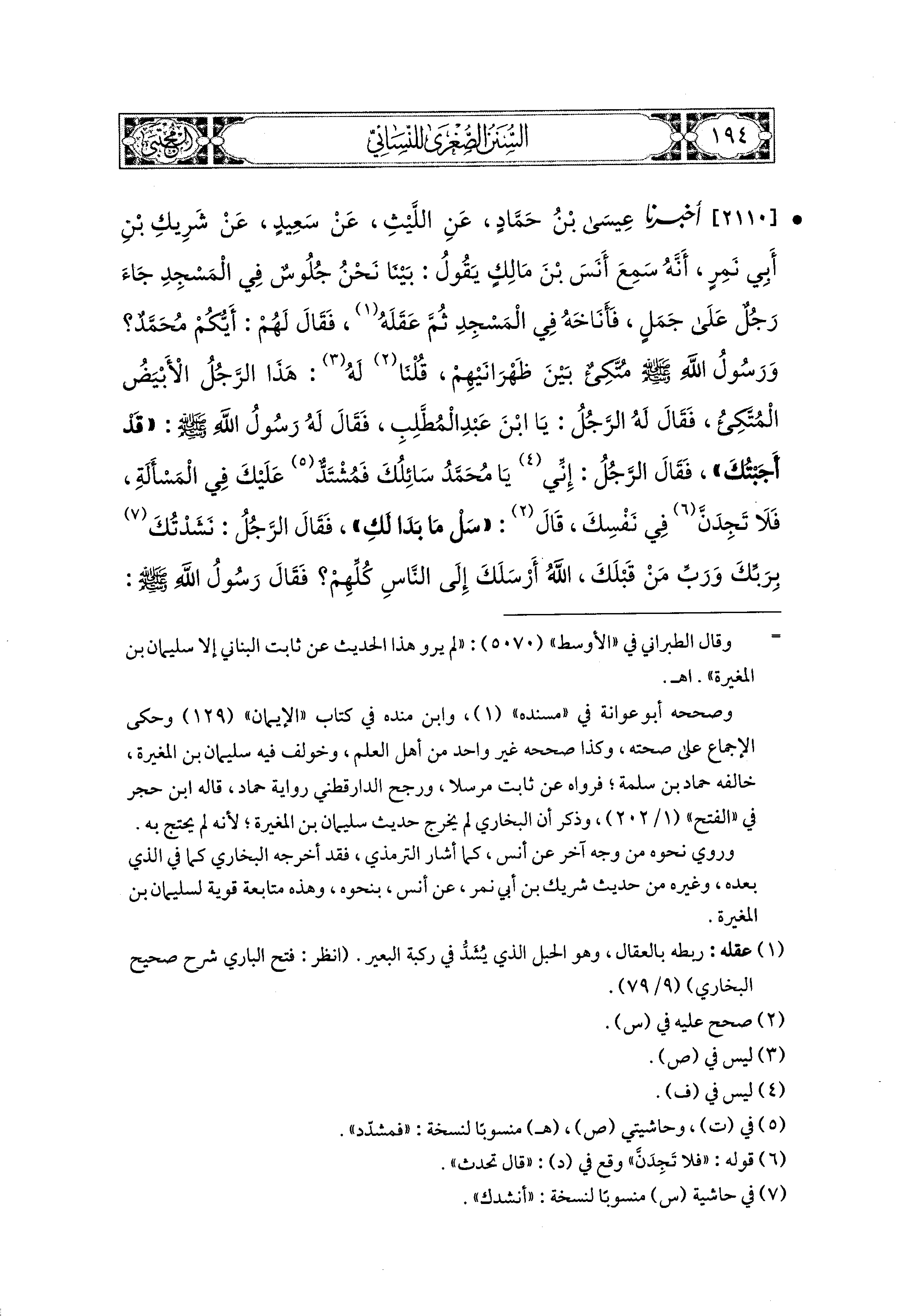 2110- أَخبَرَنا عِيسَى بْنُ حَمَّادٍ، عَنِ اللَّيْثِ، عَن سَعيدٍ، عَن شَرِيكِ بْنِ أَبي نَمِرٍ، أَنَّهُ سَمِعَ أَنَسَ بْنَ مَالِكٍ يَقُولُ: بَيْنَا نَحْنُ جُلُوسٌ فِي المَسْجِدِ جَاءَ رَجُلٌ عَلَى جَمَلٍ فَأَنَاخَهُ فِي المَسْجِدِ، ثُمَّ عَقَلَهُ، فَقَالَ لَهُمْ: أَيُّكُمْ مُحَمدٌ؟ وَرَسُولُ اللهِ صَلى الله عَليه وسَلم مُتَّكِئٌ بَيْنَ ظَهْرَانَيْهِمْ، قُلْنَا لَهُ: هَذَا الرَّجُلُ الأَبْيَضُ المُتَّكِئُ، فَقَالَ لَهُ الرَّجُلُ: يَا ابنَ عَبدِ المُطَّلِبِ، فَقَالَ لَهُ رَسُولُ اللهِ صَلى الله عَليه وسَلم: قَدْ أَجَبْتُكَ، فَقَالَ الرَّجُلُ: إِنِّي يَا مُحَمدُ سَائِلُكَ، فَمُشَتدِّ عَلَيْكَ فِي المَسْأَلَةِ، فَلاَ تَجِدَنَّ فِي نَفْسِكَ، قَالَ: سَلْ مَا بَدَا لَكَ، فَقَالَ الرَّجُلُ: نَشَدْتُكَ بِرَبِّكَ، وَرَبِّ مَنْ قَبْلَكَ، اللهُ أَرْسَلَكَ إِلَى النَّاسِ كُلِّهِمْ؟ فَقَالَ رَسُولُ اللهِ صَلى الله عَليه وسَلم: اللهُمَّ نَعَمْ، قَالَ: فَأَنْشُدُكَ اللهَ، اللهُ أَمَرَكَ أَنْ نُصَلِّيَ الصَّلَوَاتِ الخَمْسَ فِي اليَوْمِ وَاللَّيلَةِ؟ قَالَ رَسُولُ اللهِ صَلى الله عَليه وسَلم: اللهُمَّ نَعَمْ، قَالَ: فَأَنْشُدُكَ اللهَ، اللهُ أَمَرَكَ أَنْ نَصُومَ الشَّهْرَ مِنَ السَّنَةِ؟ قَالَ رَسُولُ اللهِ صَلى الله عَليه وسَلم: اللهُمَّ نَعَمْ، قَالَ: فَأَنْشُدُكَ اللهَ، اللهُ أَمَرَكَ أَنْ تَأْخُذَ هَذِهِ الصَّدَقَةَ مِنْ أَغْنيَائِنَا فَتَقْسِمَهَا عَلَى فُقَرَائِنَا؟ فَقَالَ رَسُولُ اللهِ صَلى الله عَليه وسَلم: اللهُمَّ نَعَمْ، فَقَالَ الرَّجُلُ: آمَنْتُ بِمَا جِئْتَ بِهِ، وَأَنَا رَسُولُ مَنْ وَرَائِي مِنْ قَوْمي، وَأَنَا ضِمَامُ بْنُ ثَعْلَبَةَ، أَخُو بَني سَعْدِ بْنِ بَكْرٍ.