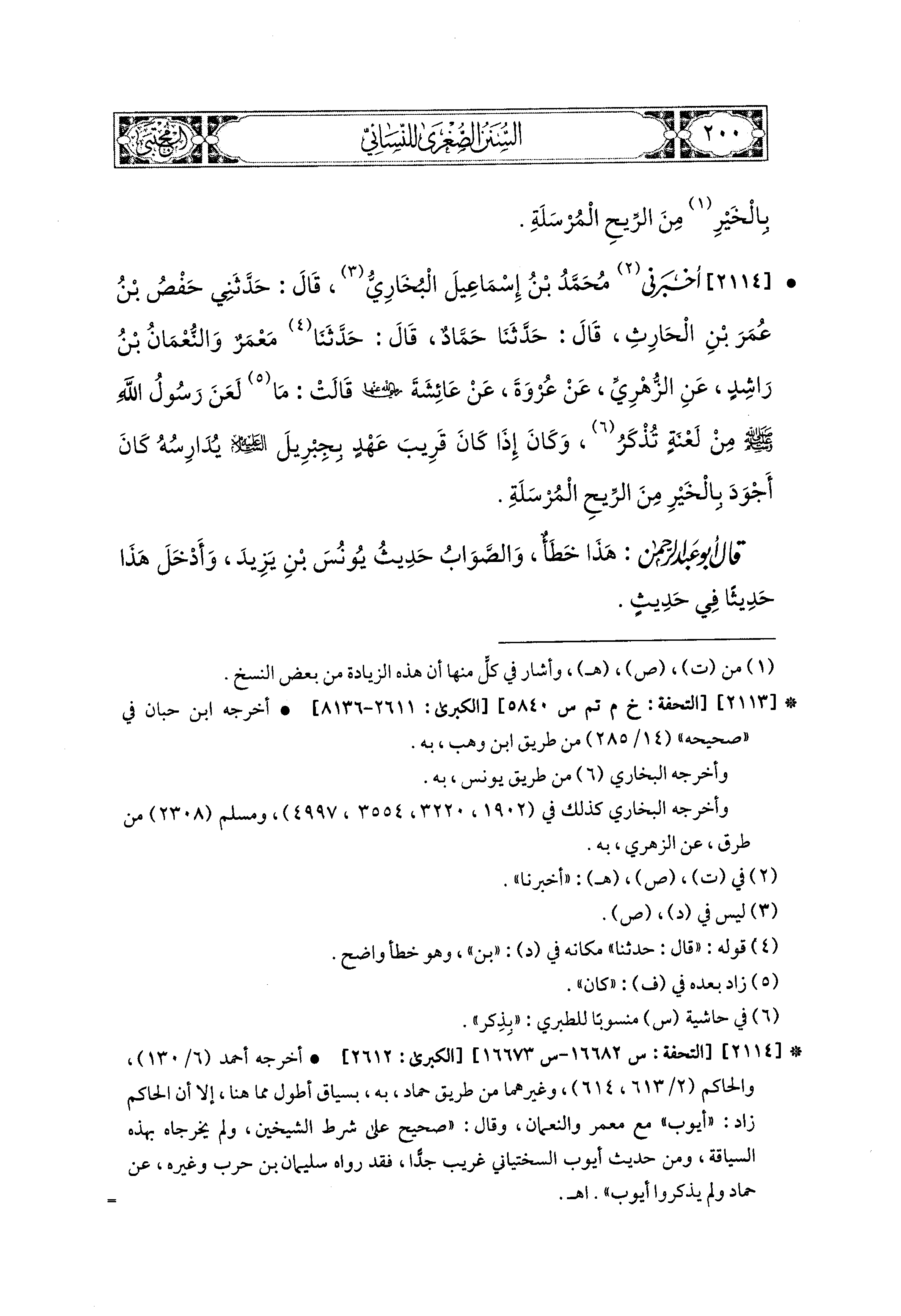 2114- أَخبَرَنا مُحَمد بْنُ إِسماعِيلَ (1)، قَالَ: حَدَّثَني حَفْصُ بْنُ عُمَرَ بْنِ الحَارِثِ، قال: حَدثنا حَمَّادٌ، قال: حَدثنا مَعْمَرٌ، وَالنُّعْمَانُ بْنُ رَاشِدٍ، عَنِ الزُّهْرِيِّ، عَن عُرْوَةَ، عَن عَائِشَةَ رَضِيَ اللهُ عَنْهَا قَالَتْ: مَا لَعَنَ رَسُولُ اللهِ صَلى الله عَليه وسَلم مِنْ لَعْنَةٍ تُذْكَرُ، وكَانَ إِذَا كَانَ قَرِيبَ عَهْدٍ بِجِبْرِيلَ عَلَيهِ السَّلاَمُ يُدَارِسُهُ، كَانَ أَجْوَدَ بِالخَيْرِ مِنَ الرِّيحِ المُرْسَلَةِ.