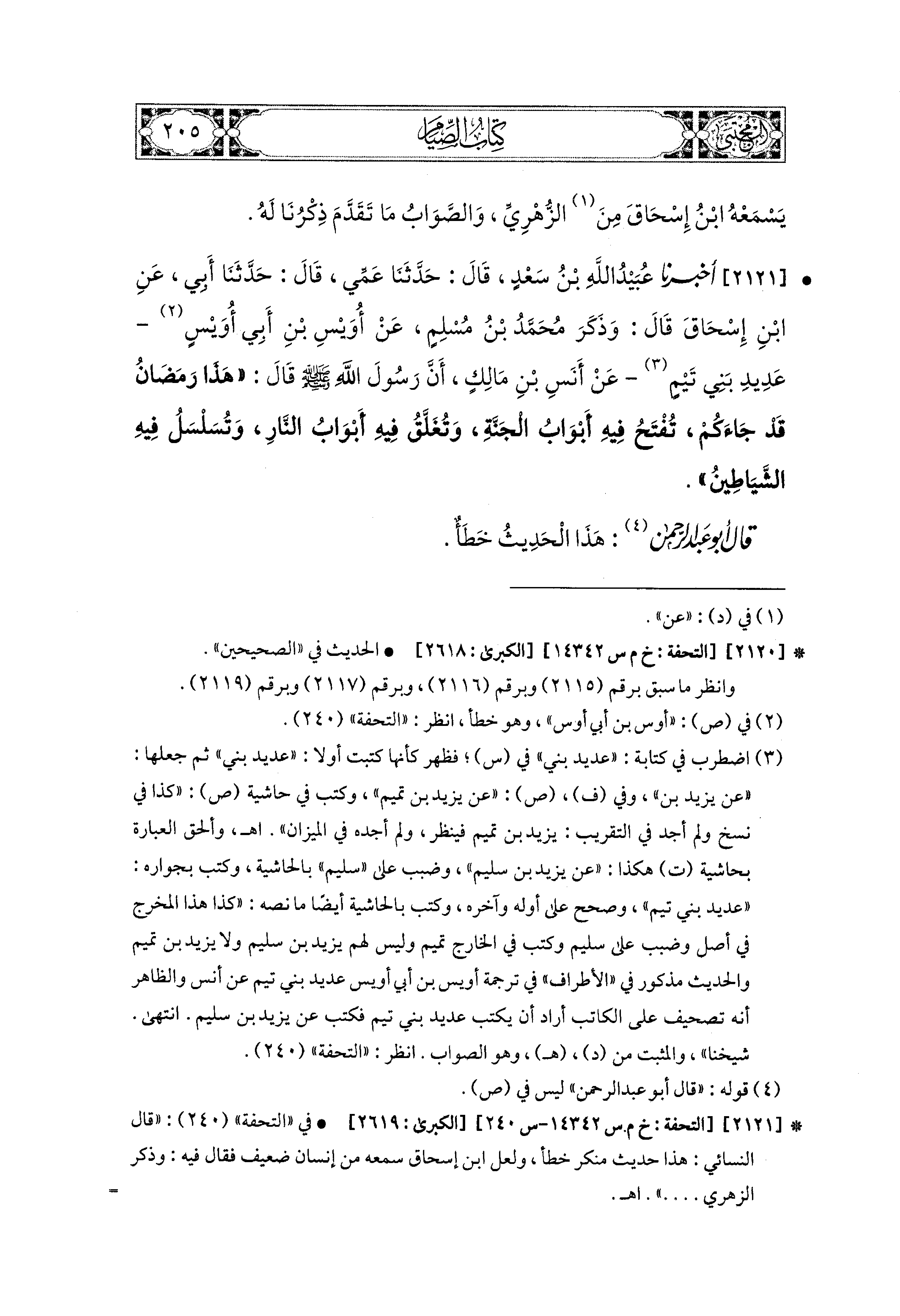 2121- أَخبَرَنا عُبَيدُ اللهِ بْنُ سَعْدٍ، قال: حَدثنا عَمِّي، قال: حَدثنا أَبي، عَنِ ابنِ إِسحَاقَ، قَالَ: وَذَكَرَ مُحَمدُ بْنُ مُسْلِمٍ، عَن أُوَيْسِ بْنِ أَبي أُوَيْسٍ، عَدِيدِ بَني تَيْمٍ، عَن أَنَسِ بْنِ مَالِكٍ، أَنَّ رَسُولَ اللهِ صَلى الله عَليه وسَلم قَالَ: هَذَا رَمَضَانُ قَدْ جَاءَكُمْ، تُفَتَّحُ فِيهِ أَبْوَابُ الجَنَّةِ، وَتُغَلَّقُ فِيهِ أَبْوَابُ النَّارِ، وَتُسَلْسَلُ فِيهِ الشَّيَاطِينُ.