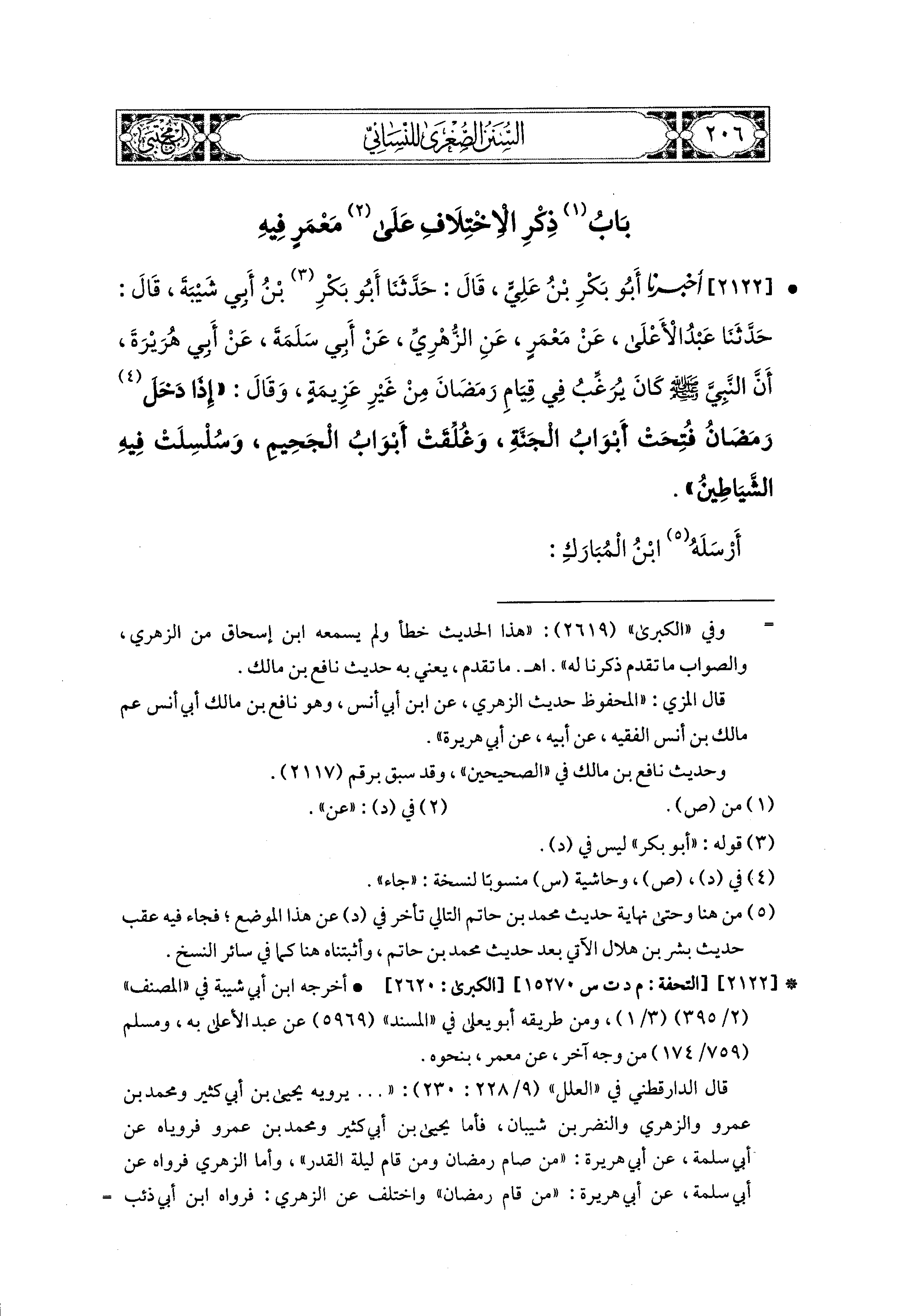 2122- أَخبَرَنا أَبو بَكْرِ بْنُ عَلِيٍّ، قال: حَدثنا أَبو بَكْرِ بْنُ أَبي شَيْبَةَ، قال: حَدثنا عَبدُ الأَعْلَى، عَن مَعْمَرٍ، عَنِ الزُّهْرِيِّ، عَن أَبي سَلَمَةَ، عَن أَبي هُرَيرَةَ، أَنَّ النَّبيَّ صَلى الله عَليه وسَلم كَانَ يُرَغِّبُ فِي قِيَامِ رَمَضَانَ مِنْ غَيْرِ عَزِيمَةٍ، وَقَالَ: إِذَا دَخَلَ رَمَضَانُ فُتِّحَتْ أَبْوَابُ الجَنَّةِ، وَغُلِّقَتْ أَبْوَابُ الجَحِيمِ، وَسُلْسِلَتْ فِيهِ الشَّيَاطِينُ.