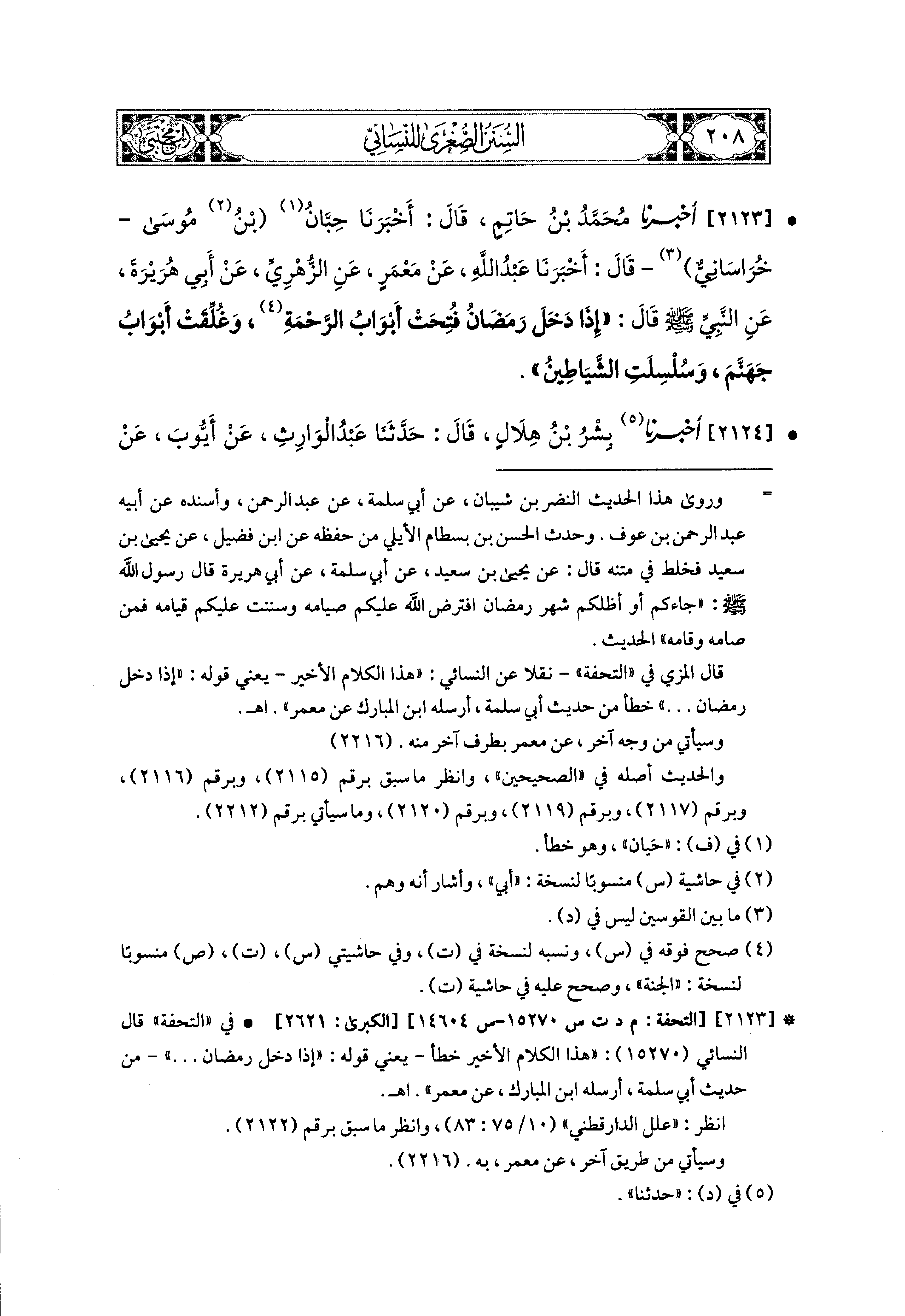 2123- أَخبَرَنا مُحَمد بْنُ حَاتِمٍ، قَالَ: أَخبَرنا حِبَّانُ بْنُ مُوسَى خُرَاسَانيٌّ، قَالَ: أَخبَرنا عَبدُ اللهِ، عَن مَعْمَرٍ، عَنِ الزُّهْرِيِّ، عَن أَبي هُرَيرَةَ، عَنِ النَّبيِّ صَلى الله عَليه وسَلم قَالَ: إِذَا دَخَلَ رَمَضَانُ، فُتِحَتْ أَبْوَابُ الرَّحْمَةِ، وَغُلِّقَتْ أَبْوَابُ جَهَنَّمَ، وَسُلْسِلَتِ الشَّيَاطِينُ.