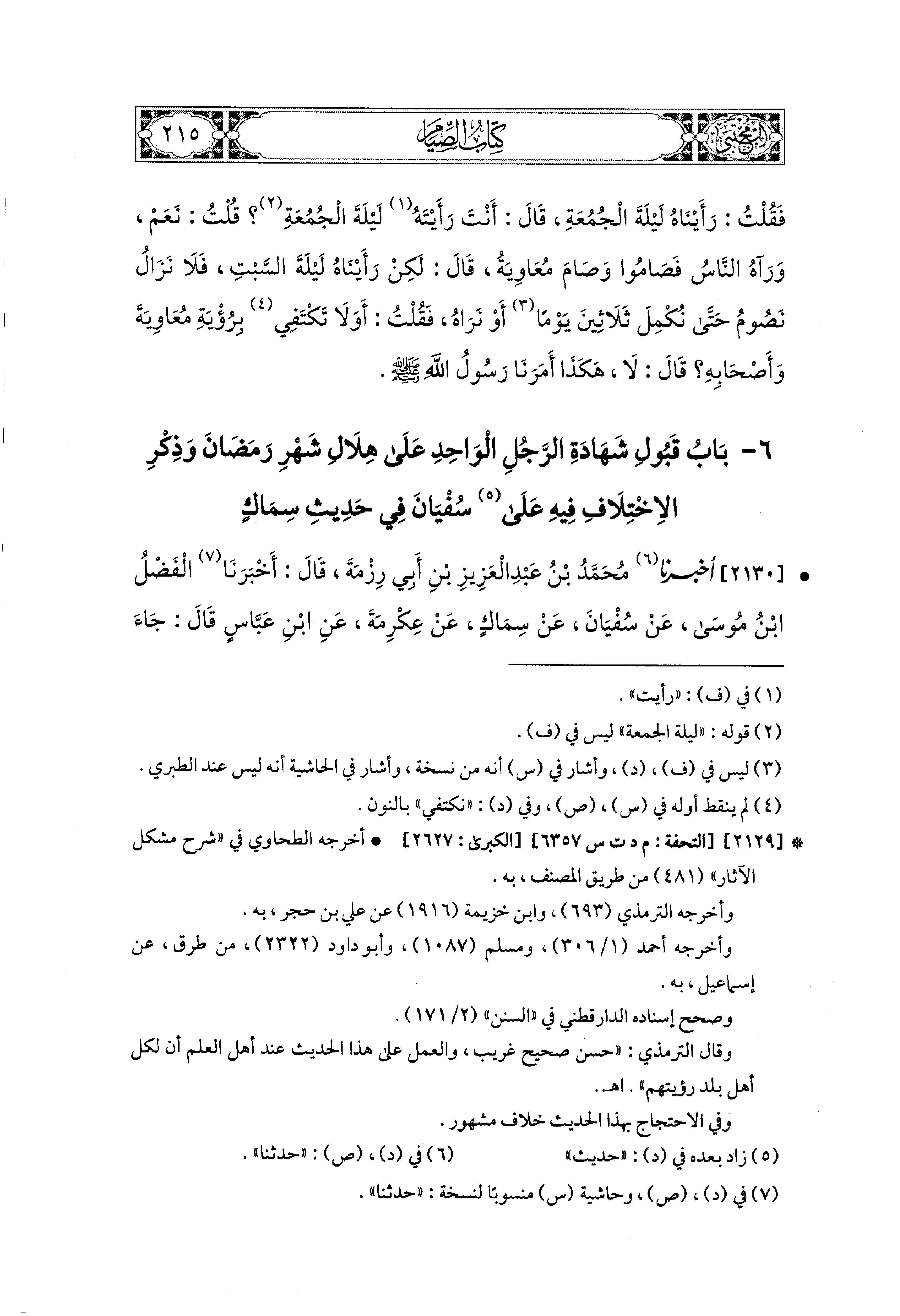 2130- أَخبَرَنا مُحَمد بْنُ عَبدِ العَزِيزِ بْنِ أَبي رِزْمَةَ، قَالَ: أَخبَرنا الفَضْلُ بْنُ مُوسَى، عَن سُفيَانَ، عَن سِمَاكٍ، عَن عِكْرِمَةَ، عَنِ ابنِ عَبَّاسٍ، قَالَ: جَاءَ أَعْرَابيٌّ إِلَى النَّبيِّ صَلى الله عَليه وسَلم فَقَالَ: رَأَيْتُ الهِلاَلَ، فَقَالَ: أَتَشْهَدُ أَنْ لاَ إِلَهَ إِلاَّ اللهُ وَأَنَّ مُحَمدًا عَبدُهُ وَرَسُولُهُ؟ قَالَ: نَعَمْ، فَنَادَى النَّبيُّ صَلى الله عَليه وسَلم: أَنْ صُومُوا.