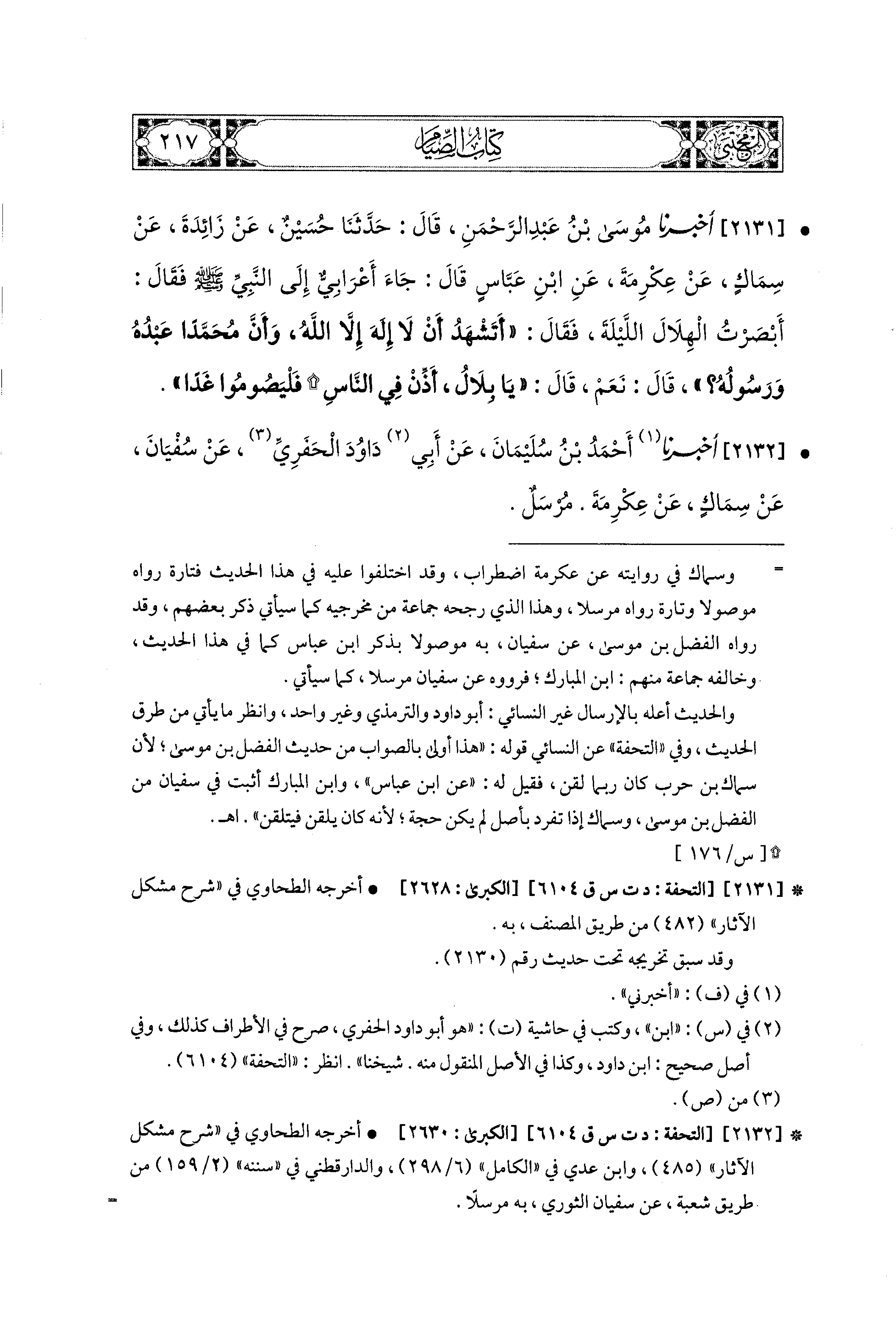 2131- أَخبَرَنا مُوسَى بْنُ عَبدِ الرَّحمَنِ، قال: حَدثنا حُسَيْنٌ، عَن زَائِدَةَ، عَن سِمَاكٍ، عَن عِكْرِمَةَ، عَنِ ابنِ عَبَّاسٍ، قَالَ: جَاءَ أَعْرَابيٌّ إِلَى النَّبيِّ صَلى الله عَليه وسَلم فَقَالَ: أَبْصَرْتُ الهِلاَلَ اللَّيلَةَ، فقَالَ: أَتَشْهَدُ أَنْ لاَ إِلَهَ إِلاَّ اللهُ وَأَنَّ مُحَمدًا عَبدُهُ وَرَسُولُهُ؟ قَالَ: نَعَمْ، قَالَ: يَا بِلاَلُ، أَذِّنْ فِي النَّاسِ فَلْيَصُومُوا غَدًا.