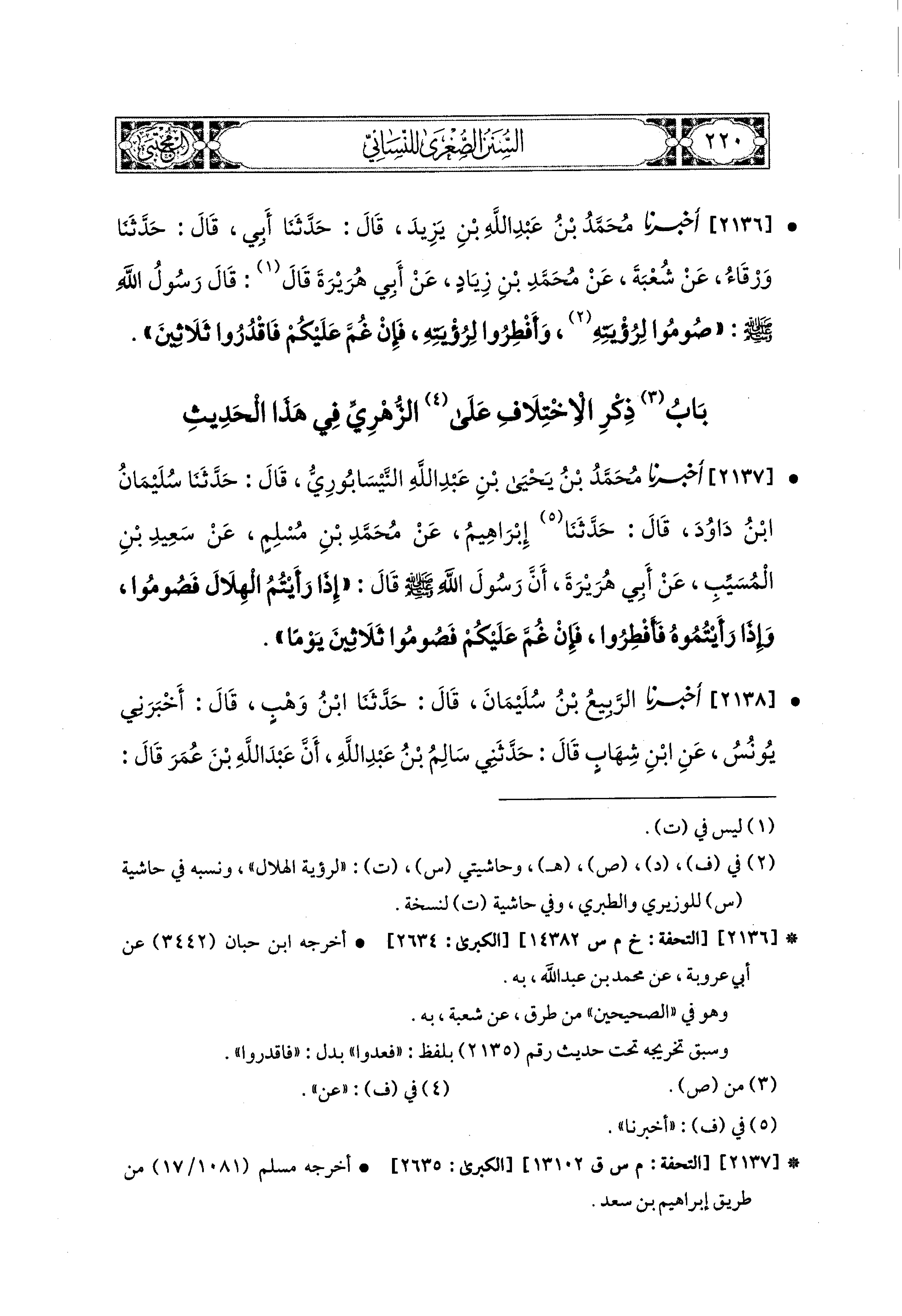 2136- أَخبَرَنا مُحَمد بْنُ عَبدِ اللهِ بْنِ يَزِيدَ، قال: حَدثنا أَبي، قال: حَدثنا وَرْقَاءُ، عَن شُعبَةَ، عَن مُحَمدِ بْنِ زِيَادٍ، عَن أَبي هُرَيرَةَ قَالَ: قَالَ رَسُولُ اللهِ صَلى الله عَليه وسَلم: صُومُوا لِرُؤْيَتِهِ، وَأَفْطِرُوا لِرُؤْيَتِهِ، فَإِنْ غُمَّ عَلَيْكُمْ فَاقْدِرُوا ثَلاَثِينَ.