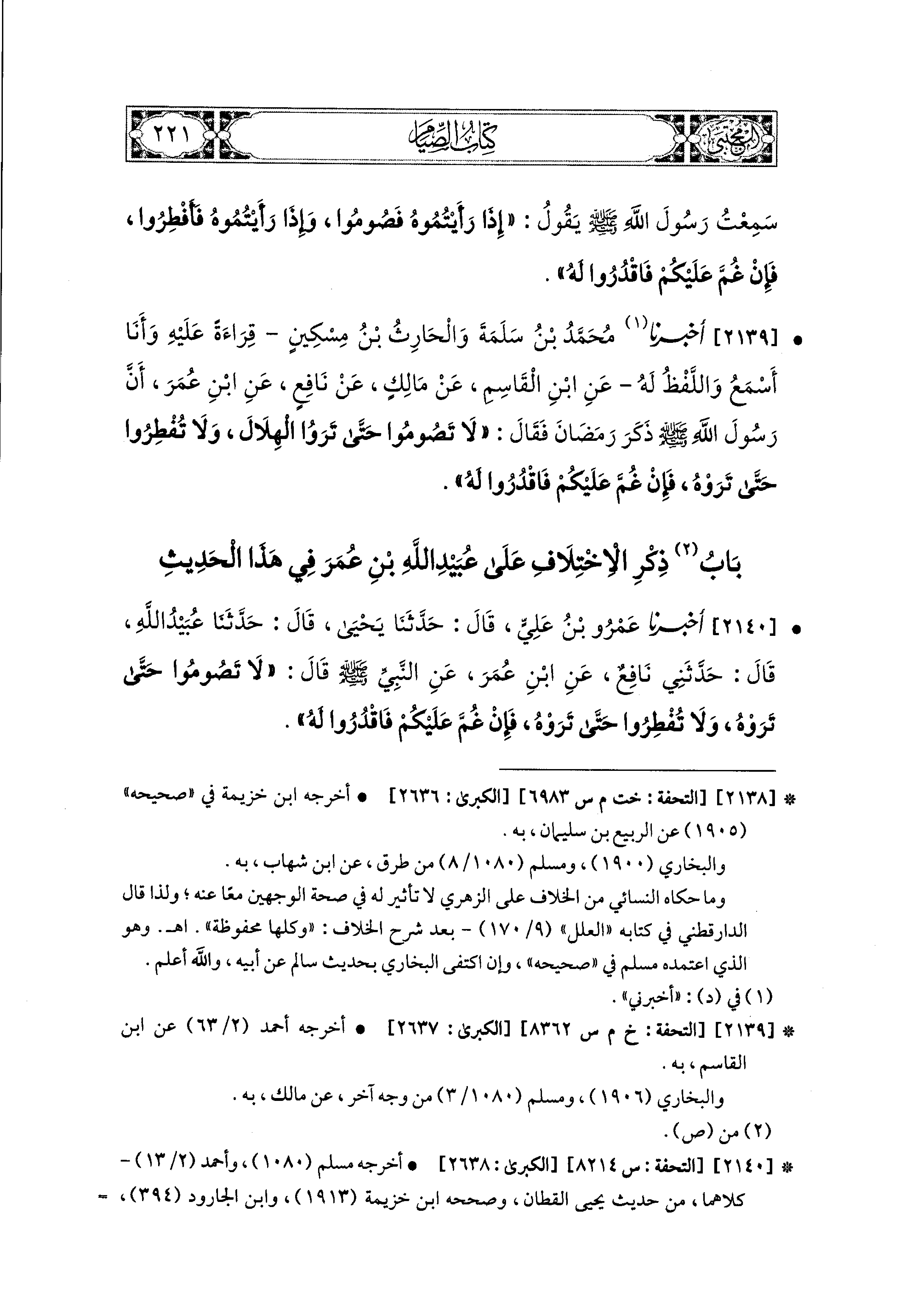 2139- أَخبَرَنا مُحَمد بْنُ سَلَمَةَ، وَالحَارِثُ بْنُ مِسكينٍ، قِرَاءَةً عَلَيهِ وَأَنَا أَسْمَعُ، وَاللَّفْظُ لَهُ، عَنِ ابنِ القَاسِمِ، عَن مَالِكٍ، عَن نَافِعٍ، عَنِ ابنِ عُمَرَ، أَنَّ رَسُولَ اللهِ صَلى الله عَليه وسَلم ذَكَرَ رَمَضَانَ، فَقَالَ: لاَ تَصُومُوا حَتَّى تَرَوْا الهِلاَلَ، وَلاَ تُفْطِرُوا حَتَّى تَرَوْهُ، فَإِنْ غُمَّ عَلَيْكُمْ فَاقْدِرُوا لَهُ.