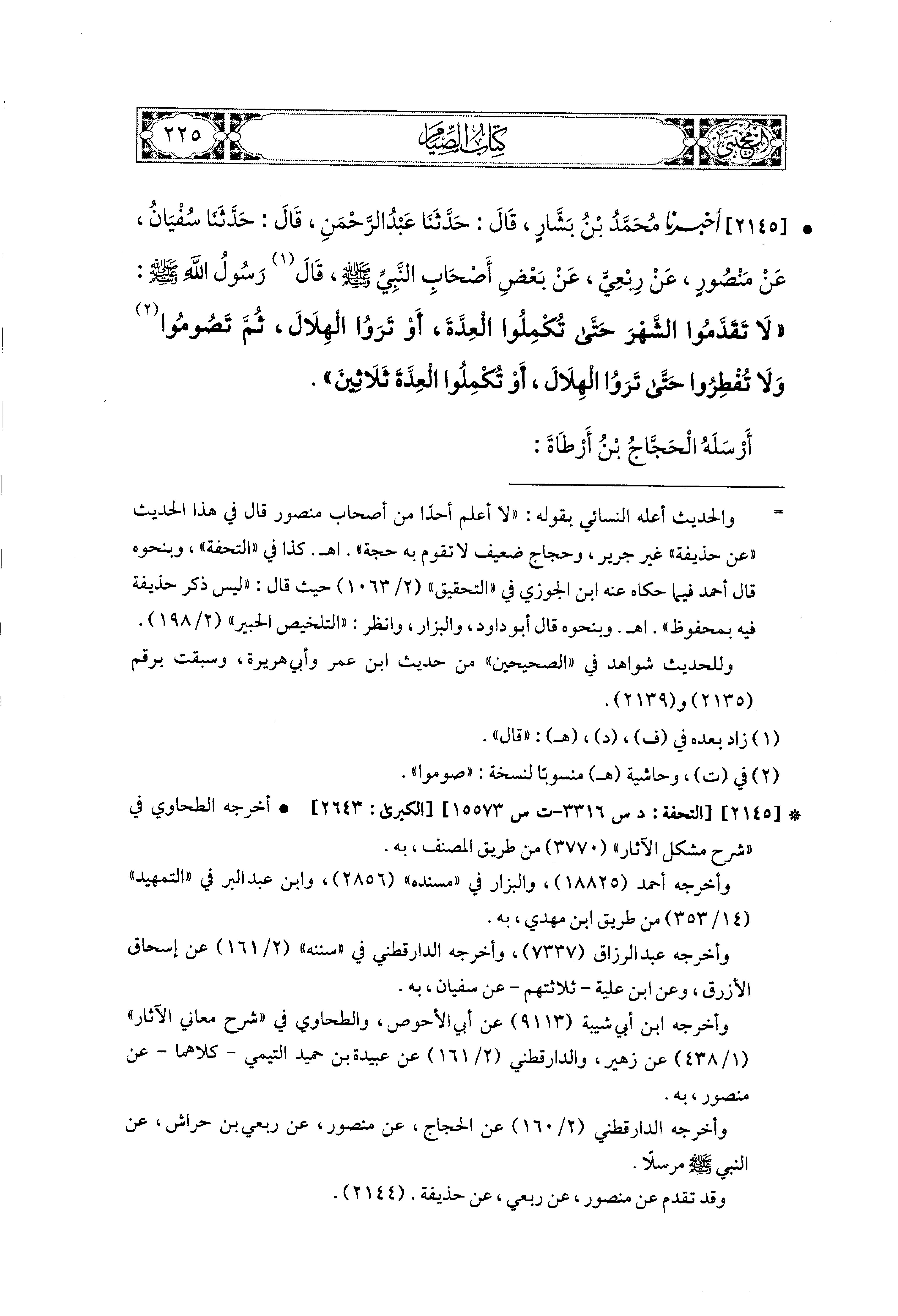 2145- أَخبَرَنا مُحَمد بْنُ بَشَّارٍ، قال: حَدثنا عَبدُ الرَّحمَنِ، قال: حَدثنا سُفيَانُ، عَن مَنْصُورٍ، عَن رِبْعِيٍّ، عَن بَعْضِ أَصْحَابِ النَّبيِّ صَلى الله عَليه وسَلم قَالَ رَسُولُ اللهِ صَلى الله عَليه وسَلم: لاَ تَقَدَّمُوا الشَّهْرَ حَتَّى تُكْمِلُوا العِدَّةَ، أَوْ تَرَوْا الهِلاَلَ، ثُمَّ تصُومُوا وَلاَ تُفْطِرُوا حَتَّى تَرَوْا الهِلاَلَ، أَوْ تُكْمِلُوا العِدَّةَ ثَلاَثِينَ.