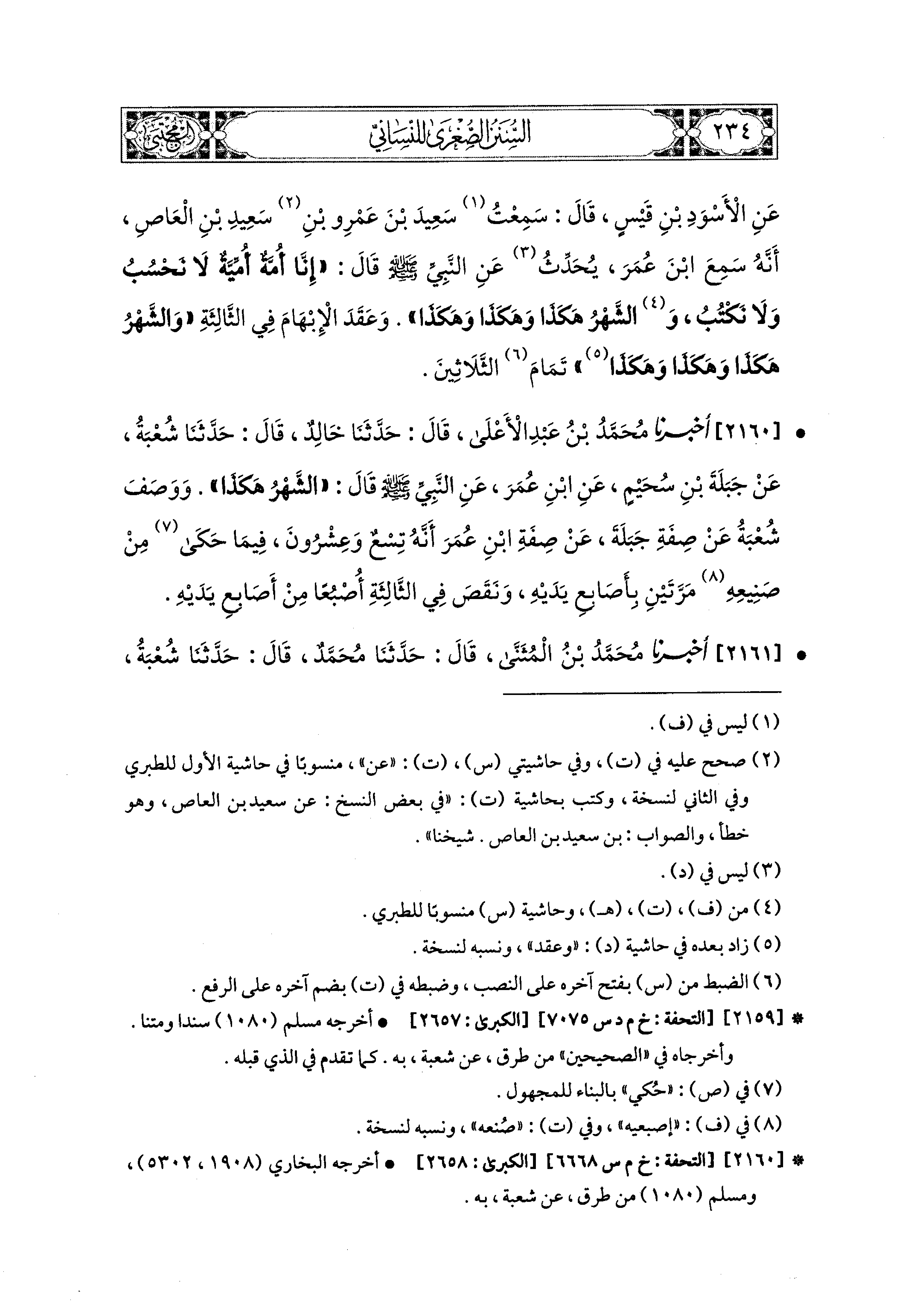 2160- أَخبَرَنا مُحَمد بن عَبدِ الأَعلَى، قال: حَدثنا خَالِدٌ، قال: حَدثنا شُعبَةُ، عَن جَبَلَةَ بْنِ سُحَيْمٍ، عَنِ ابنِ عُمَرَ، عَنِ النَّبيِّ صَلى الله عَليه وسَلم قَالَ: الشَّهْرُ هَكَذَا، وَوَصَفَ شُعبَةُ، عَن صِفَةِ جَبَلَةَ، عَن صِفَةِ ابنِ عُمَرَ، أَنَّهُ تِسْعٌ وَعِشْرُونَ، فِيمَا حَكَى مِنْ صَنيعِهِ مَرَّتَيْنِ بِأَصَابِعِ يَدَيْهِ، وَنَقَصَ فِي الثَّالِثَةِ إِصْبَعًا مِنْ أَصَابِعِ يَدَيْهِ.