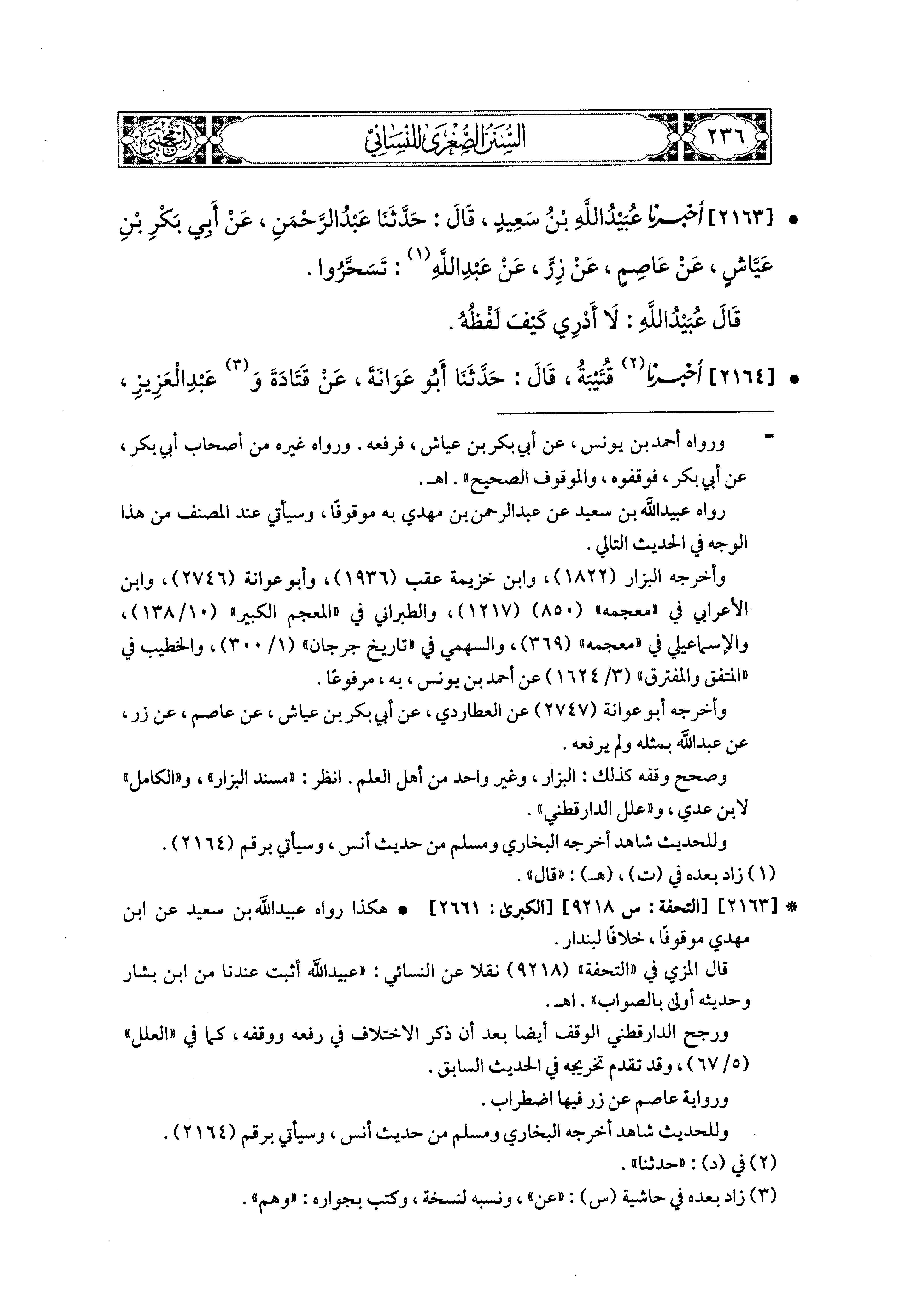 2163- أَخبَرَنا عُبَيدُ اللهِ بْنُ سَعيدٍ، قال: حَدثنا عَبدُ الرَّحمَنِ، عَن أَبي بَكْرِ بْنِ عَيَّاشٍ، عَن عَاصِمٍ، عَن زِرٍّ، عَن عَبدِ اللهِ، تَسَحَّرُوا.