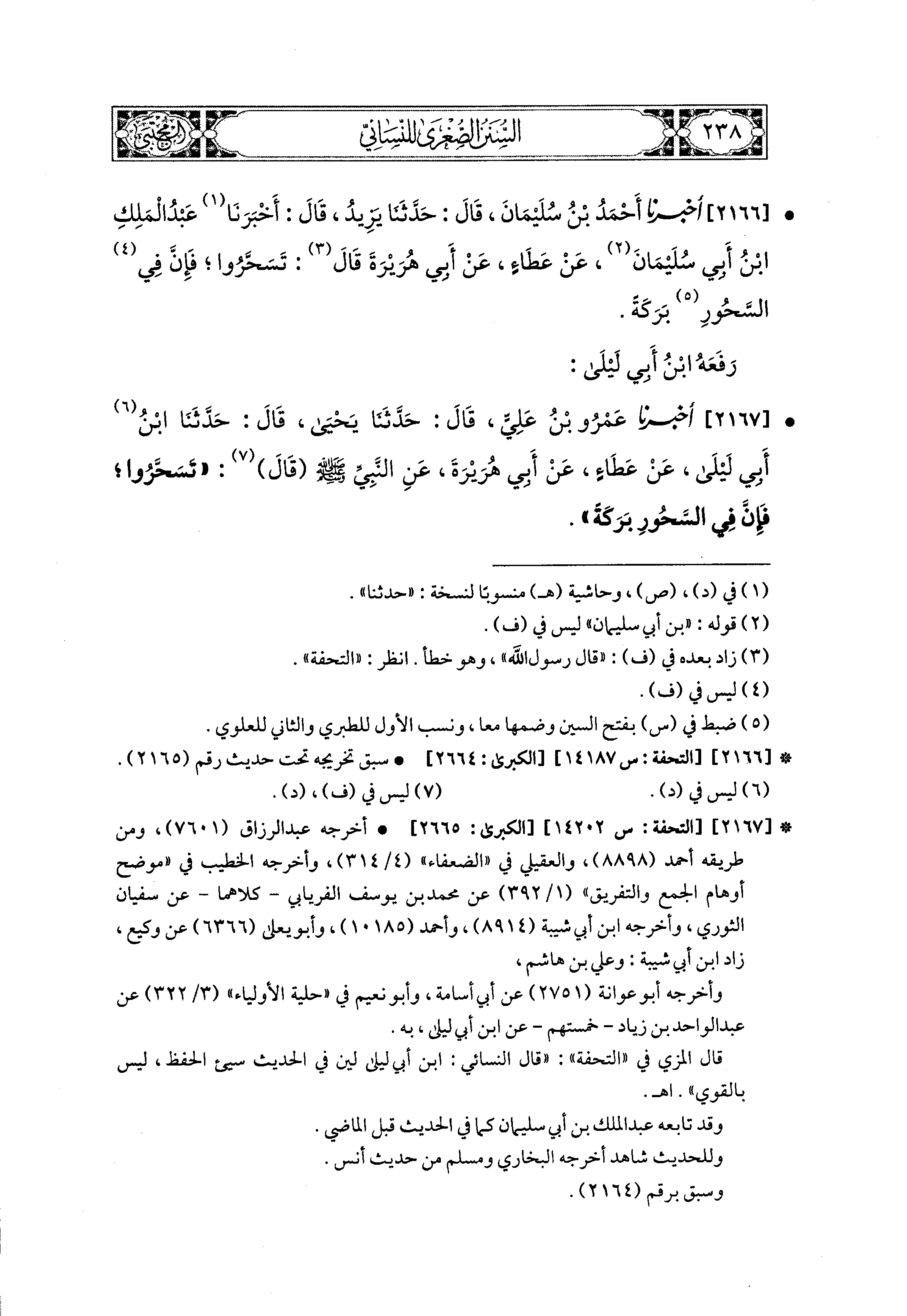 2167- أَخبَرَنا عَمْرُو بْنُ عَلِيٍّ، قال: حَدثنا يَحيَى، قال: حَدثنا ابنُ أَبي لَيْلَى، عَن عَطَاءٍ، عَن أَبي هُرَيرَةَ، عَنِ النَّبيِّ صَلى الله عَليه وسَلم قَالَ: تَسَحَّرُوا فَإِنَّ فِي السَّحُورِ بَرَكَةً.