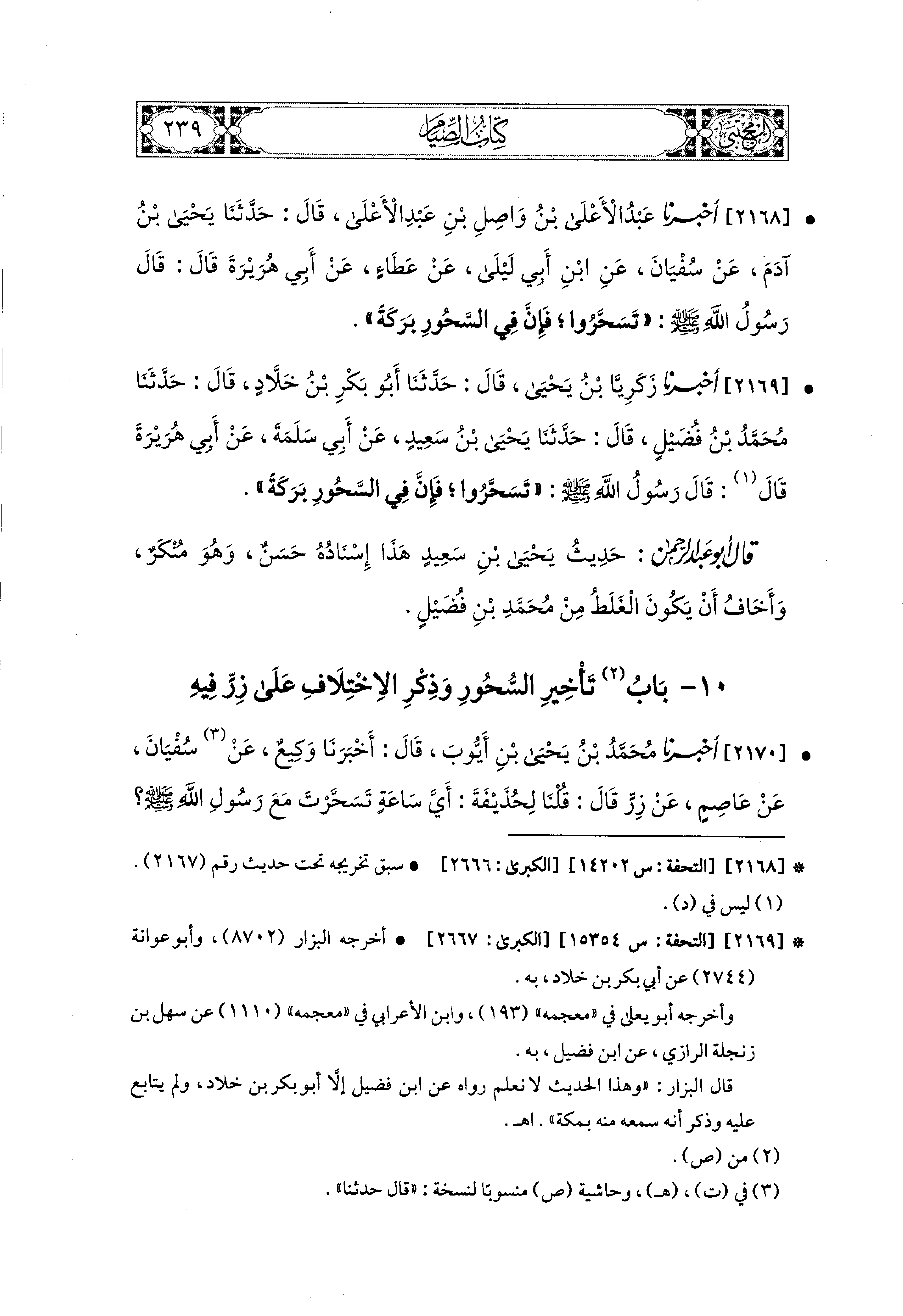 2170- أَخبَرَنا مُحَمد بْنُ يَحيَى بْنِ أَيُّوبَ، قَالَ: أَخبَرنا وَكِيعٌ، عَن سُفيَانُ، عَن عَاصِمٍ، عَن زِرٍّ، قَالَ: قُلْنَا لِحُذَيفَةَ: أَيَّ سَاعَةٍ تَسَحَّرْتَ مَعَ رَسُولِ اللهِ صَلى الله عَليه وسَلم؟ قَالَ: هُوَ النَّهَارُ إِلاَّ أَنَّ الشَّمْسَ لَمْ تَطْلُعْ.