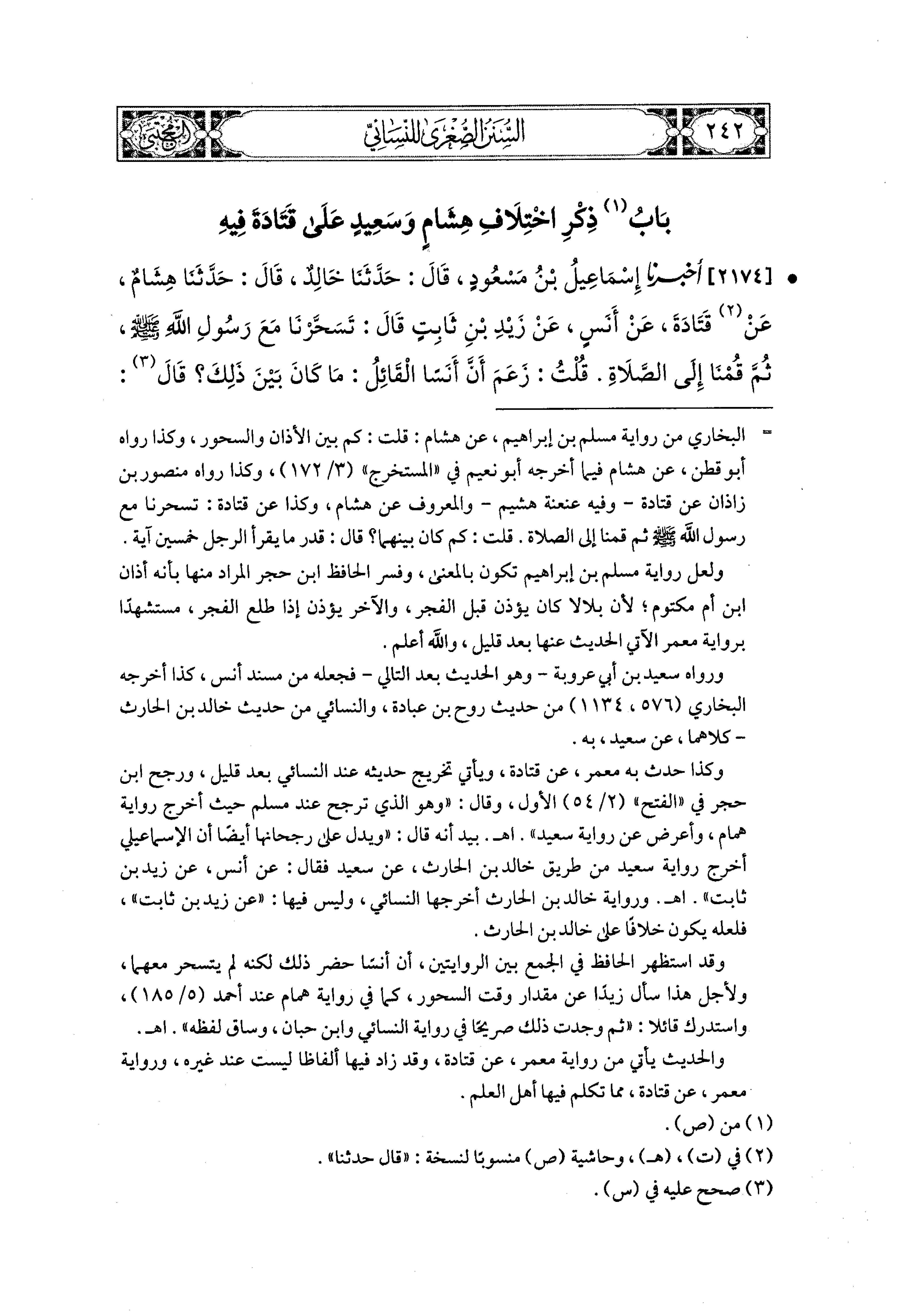 2174- أَخبَرَنا إِسماعِيلُ بْنُ مَسْعُودٍ، قال: حَدثنا خَالِدٌ، قال: حَدثنا هِشَامٌ، عَن قَتَادَةُ، عَن أَنَسٍ، عَن زَيْدِ بْنِ ثَابِتٍ، قَالَ: تَسَحَّرْنَا مَعَ رَسُولِ اللهِ صَلى الله عَليه وسَلم، ثُمَّ قُمْنَا إِلَى الصَّلاَةِ، قُلْتُ: زُعِمَ أَنَّ أَنَسًا القَائِلُ، مَا كَانَ بَيْنَ ذَلِكَ؟ قَالَ: قَدْرَ مَا يَقْرَأُ الرَّجُلُ خَمْسِينَ آيَةً.