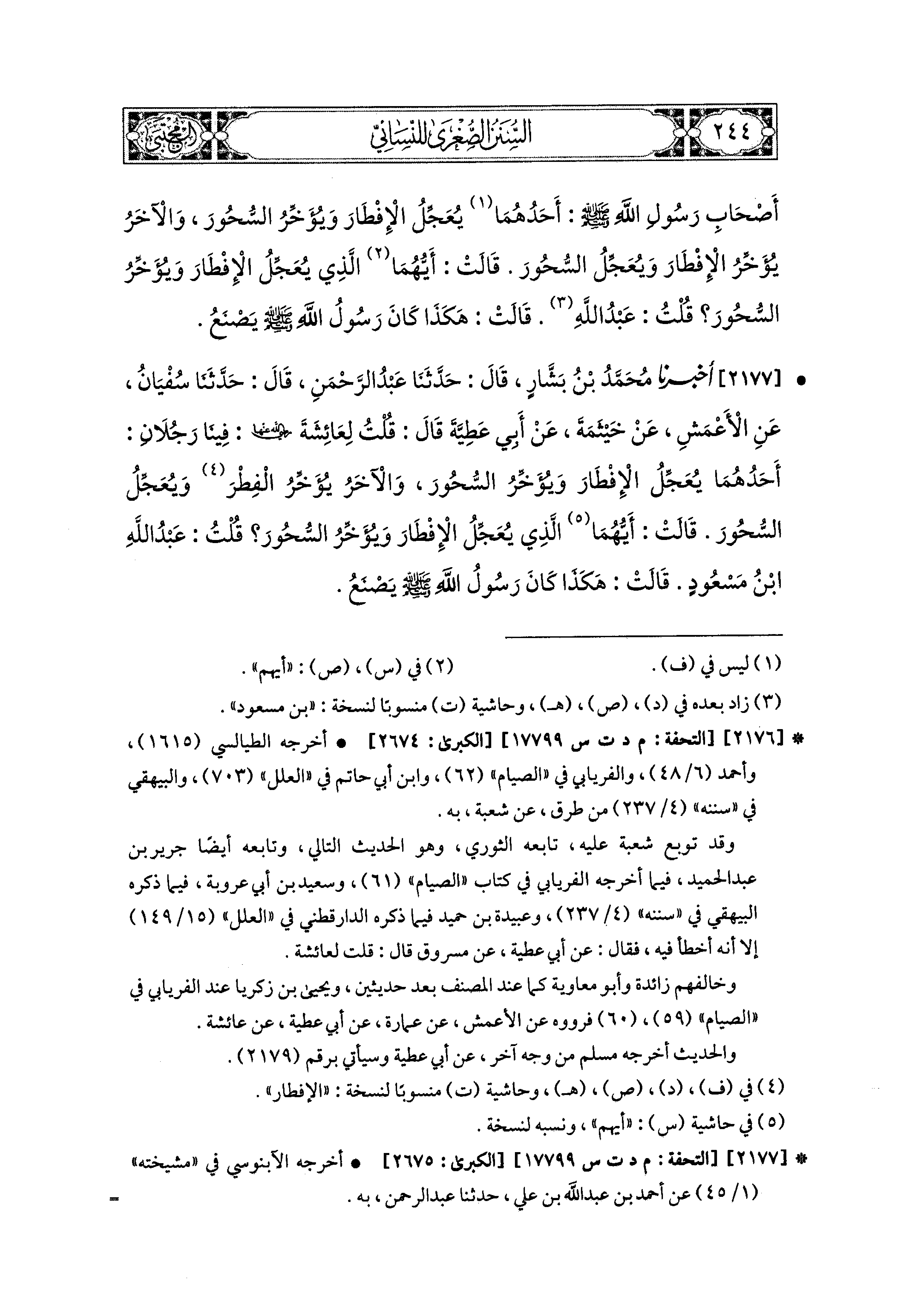 2177- أَخبَرَنا مُحَمد بْنُ بَشَّارٍ، قال: حَدثنا عَبدُ الرَّحمَنِ، قال: حَدثنا سُفيَانُ، عَنِ الأَعْمَشِ، عَن خَيْثَمَةَ، عَن أَبي عَطِيَّةَ، قَالَ: قُلْتُ لِعَائِشَةَ رَضِيَ اللهُ عَنْهَا: فِينَا رَجُلاَنِ أَحَدُهُمَا يُعَجِّلُ الإِفْطَارَ وَيُؤَخِّرُ السُّحُورَ، وَالآخَرُ يُؤَخِّرُ الفِطْرَ وَيُعَجِّلُ السُّحُورَ، قَالَتْ: أَيُّهُمَا الَّذِي يُعَجِّلُ الإِفْطَارَ وَيُؤَخِّرُ السُّحُورَ؟ قُلْتُ: عَبدُ اللهِ بْنُ مَسْعُودٍ، قَالَتْ: هَكَذَا كَانَ رَسُولُ اللهِ صَلى الله عَليه وسَلم يَصْنَعُ.