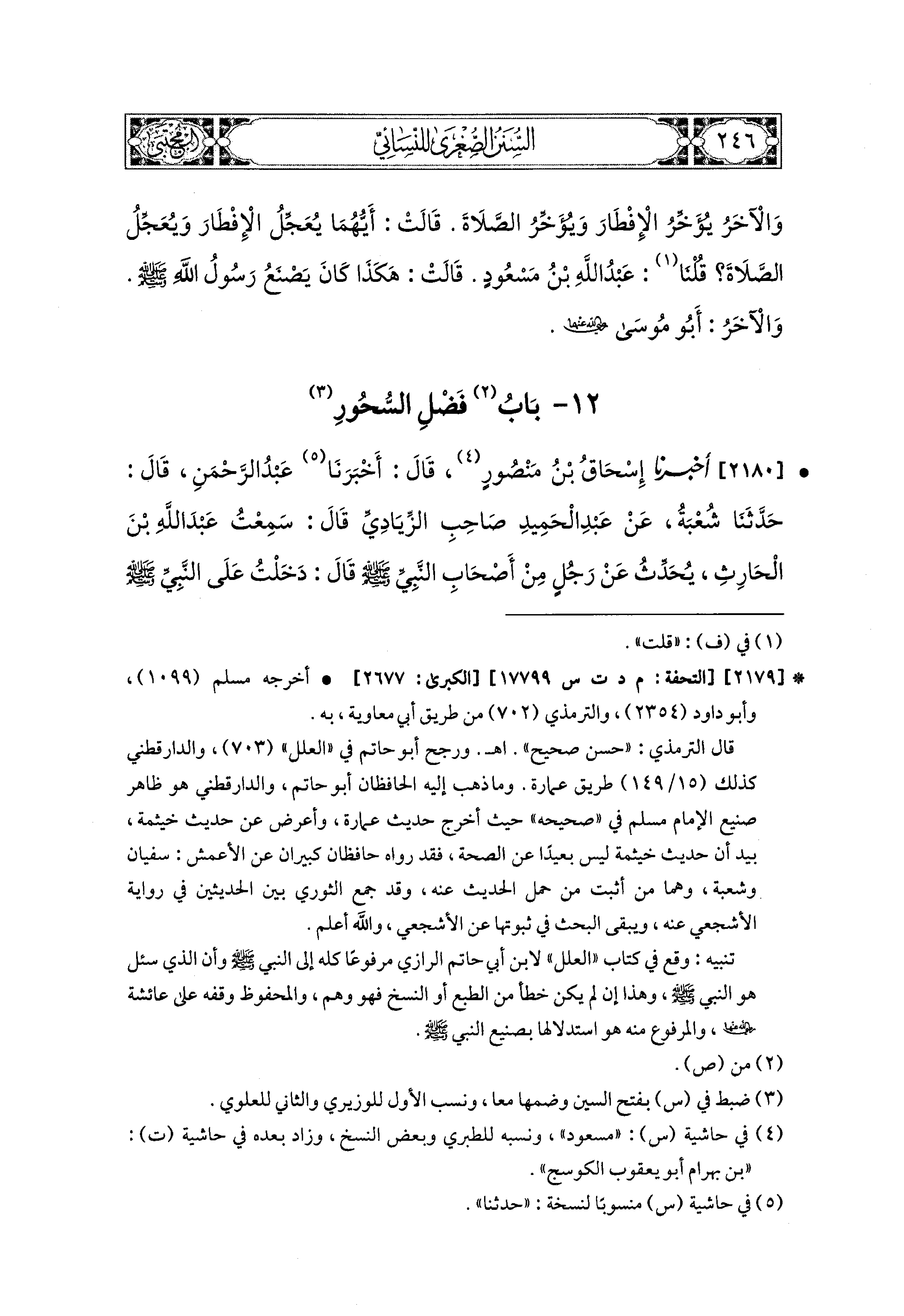2180- أَخبَرَنا إِسحَاقُ بْنُ مَنْصُورٍ، قَالَ: أَخبَرنا عَبدُ الرَّحمَنِ، قال: حَدثنا شُعبَةُ، عَن عَبدِ الحَميدِ، صَاحِبِ الزِّيَادِيِّ، قَالَ: سَمِعْتُ عَبدَ اللهِ بْنَ الحَارِثِ، يُحَدِّثُ عَن رَجُلٍ مِنْ أَصْحَابِ النَّبيِّ صَلى الله عَليه وسَلم قَالَ: دَخَلْتُ عَلَى النَّبيِّ صَلى الله عَليه وسَلم وَهُوَ يَتَسَحَّرُ، فَقَالَ: إِنَّهَا بَرَكَةٌ أَعْطَاكُمُ اللهُ إِيَّاهَا فَلاَ تَدَعُوهُ.