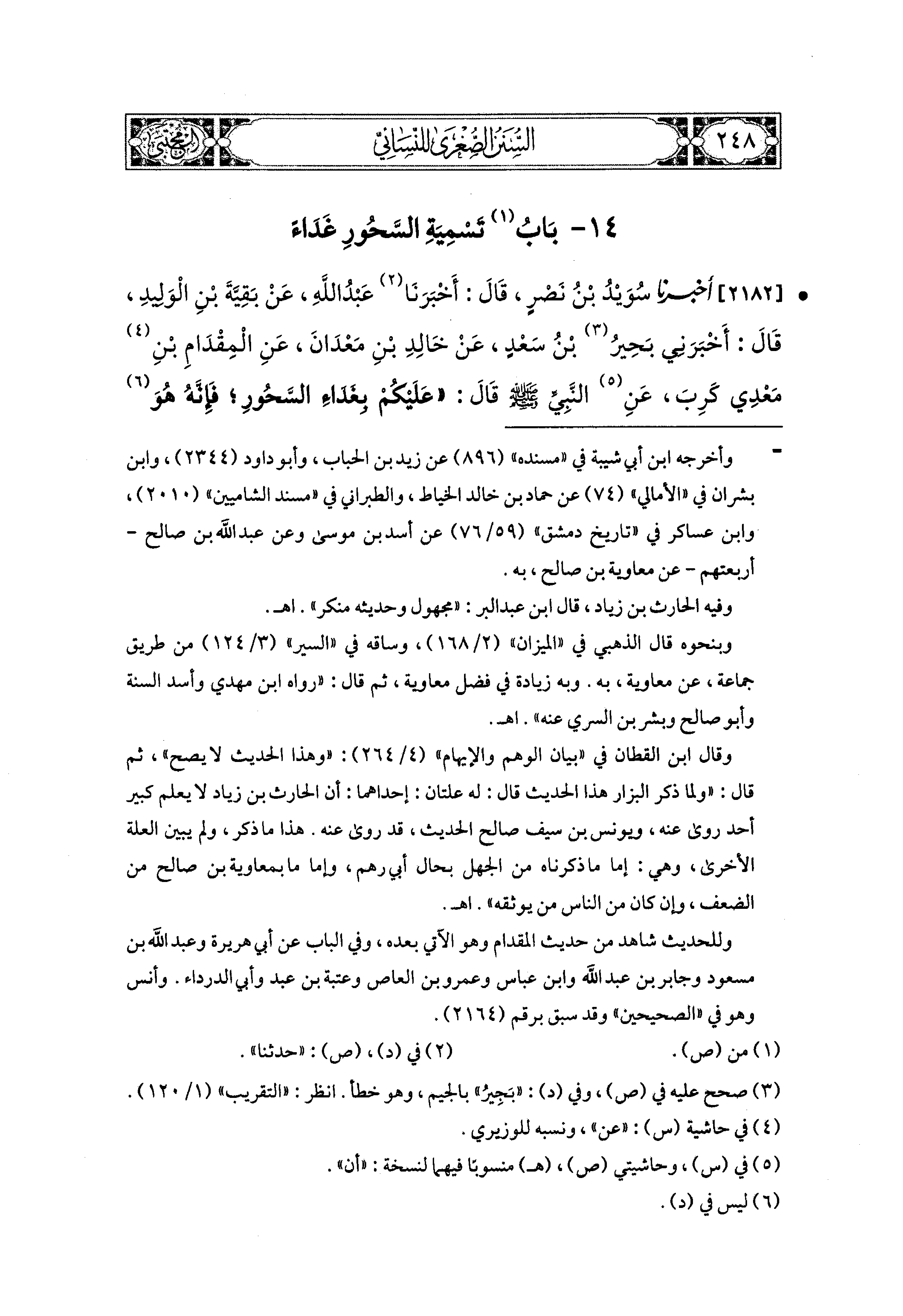 2182- أَخبَرَنا سُوَيْدُ بْنُ نَصْرٍ، قَالَ: أَخبَرنا عَبدُ اللهِ، عَن بَقِيَّةَ بْنِ الوَلِيدِ، قَالَ: أَخبَرني بَحِيرُ بْنُ سَعْدٍ، عَن خَالِدِ بْنِ مَعْدَانَ، عَنِ المِقْدَامِ بْنِ مَعْدِي كْرِبَ، عَنِ النَّبيِّ صَلى الله عَليه وسَلم قَالَ: عَلَيْكُمْ بِغَدَاءِ السُّحُورِ فَإِنَّهُ هُوَ الغَدَاءُ المُبَارَكُ.