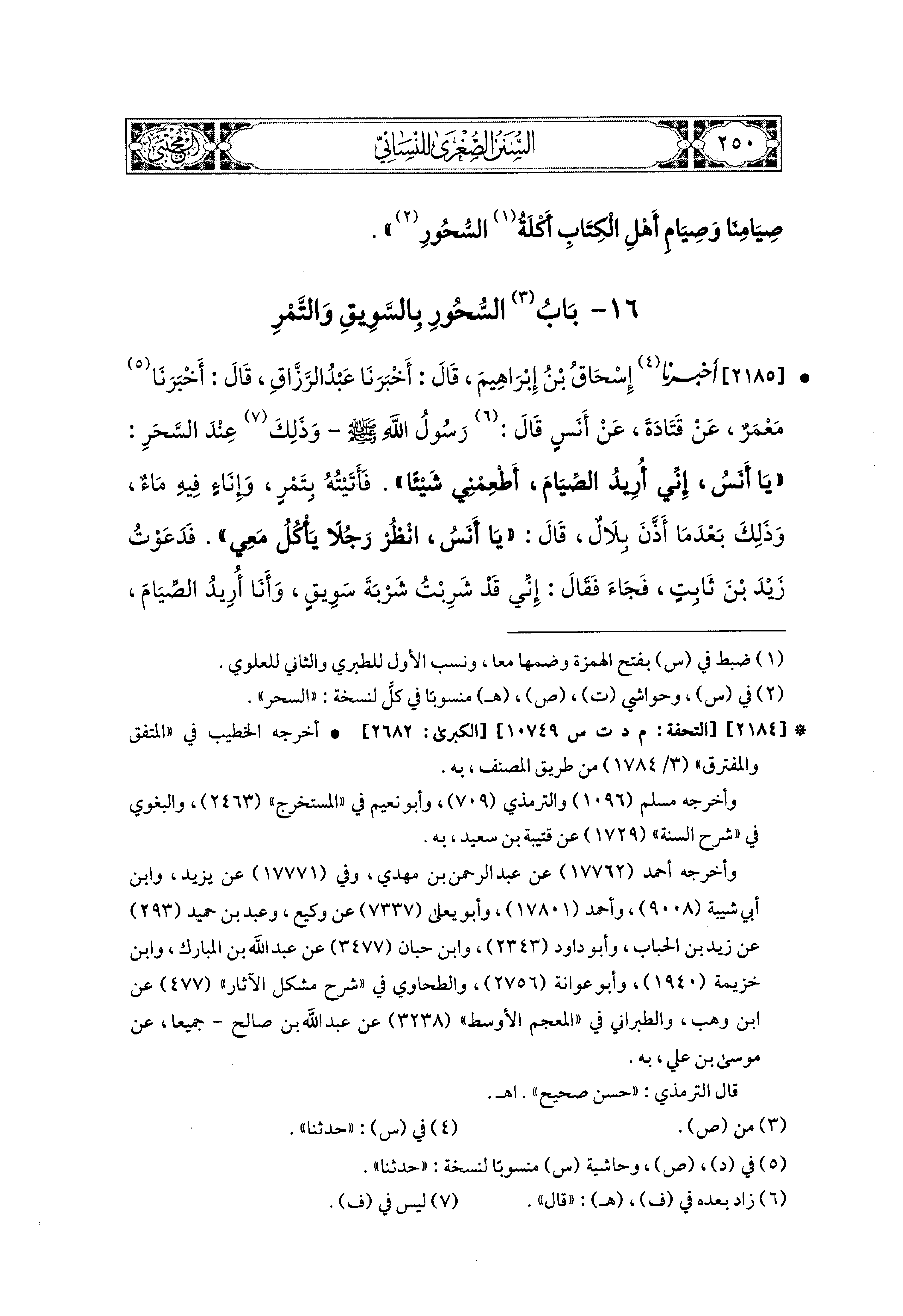 2185- أَخبَرَنا إِسحَاقُ بْنُ إِبراهِيمَ، قَالَ: أَخبَرنا عَبدُ الرَّزَّاقِ، قَالَ: أَخبَرنا مَعْمَرٌ، عَن قَتَادَةَ، عَن أَنَسٍ، قَالَ: رَسُولُ اللهِ صَلى الله عَليه وسَلم وَذَلِكَ عِنْدَ السحر: يَا أَنَسُ إِنِّي أُرِيدُ الصِّيَامَ، أَطْعِمْني شَيْئًا، فَأَتَيْتُهُ بِتَمْرٍ وَإِنَاءٍ فِيهِ مَاءٌ، وَذَلِكَ بَعْدَ مَا أَذَّنَ بِلاَلٌ، قَالَ: يَا أَنَسُ، انْظُرْ رَجُلاً يَأْكُلْ مَعِي، فَدَعَوْتُ زَيْدَ بْنَ ثَابِتٍ، فَجَاءَ، فَقَالَ: إِنِّي قَدْ شَرِبْتُ شَرْبَةَ سَوِيقٍ وَأَنَا أُرِيدُ الصِّيَامَ، فَقَالَ رَسُولُ اللهِ صَلى الله عَليه وسَلم: وَأَنَا أُرِيدُ الصِّيَامَ، فَتَسَحَّرَ مَعَهُ، ثُمَّ قَامَ فَصَلَّى رَكْعَتَيْنِ، ثُمَّ خَرَجَ إِلَى الصَّلاَةِ.