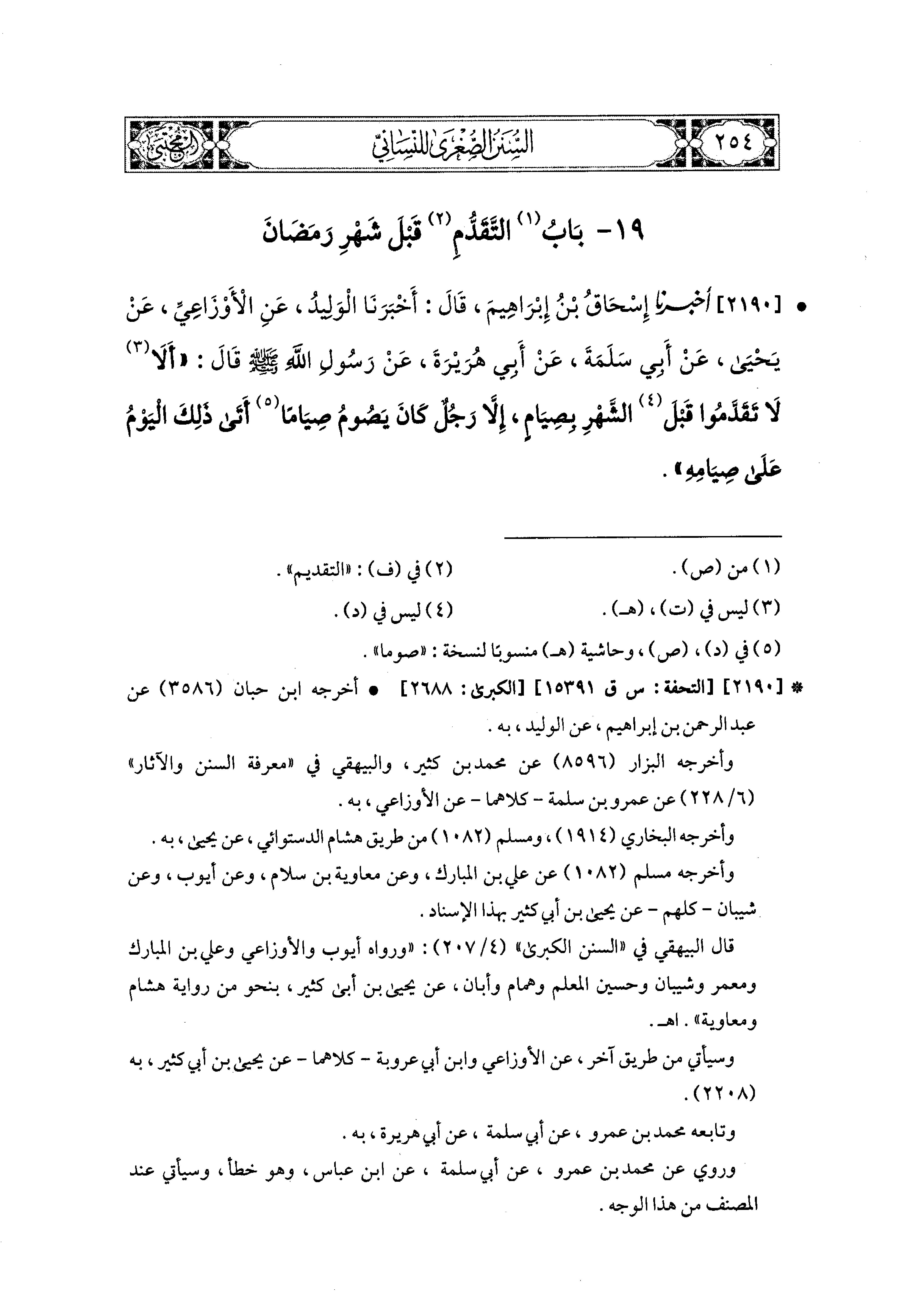 2190- أَخبَرَنا إِسحَاقُ بْنُ إِبراهِيمَ، قَالَ: أَخبَرنا الوَلِيدُ، عَنِ الأَوْزَاعِيِّ، عَن يَحيَى، عَن أَبي سَلَمَةَ، عَن أَبي هُرَيرَةَ، عَن رَسُولِ اللهِ صَلى الله عَليه وسَلم قَالَ: ألاَ لا تَقَدَّمُوا قَبْلَ الشَّهْرِ بِصِيَامٍ، إِلاَّ رَجُلٌ كَانَ يَصُومُ صِيَامًا أَتَى ذَلِكَ اليَوْمُ عَلَى صِيَامِهِ.