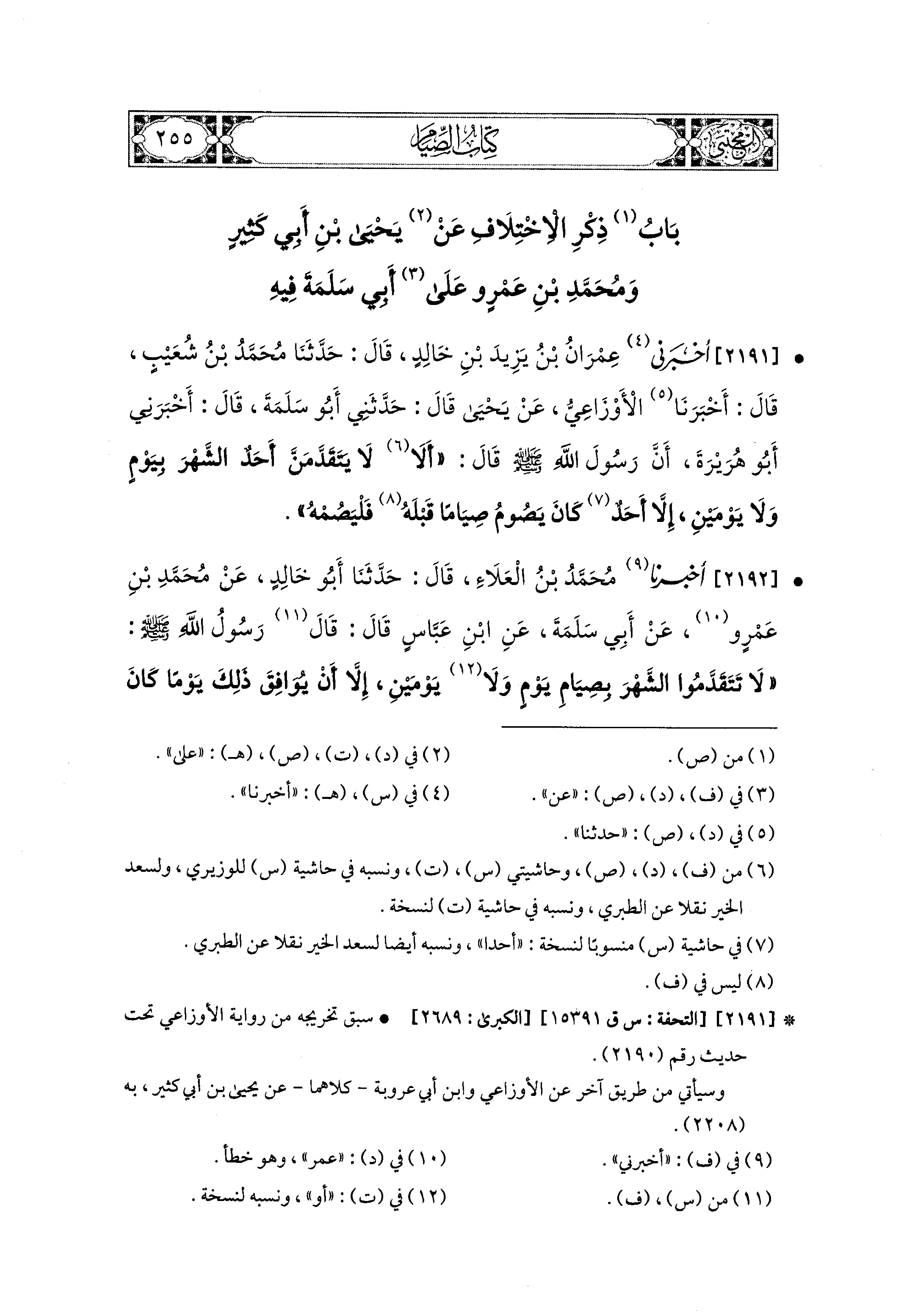 2191- أَخبَرني عِمْرَانُ بْنُ يَزِيدَ بْنِ خَالِدٍ، قال: حَدثنا مُحَمدُ بْنُ شُعَيبٍ، قَالَ: أَخبَرنا الأَوْزَاعِيُّ، عَن يَحيَى، قَالَ: حَدَّثَني أَبو سَلَمَةَ، قَالَ: أَخبَرني أَبو هُرَيرَةَ، أَنَّ رَسُولَ اللهِ صَلى الله عَليه وسَلم قَالَ: ألا لاَ يَتَقَدَّمَنَّ أَحَدٌ الشَّهْرَ بِيَوْمٍ وَلاَ يَوْمَيْنِ، إِلاَّ أَحَدٌ كَانَ يَصُومُ صِيَامًا قَبْلَهُ فَلْيَصُمْهُ.
