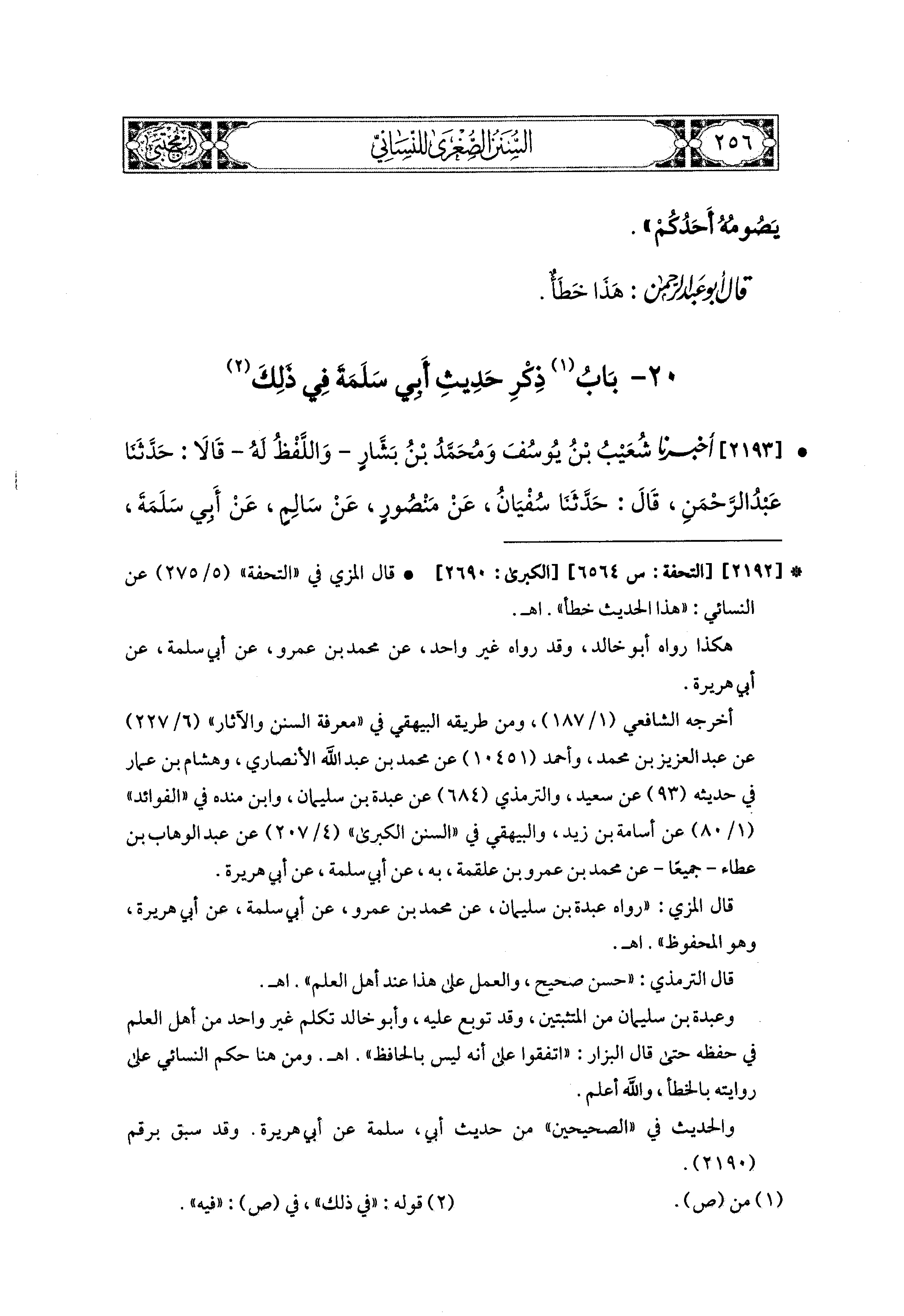 2193- أَخبَرَنا شُعَيبُ بْنُ يُوسُفَ، وَمُحَمدُ بْنُ بَشَّارٍ، وَاللَّفْظُ لَهُ، قَالاَ: حَدَّثَنَا عَبدُ الرَّحمَنِ، قال: حَدثنا سُفيَانُ، عَن مَنْصُورٍ، عَن سَالِمٍ، عَن أَبي سَلَمَةَ، عَن أُمِّ سَلَمَةَ، قَالَتْ: مَا رَأَيْتُ رَسُولَ اللهِ صَلى الله عَليه وسَلم يَصُومُ شَهْرَيْنِ مُتَتَابِعَيْنِ إِلاَّ أَنَّهُ كَانَ يَصِلُ شَعْبَانَ بِرَمَضَانَ.