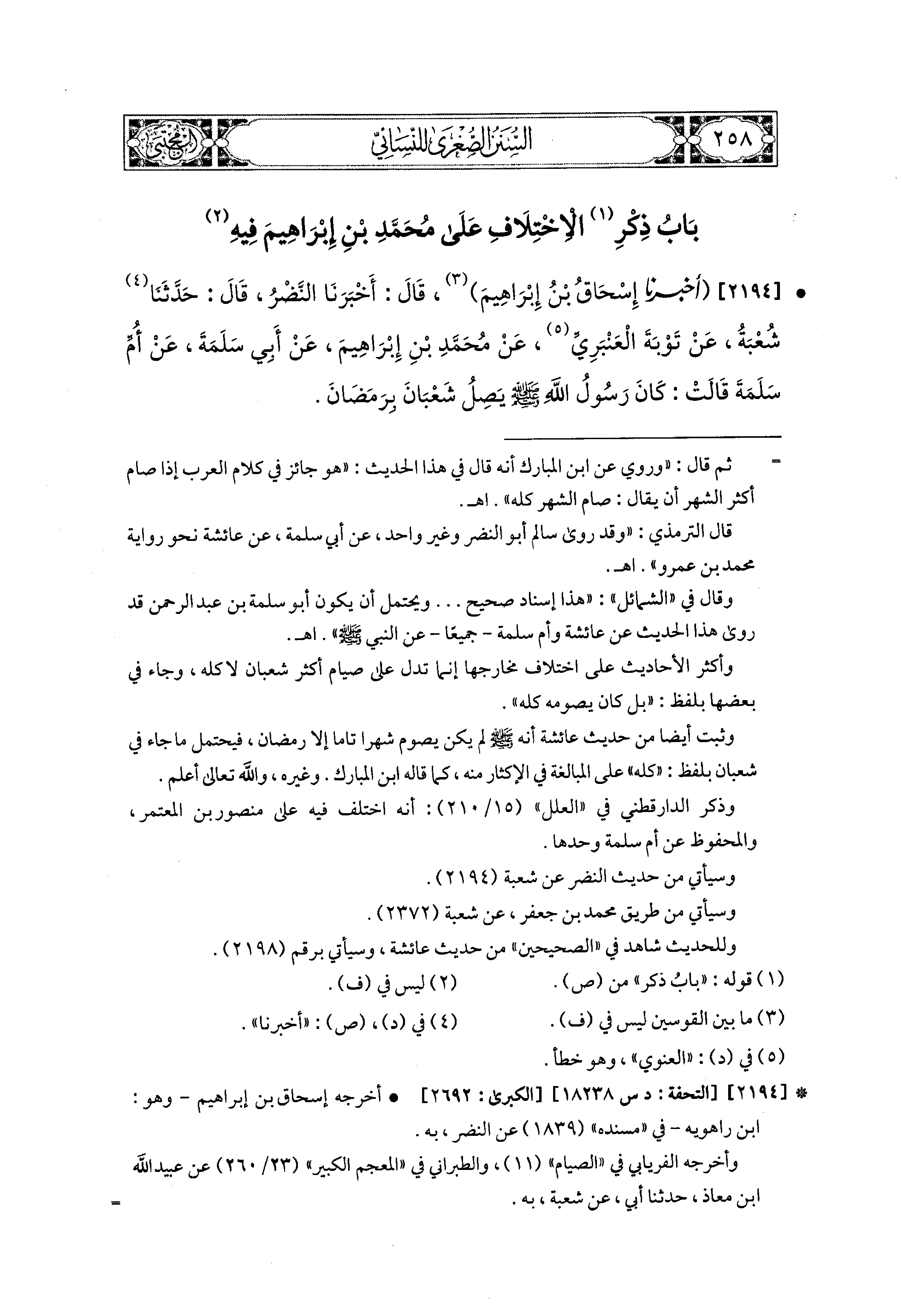 2194- أَخبَرَنا إِسحَاقُ بْنُ إِبراهِيمَ، قَالَ: أَخبَرنا النَّضْرُ، قَالَ: حَدَّثنا شُعبَةُ، عَن تَوْبَةَ العَنبَرِيِّ، عَن مُحَمدِ بْنِ إِبراهِيمَ، عَن أَبي سَلَمَةَ، عَن أُمِّ سَلَمَةَ، قَالَتْ: كَانَ رَسُولُ اللهِ صَلى الله عَليه وسَلم يَصِلُ شَعْبَانَ بِرَمَضَانَ.