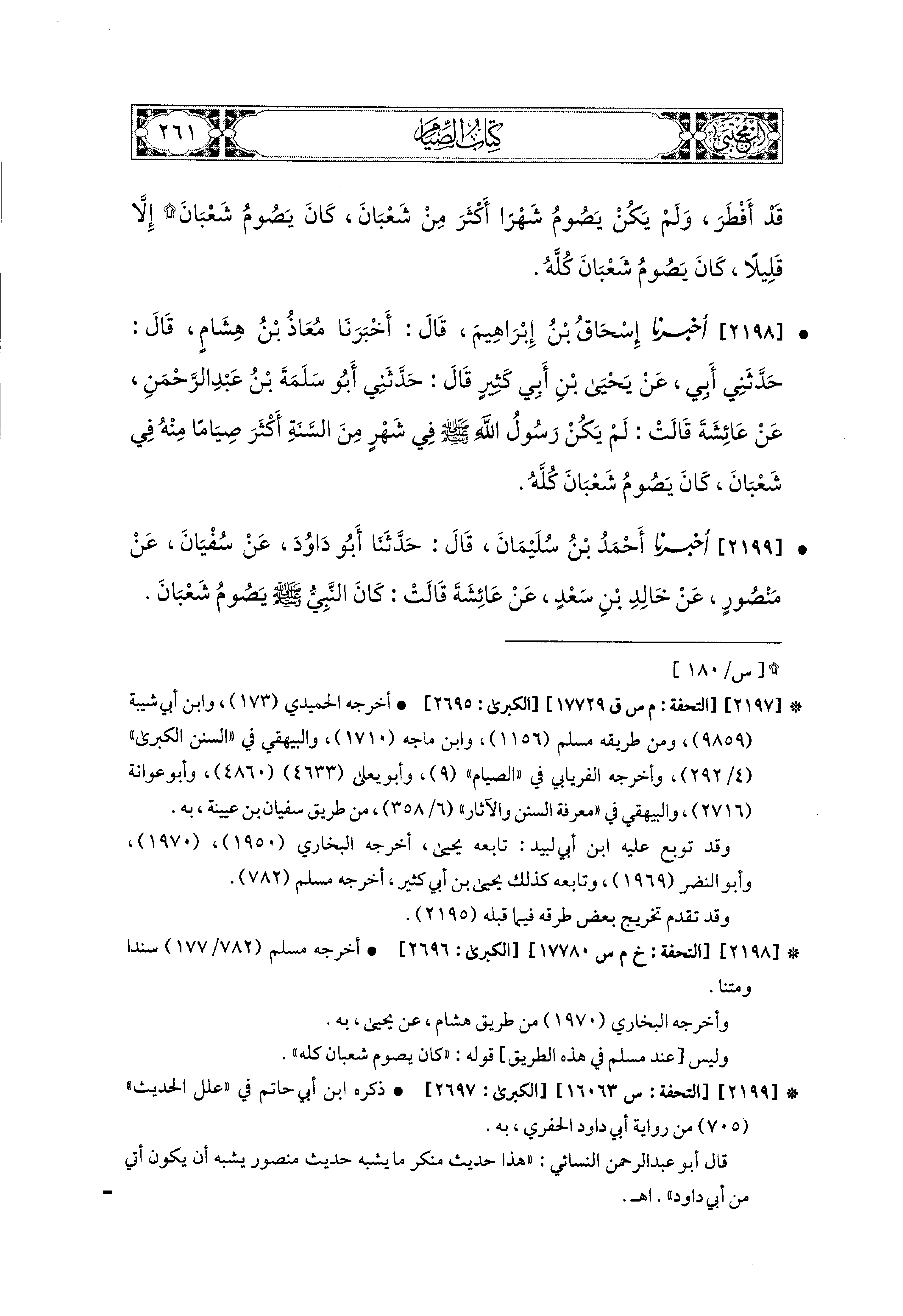 2198- أَخبَرَنا إِسحَاقُ بْنُ إِبراهِيمَ، قَالَ: أَخبَرنا مُعَاذُ بْنُ هِشَامٍ، قَالَ: حَدَّثَني أَبي، عَن يَحيَى بْنِ أَبي كَثِيرٍ، قَالَ: حَدَّثَني أَبو سَلَمَةَ بْنُ عَبدِ الرَّحمَنِ، عَن عَائِشَةَ، قَالَتْ: لَمْ يَكُنْ رَسُولُ اللهِ صَلى الله عَليه وسَلم فِي شَهْرٍ مِنَ السَّنَةِ أَكْثَرَ صِيَامًا مِنْهُ فِي شَعْبَانَ، كَانَ يَصُومُ شَعْبَانَ كُلَّهُ.