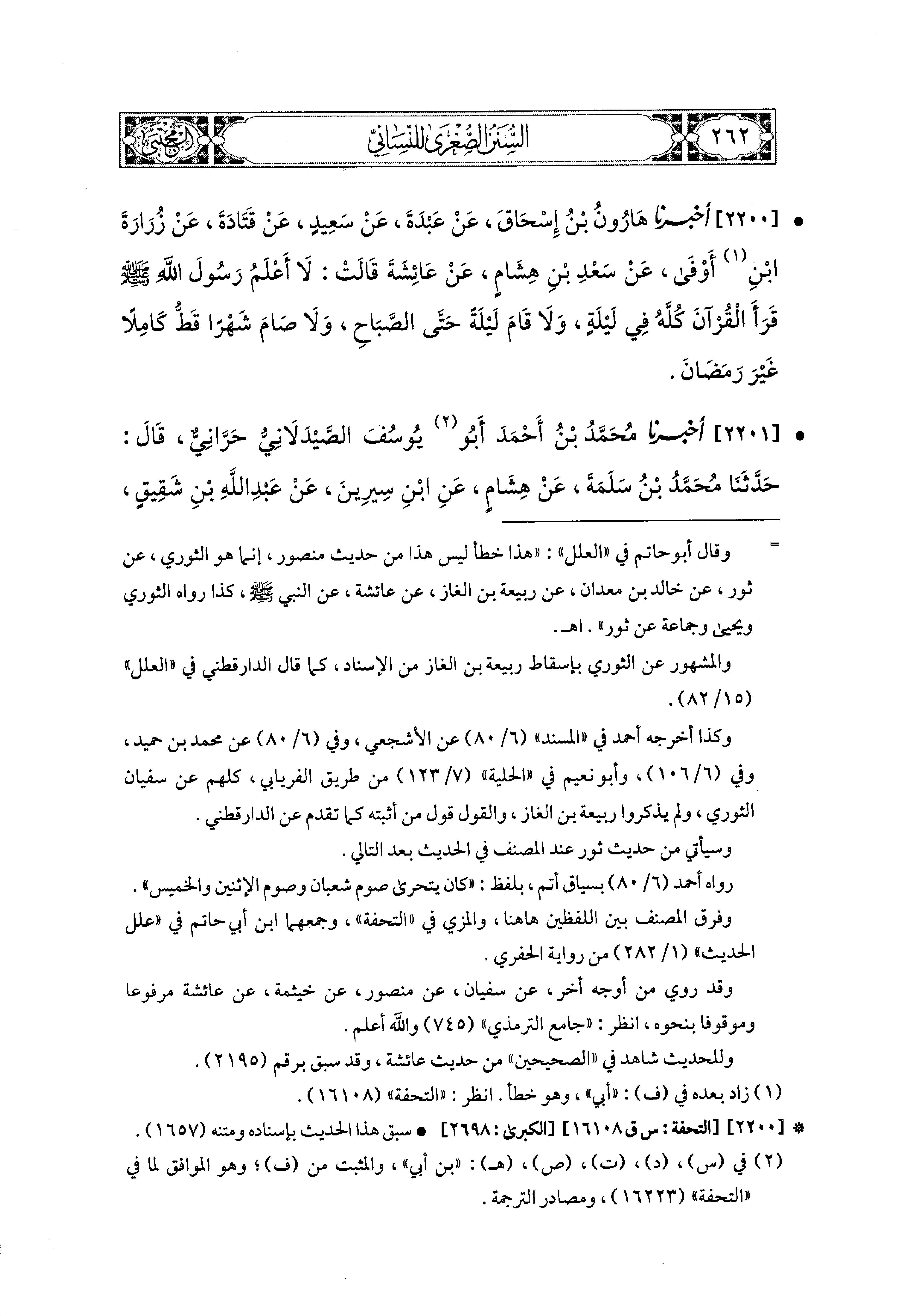 2200- أَخبَرَنا هَارُونُ بْنُ إِسحَاقَ، عَن عَبدَةَ، عَن سَعيدٍ، عَن قَتَادَةَ، عَن زُرَارَةَ بْنِ أَوْفَى، عَن سَعْدِ بْنِ هِشَامٍ، عَن عَائِشَةَ، قَالَتْ: لاَ أَعْلَمُ رَسُولَ اللهِ صَلى الله عَليه وسَلم قَرَأَ القُرْآنَ كُلَّهُ فِي لَيْلَةٍ، وَلاَ قَامَ لَيْلَةً حَتَّى الصَّبَاحِ، وَلاَ صَامَ شَهْرًا قَطُّ كَامِلاً غَيْرَ رَمَضَانَ.