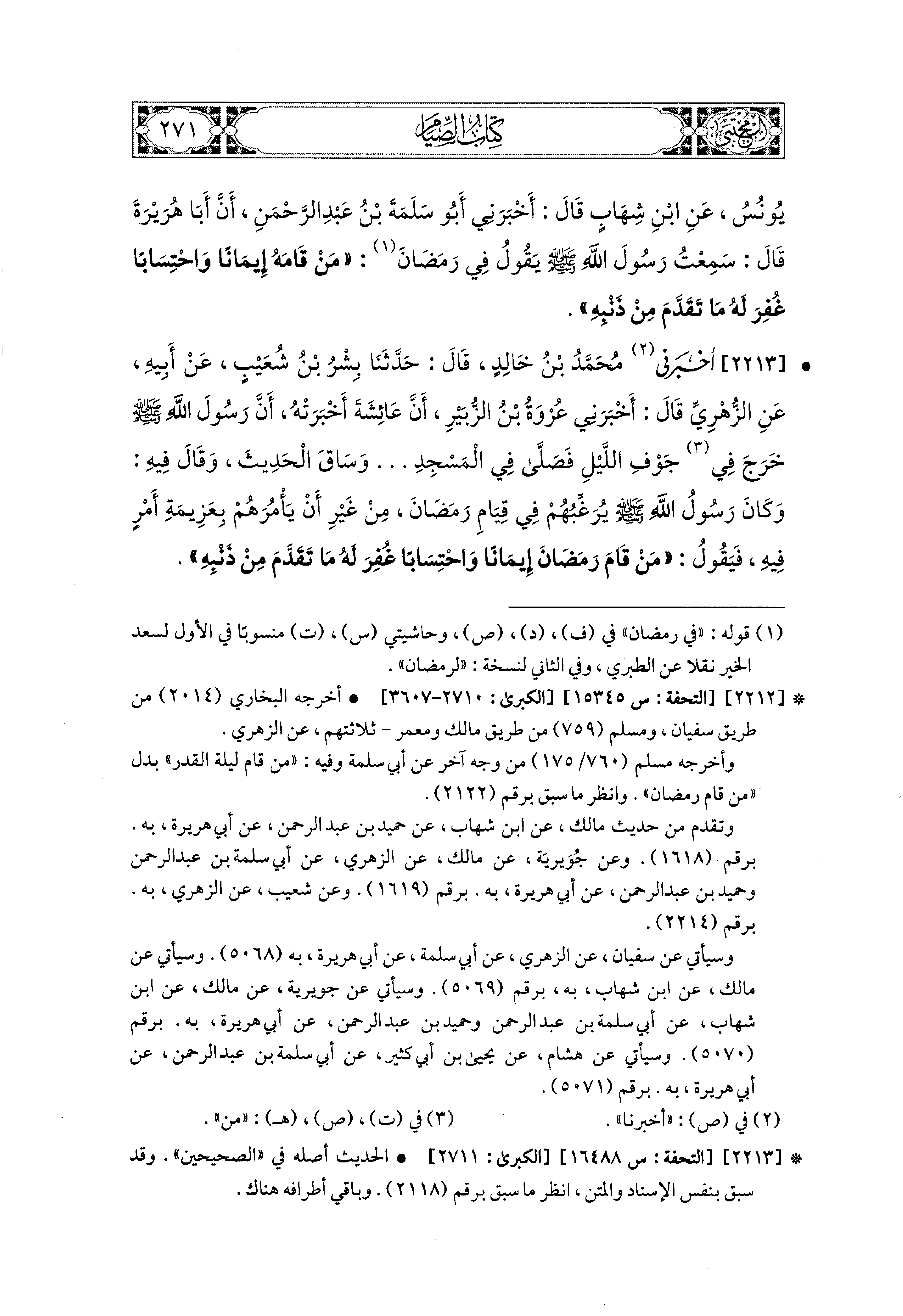 وَقَالَ فِيهِ: وَكَانَ رَسُولُ اللهِ صَلى الله عَليه وسَلم يُرَغِّبُهُمْ فِي قِيَامِ رَمَضَانَ مِنْ غَيْرِ أَنْ يَأْمُرَهُمْ بِعَزِيمَةِ أَمْرٍ فِيهِ، فَيَقُولُ: مَنْ قَامَ رَمَضَانَ إِيمَانًا وَاحْتِسَابًا غُفِرَ لَهُ مَا تَقَدَّمَ مِنْ ذَنْبِهِ.