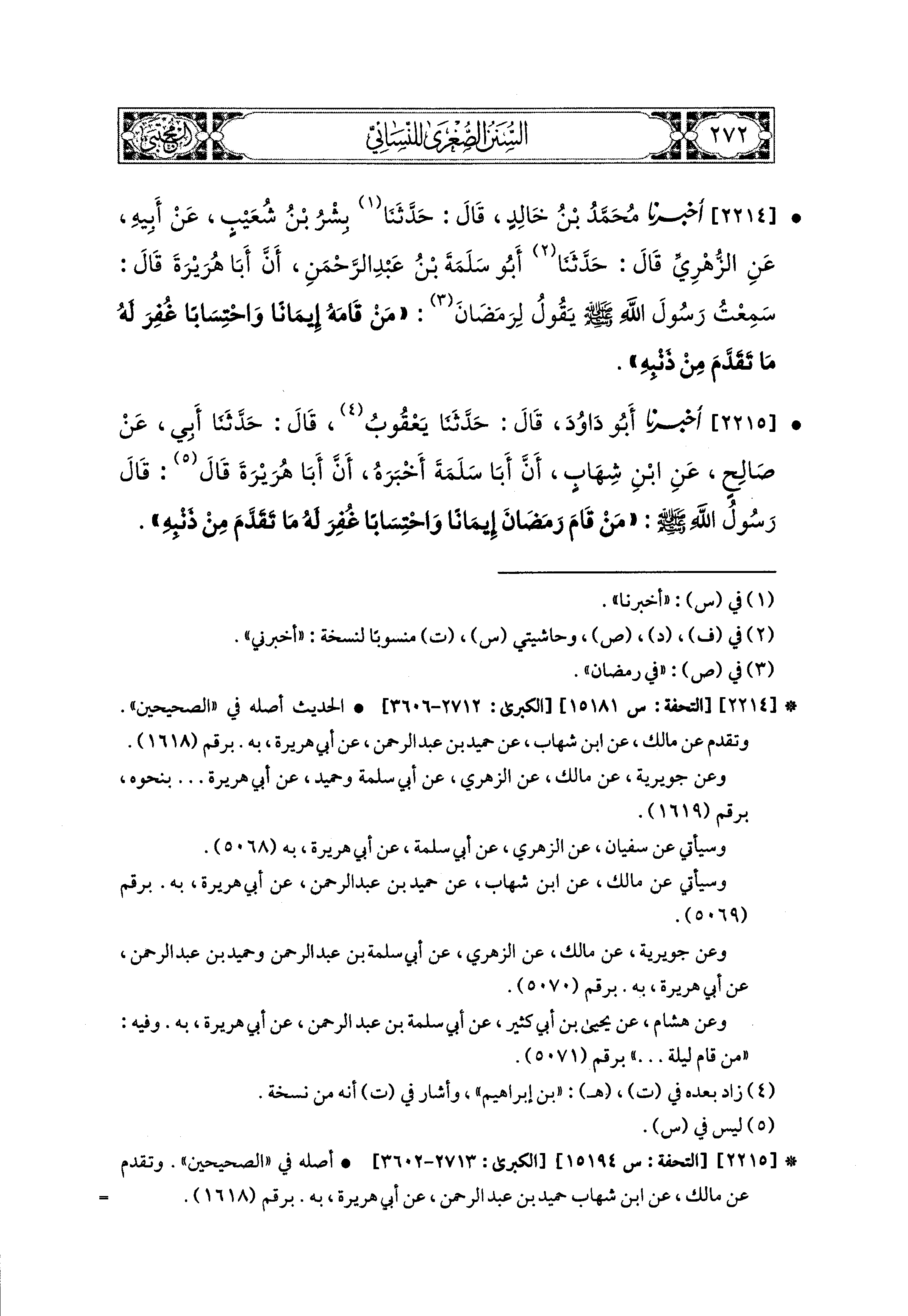 2214- أَخبَرَنا مُحَمد بْنُ خَالِدٍ، قال: حَدثنا بِشْرُ بْنُ شُعَيبٍ، عَن أَبيهِ، عَنِ الزُّهْرِيِّ، قال: حَدثنا أَبو سَلَمَةَ بْنُ عَبدِ الرَّحمَنِ، أَنَّ أَبَا هُرَيرَةَ، قَالَ: سَمِعْتُ رَسُولَ اللهِ صَلى الله عَليه وسَلم، يَقُولُ لِرَمَضَانَ: مَنْ قَامَهُ إِيمَانًا وَاحْتِسَابًا، غُفِرَ لَهُ مَا تَقَدَّمَ مِنْ ذَنْبِهِ.