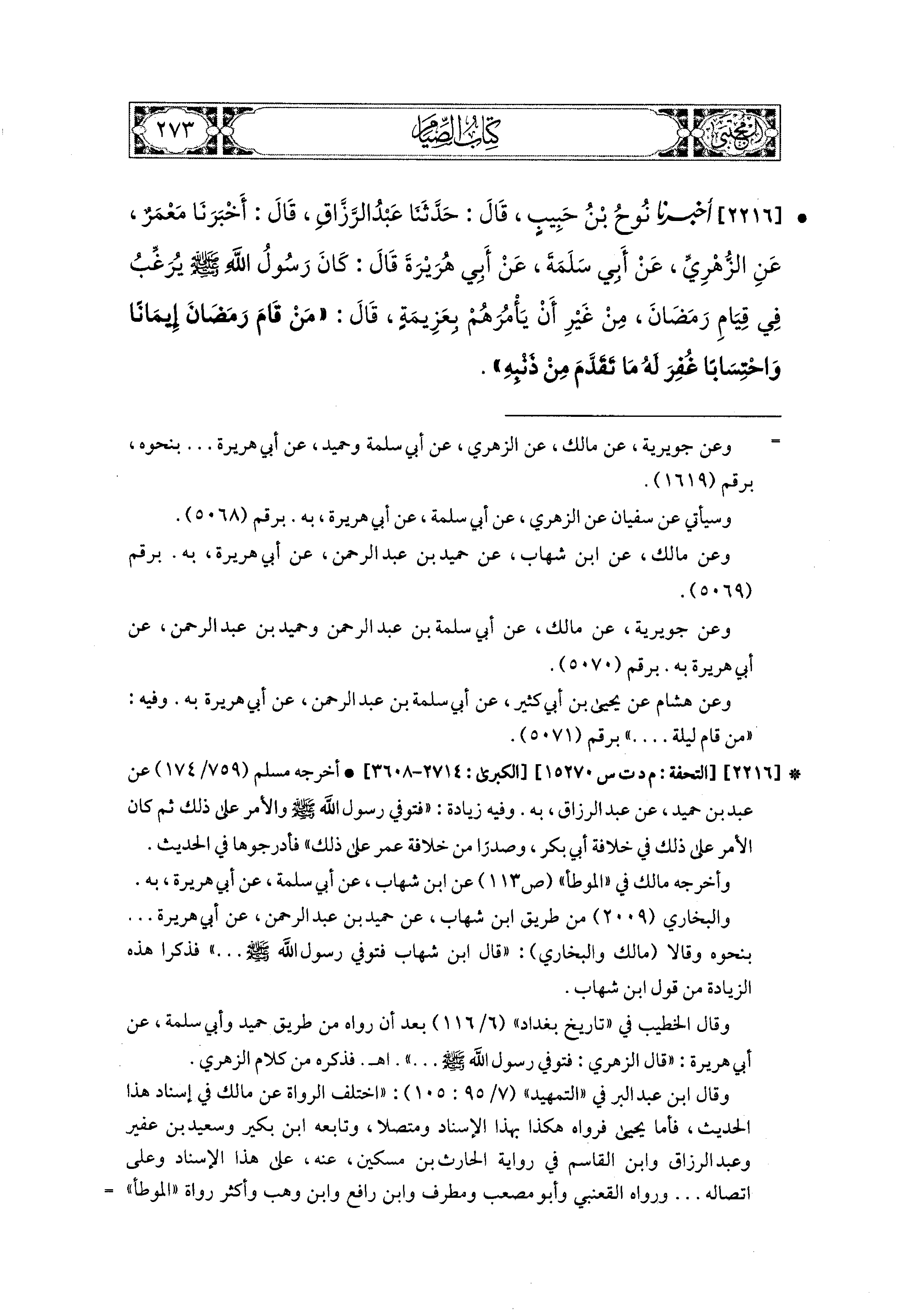 2216- أَخبَرَنا نُوحُ بْنُ حَبِيبٍ، قال: حَدثنا عَبدُ الرَّزَّاقِ، قَالَ: أَخبَرنا مَعْمَرٌ، عَنِ الزُّهْرِيِّ، عَن أَبي سَلَمَةَ، عَن أَبي هُرَيرَةَ، قَالَ: كَانَ رَسُولُ اللهِ صَلى الله عَليه وسَلم يُرَغِّبُ فِي قِيَامِ رَمَضَانَ مِنْ غَيْرِ أَنْ يَأْمُرَهُمْ بِعَزِيمَةٍ، قَالَ: مَنْ قَامَ رَمَضَانَ إِيمَانًا وَاحْتِسَابًا غُفِرَ لَهُ مَا تَقَدَّمَ مِنْ ذَنْبِهِ.