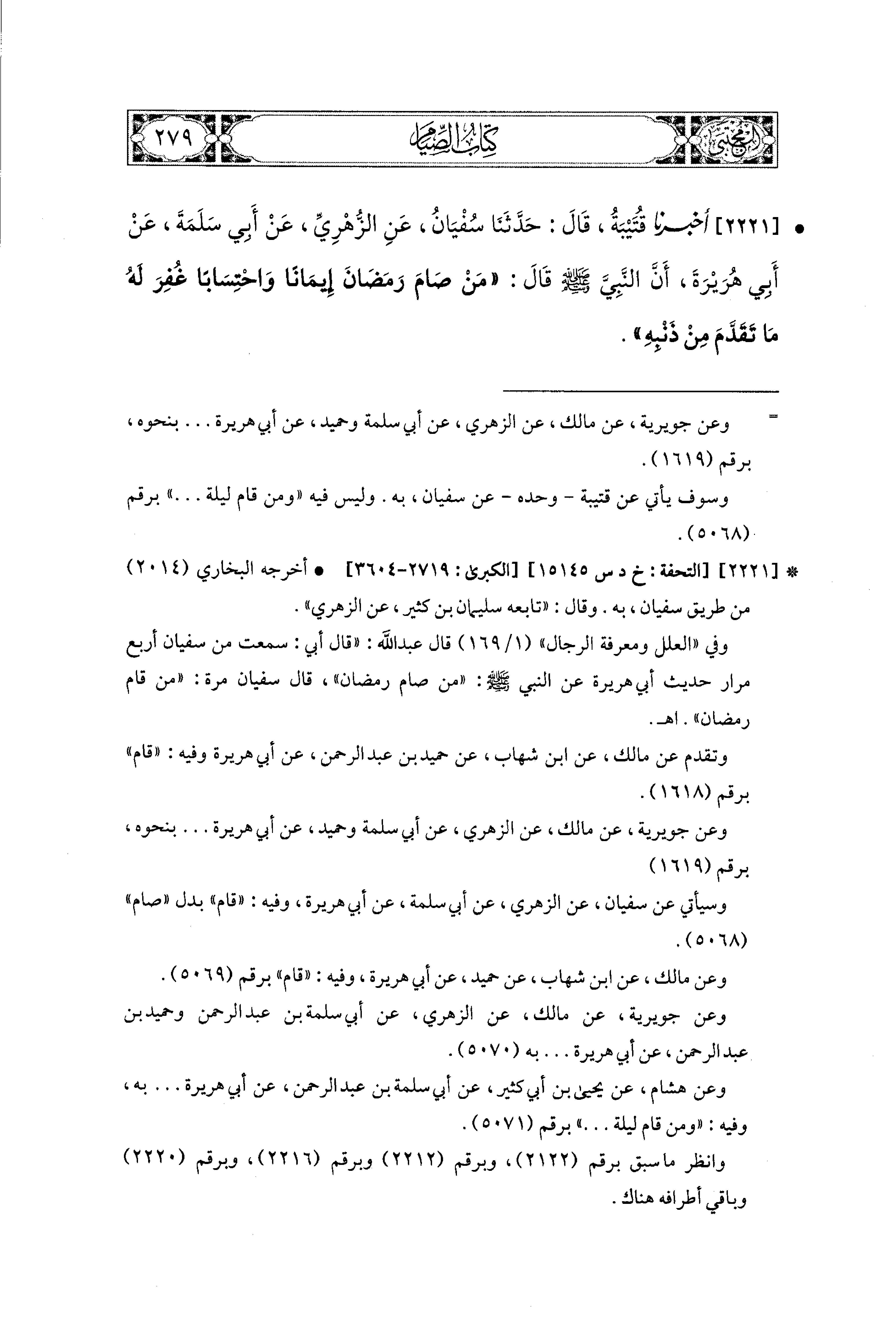 2221- أَخبَرَنا قُتَيبَةُ، قال: حَدثنا سُفيَانُ، عَنِ الزُّهْرِيِّ، عَن أَبي سَلَمَةَ، عَن أَبي هُرَيرَةَ، أَنَّ النَّبيَّ صَلى الله عَليه وسَلم قَالَ: مَنْ صَامَ رَمَضَانَ إِيمَانًا وَاحْتِسَابًا غُفِرَ لَهُ مَا تَقَدَّمَ مِنْ ذَنْبِهِ.