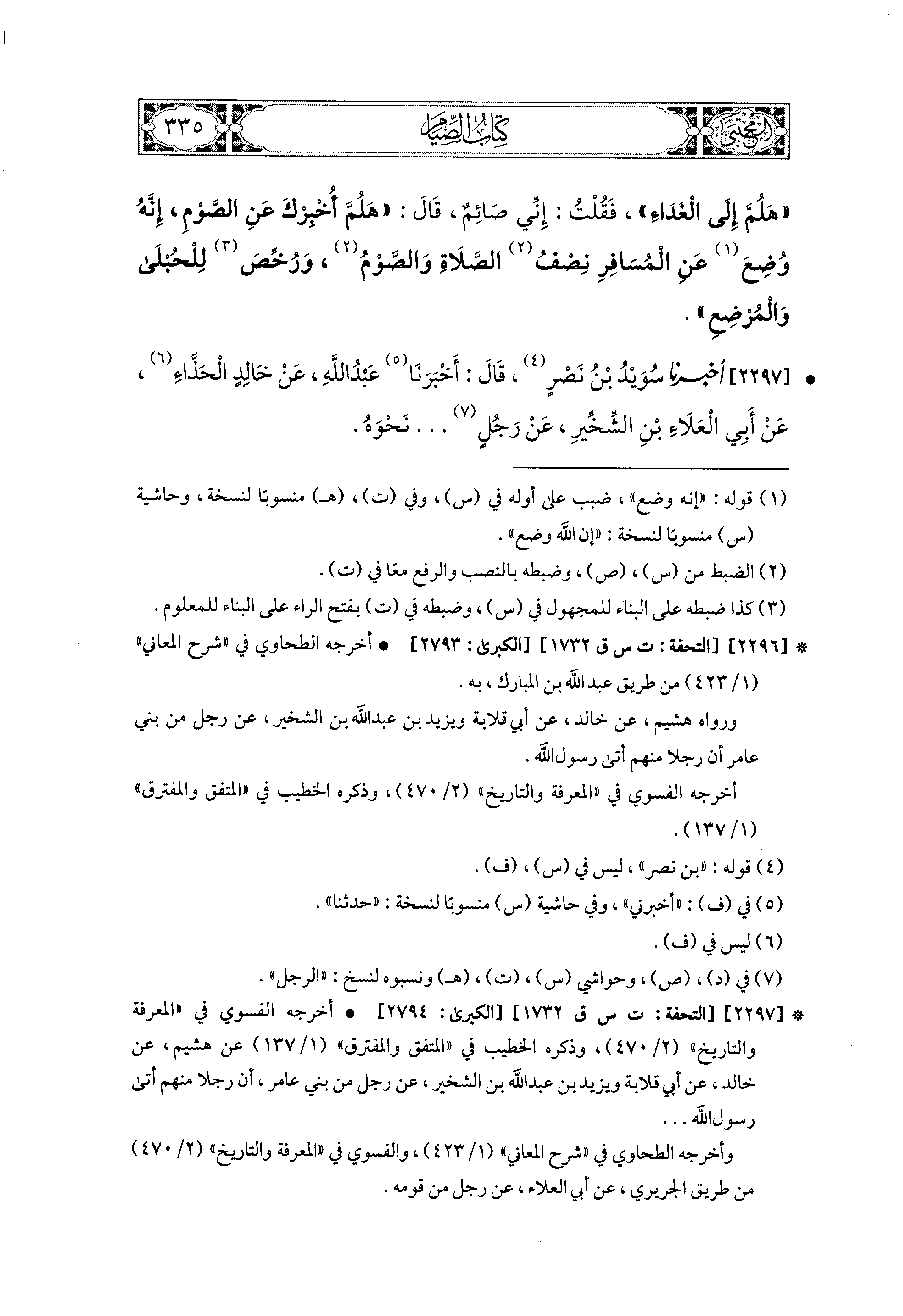 2297- أَخبَرَنا سُوَيْدُ بْنُ نَصْرٍ، قَالَ: أَخبَرنا عَبدُ اللهِ، عَن خَالِدٍ الحَذَّاءِ، عَن أَبي العَلاَءِ بْنِ الشِّخِّيرِ، عَن رَجُلٍ ... نَحْوَهُ.