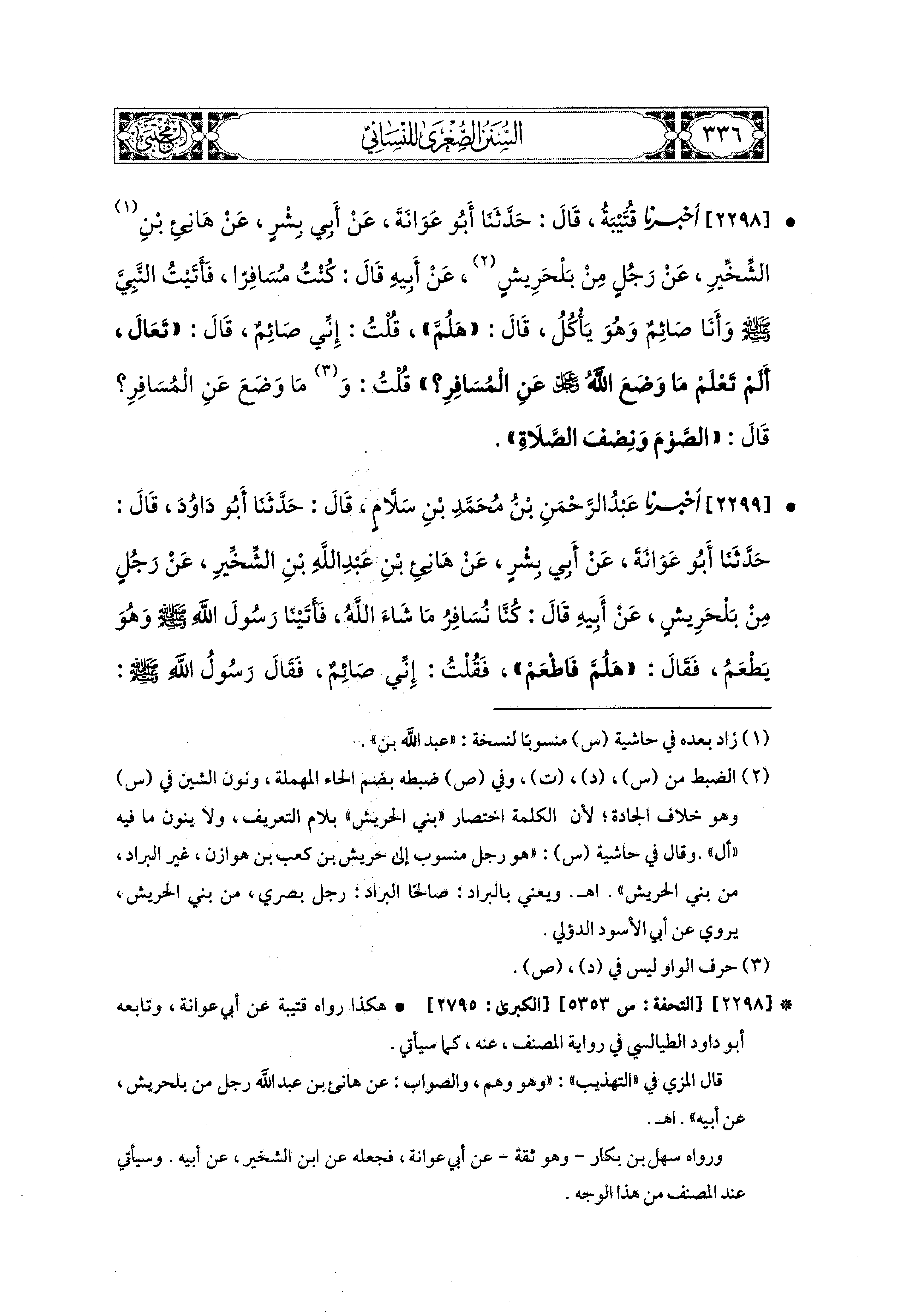 2299- أَخبَرَنا عَبدُ الرَّحمَنِ بْنُ مُحَمدِ بْنِ سَلاَّمٍ، قال: حَدثنا أَبو دَاوُدَ، قال: حَدثنا أَبو عَوَانَةَ، عَن أَبي بِشْرٍ، عَن هَانِئِ بْنِ عَبدِ اللهِ بْنِ الشِّخِّيرِ، عَن رَجُلٍ، مِنْ بَلْحَرِيشٍ، عَن أَبيهِ، قَالَ: كُنَّا نُسَافِرُ مَا شَاءَ اللهُ، فَأَتَيْنَا رَسُولَ اللهِ صَلى الله عَليه وسَلم وَهُوَ يَطْعَمُ، فَقَالَ: هَلُمَّ، فَاطْعَمْ، فَقُلْتُ: إِنِّي صَائِمٌ، فَقَالَ رَسُولُ اللهِ صَلى الله عَليه وسَلم: أُحَدِّثُكُمْ عَنِ الصِّيَامِ: إِنَّ اللهَ تَعَالَى وَضَعَ عَنِ المُسَافِرِ الصَّوْمَ وَشَطْرَ الصَّلاَةِ.