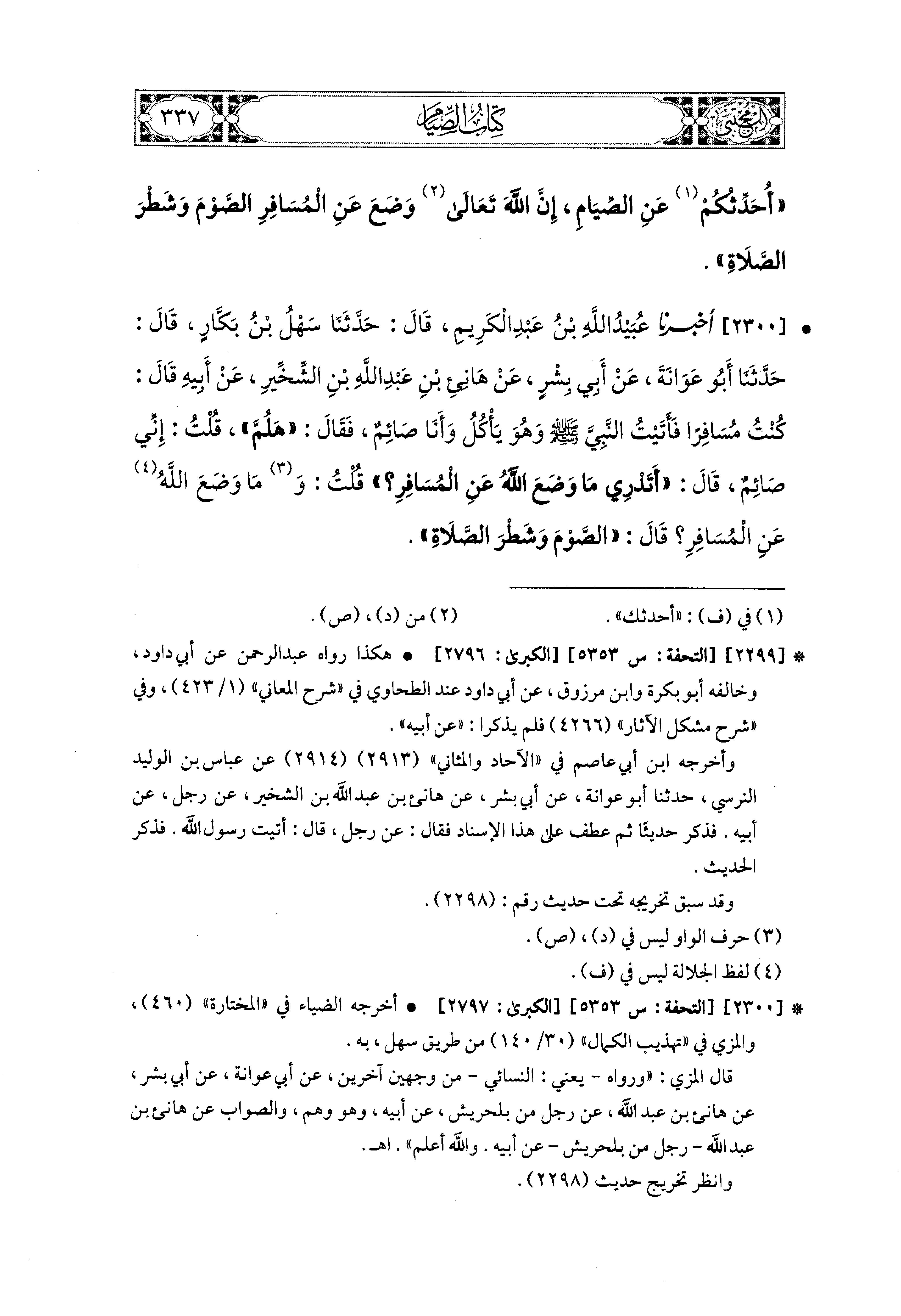 2300- أَخبَرَنا عُبَيدُ اللهِ بْنُ عَبدِ الكَرِيمِ، قال: حَدثنا سَهْلُ بْنُ بَكَّارٍ، قال: حَدثنا أَبو عَوَانَةَ، عَن أَبي بِشْرٍ، عَن هَانِئِ بْنِ عَبدِ اللهِ بْنِ الشِّخِّيرِ، عَن أَبيهِ، قَالَ: كُنْتُ مُسَافِرًا، فَأَتَيْتُ النَّبيَّ صَلى الله عَليه وسَلم وَهُوَ يَأْكُلُ وَأَنَا صَائِمٌ، فَقَالَ: هَلُمَّ، قُلْتُ: إِنِّي صَائِمٌ، قَالَ: أَتَدْرِي مَا وَضَعَ اللهُ عَنِ المُسَافِرِ، قُلْتُ: وَمَا وَضَعَ اللهُ عَنِ المُسَافِرِ؟ قَالَ: الصَّوْمَ وَشَطْرَ الصَّلاَةِ.