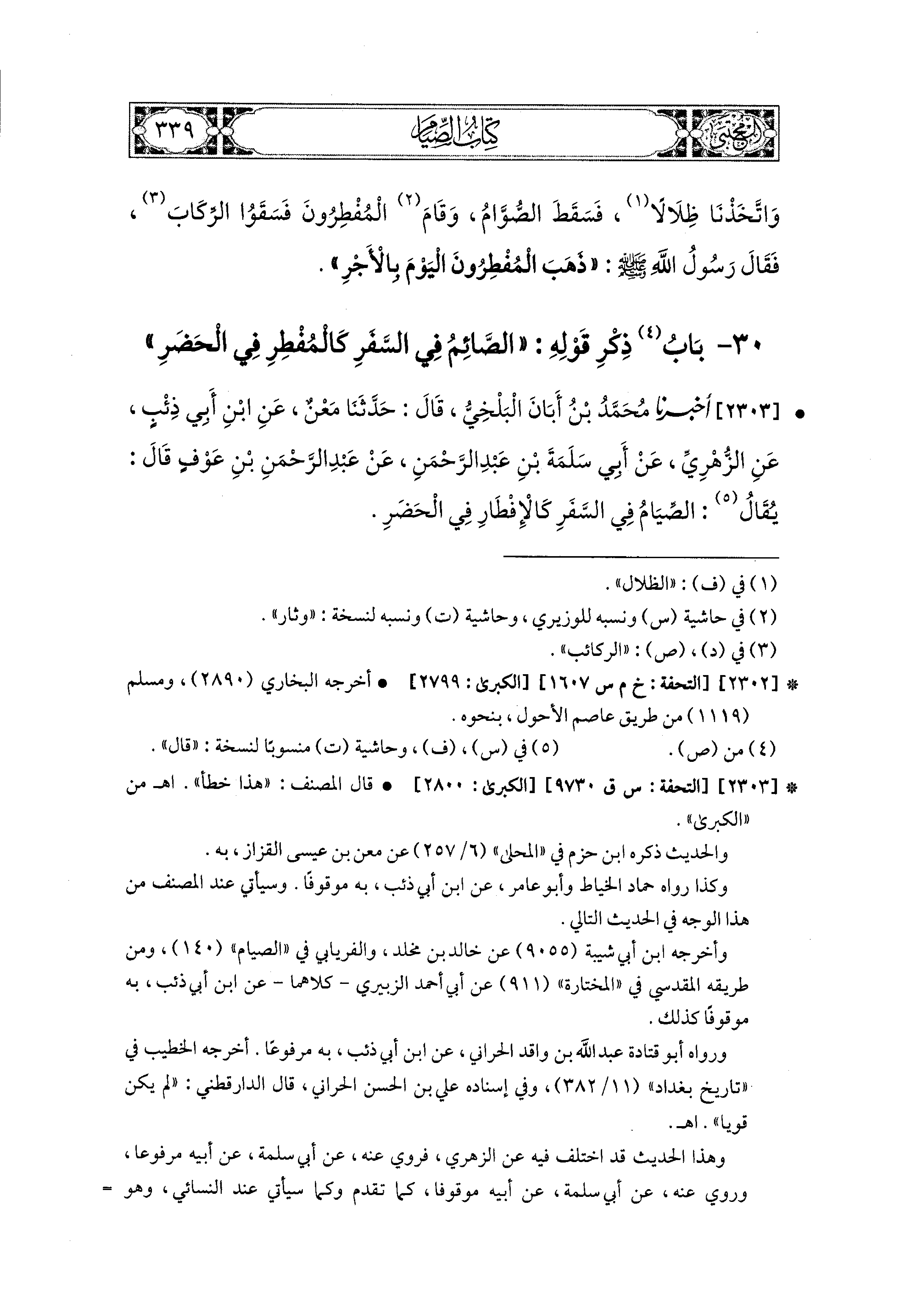 2303- أَخبَرَنا مُحَمد بْنُ أَبَانَ البَلْخِيُّ، قال: حَدثنا مَعْنٌ، عَنِ ابنِ أَبي ذِئْبٍ، عَنِ الزُّهْرِيِّ، عَن أَبي سَلَمَةَ بْنِ عَبدِ الرَّحمَنِ، عَن عَبدِ الرَّحمَنِ بْنِ عَوْفٍ، قَالَ: يُقَالُ: الصِّيَامُ فِي السَّفَرِ كَالإِفْطَارِ فِي الحَضَرِ.