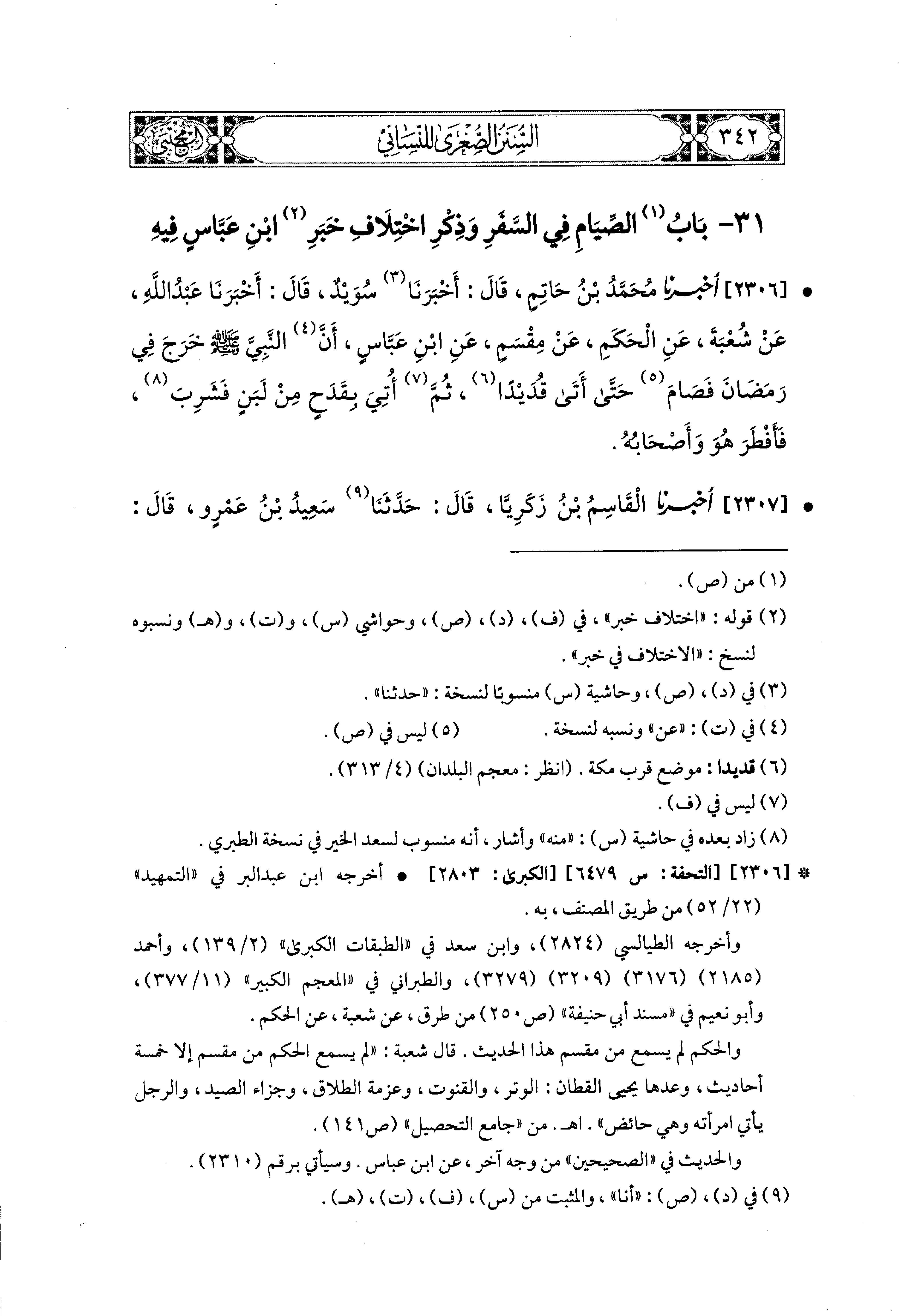 2307- أَخبَرَنا القَاسِمُ بْنُ زَكَرِيَّا، قال: حَدثنا سَعيدُ بْنُ عَمْرٍو، قال: حَدثنا عَبْثَرٌ، عَنِ العَلاَءِ بْنِ المُسَيَّبِ، عَنِ الحَكَمِ بْنِ عُتَيْبَةَ، عَن مُجَاهِدٍ، عَنِ ابنِ عَبَّاسٍ، قَالَ: صَامَ رَسُولُ اللهِ صَلى الله عَليه وسَلم مِنَ المَدِينَةِ حَتَّى أَتَى قُدَيْدًا، ثُمَّ أَفْطَرَ حَتَّى أَتَى مَكَّةَ.