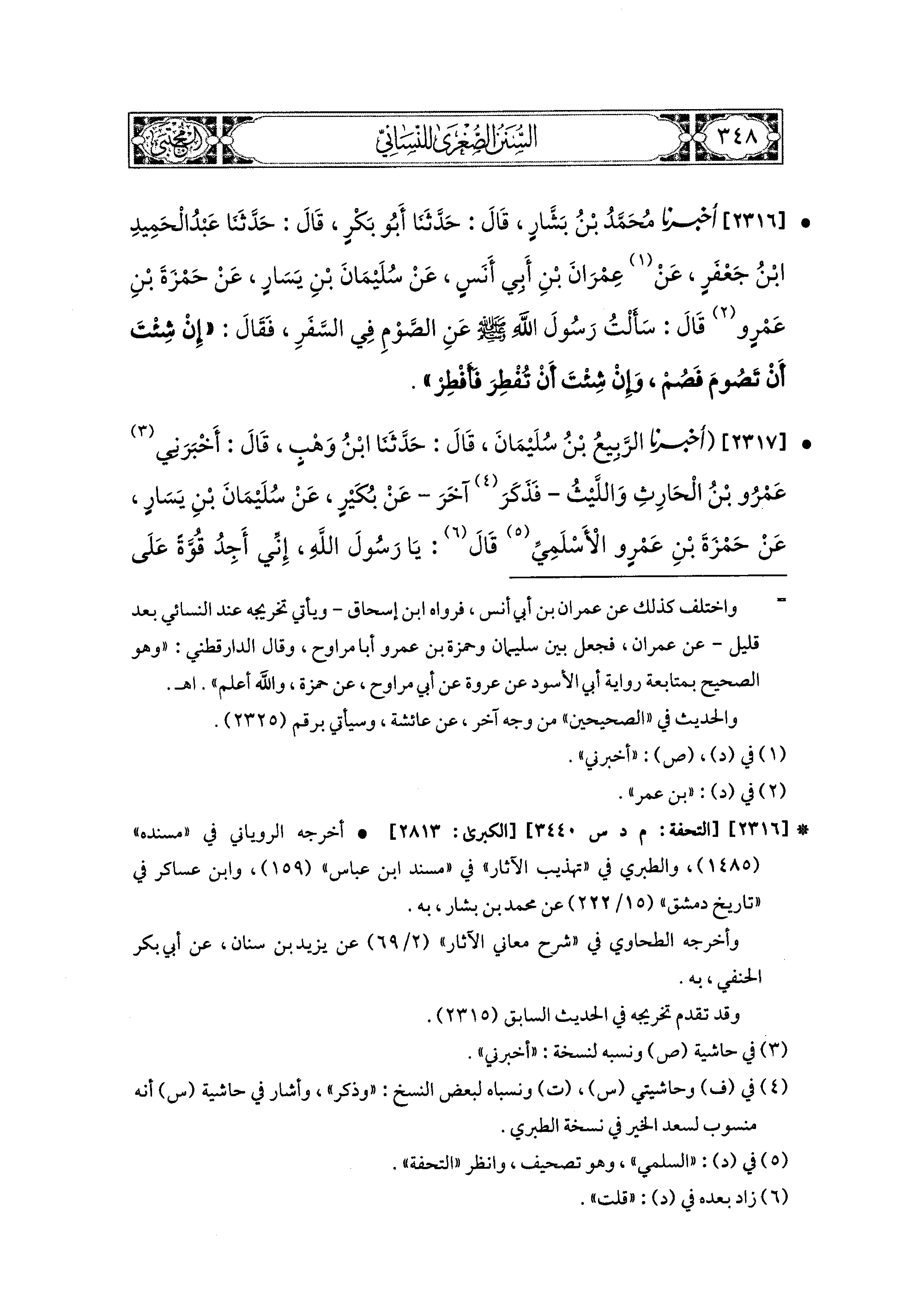 2316- أَخبَرَنا مُحَمد بْنُ بَشَّارٍ، قال: حَدثنا أَبو بَكْرٍ، قال: حَدثنا عَبدُ الحَميدِ بْنُ جَعْفَرٍ، عَن عِمْرَانَ بْنِ أَبي أَنَسٍ، عَن سُلَيمَانَ بْنِ يَسَارٍ، عَن حَمْزَةَ بْنِ عَمْرٍو، قَالَ: سَأَلْتُ رَسُولَ اللهِ صَلى الله عَليه وسَلم عَنِ الصَّوْمِ فِي السَّفَرِ؟ فَقَالَ: إِنْ شِئْتَ أَنْ تَصُومَ فَصُمْ، وَإِنْ شِئْتَ أَنْ تُفْطِرَ فَأَفْطِرْ.