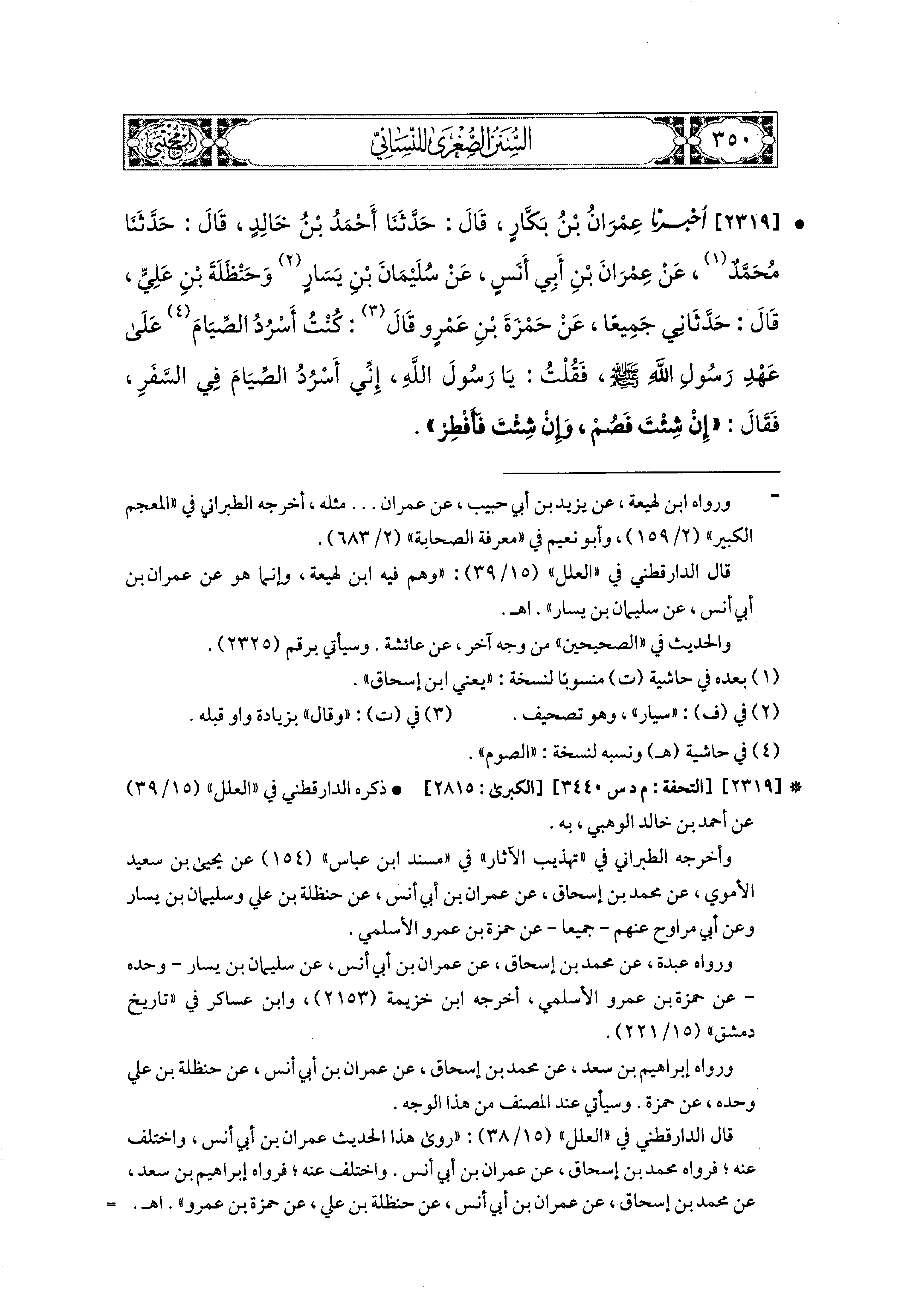 2319- أَخبَرَنا عِمْرَانُ بْنُ بَكَّارٍ، قال: حَدثنا أَحْمَدُ بْنُ خَالِدٍ، قال: حَدثنا مُحَمدٌ، عَن عِمْرَانَ بْنِ أَبي أَنَسٍ، عَن سُلَيمَانَ بْنِ يَسَارٍ، وَحَنْظَلَةَ بْنِ عَلِيٍّ، قَالَ: حَدَّثَاني جَميعًا عَن حَمْزَةَ بْنِ عَمْرٍو، قَالَ: كُنْتُ أَسْرُدُ الصِّيَامَ عَلَى عَهْدِ رَسُولِ اللهِ صَلى الله عَليه وسَلم، فَقُلْتُ: يَا رَسُولَ اللهِ، إِنِّي أَسْرُدُ الصِّيَامَ فِي السَّفَرِ، فَقَالَ: إِنْ شِئْتَ فَصُمْ، وَإِنْ شِئْتَ فَأَفْطِرْ.