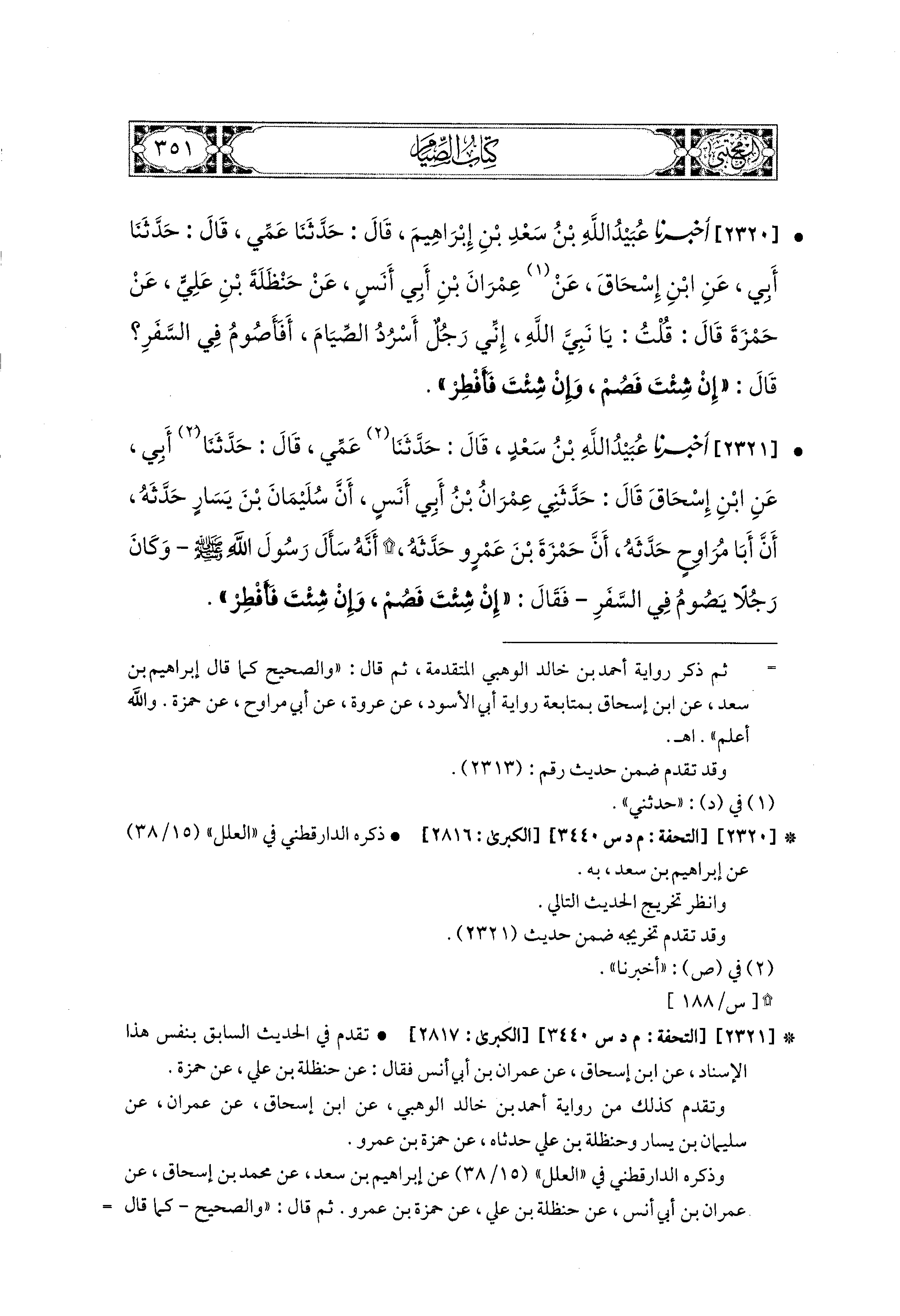 2321- أَخبَرَنا عُبَيدُ اللهِ بْنُ سَعْدٍ، قال: حَدثنا عَمِّي، قال: حَدثنا أَبي، عَنِ ابنِ إِسحَاقَ، قَالَ: حَدَّثَني عِمْرَانُ بْنُ أَبي أَنَسٍ، أَنَّ سُلَيمَانَ بْنَ يَسَارٍ، حَدَّثَهُ أَنَّ أَبَا مُرَاوِحٍ، حَدَّثَهُ أَنَّ حَمْزَةَ بْنَ عَمْرٍو، حَدَّثَهُ أَنَّهُ سَأَلَ رَسُولَ اللهِ صَلى الله عَليه وسَلم، وَكَانَ رَجُلاً يَصُومُ فِي السَّفَرِ، فَقَالَ: إِنْ شِئْتَ فَصُمْ، وَإِنْ شِئْتَ فَأَفْطِرْ.