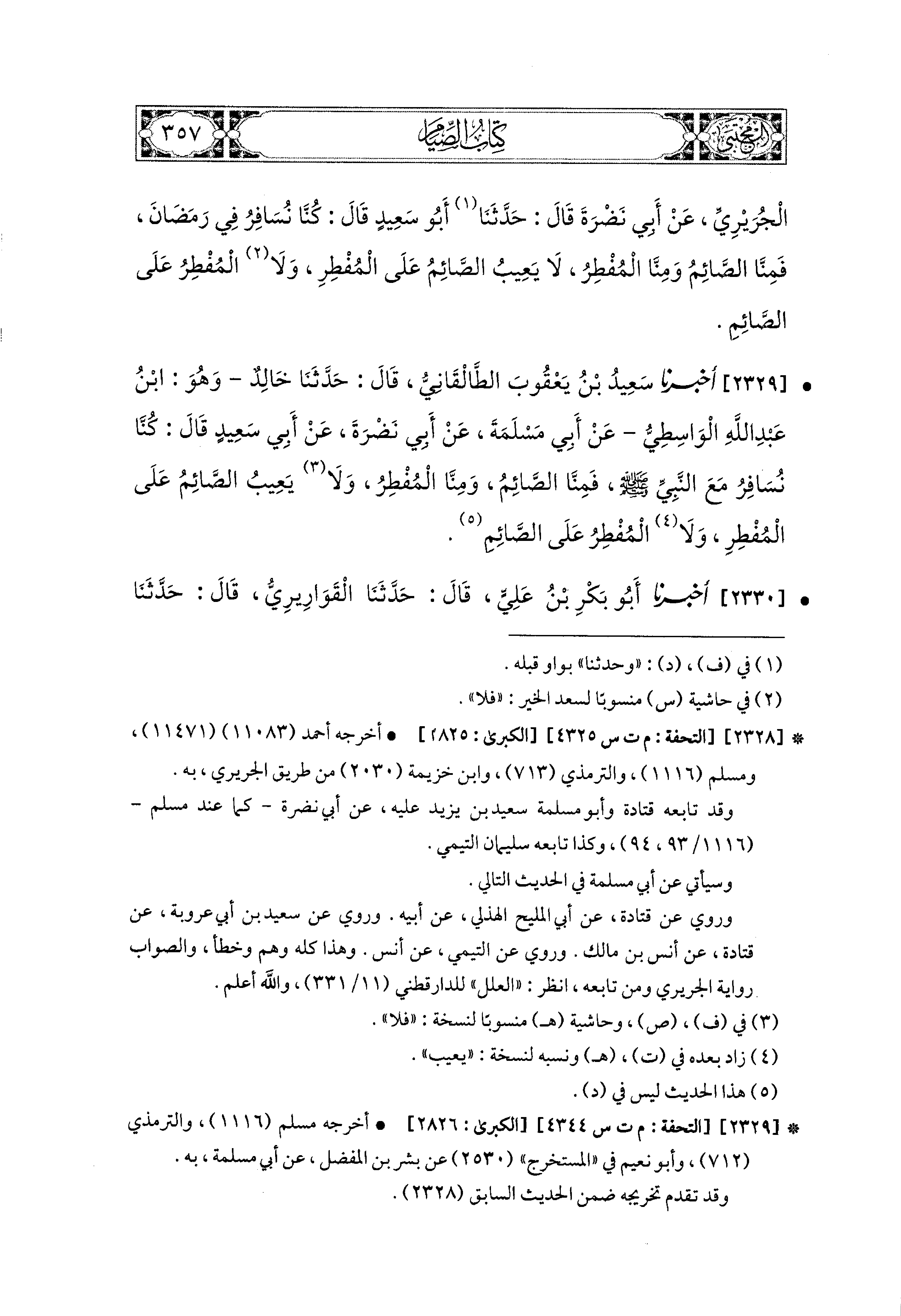 2329- أَخبَرَنا سَعيدُ بْنُ يَعقُوبَ الطَّالقَانيُّ، قال: حَدثنا خَالِدٌ، وَهُوَ ابنُ عَبدِ اللهِ الوَاسِطِيُّ، عَن أَبي مَسْلَمَةَ (1)، عَن أَبي نَضْرَةَ، عَن أَبي سَعيدٍ، قَالَ: كُنَّا نُسَافِرُ مَعَ النَّبيِّ صَلى الله عَليه وسَلم فَمِنَّا الصَّائِمُ وَمِنَّا المُفْطِرُ، وَلاَ يَعِيبُ الصَّائِمُ عَلَى المُفْطِرِ، وَلاَ المُفْطِرُ عَلَى الصَّائِمِ.