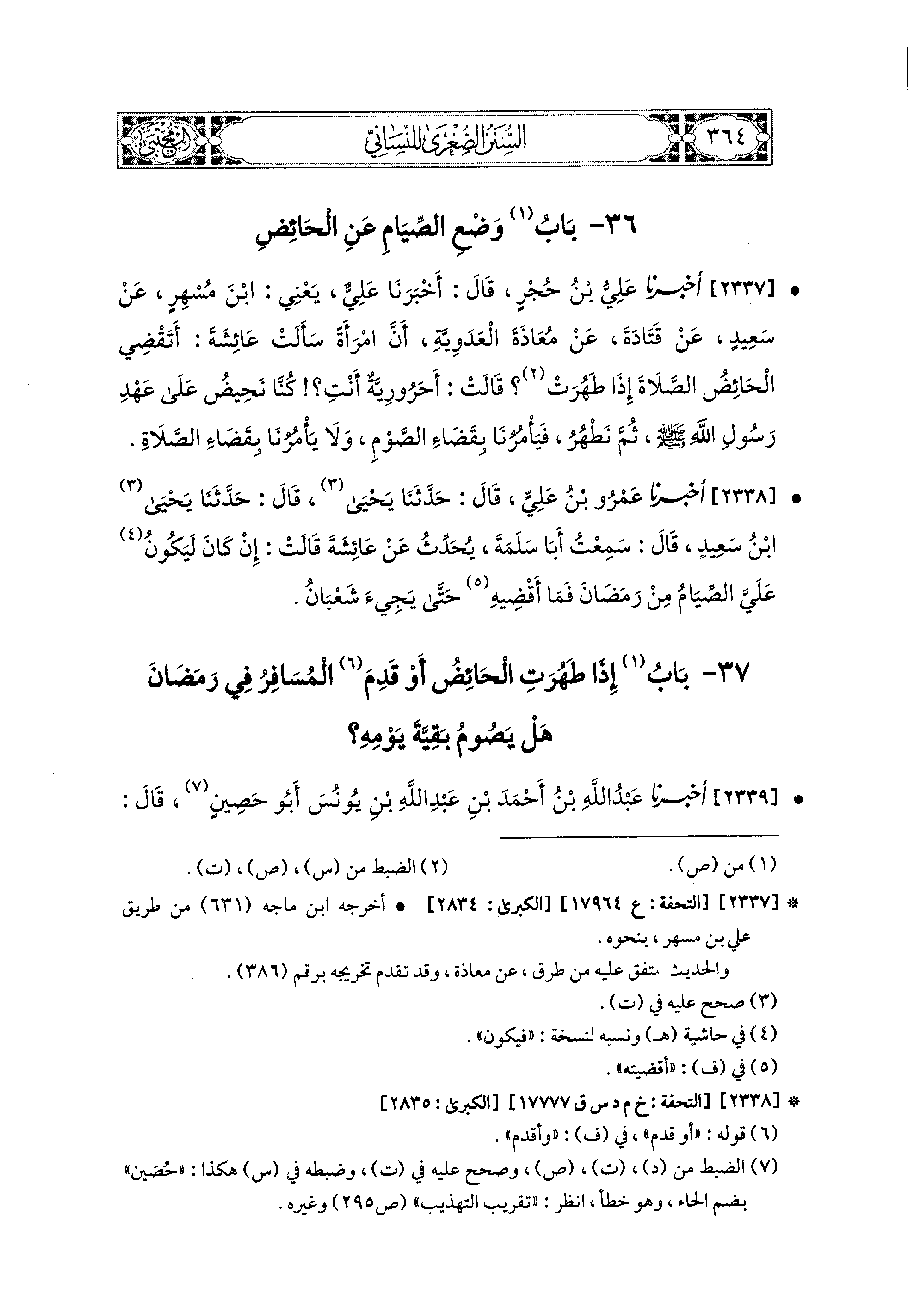 2337- أَخبَرَنا عَلِيُّ بْنُ حُجْرٍ، قَالَ: أَخبَرنا عَلِيٌّ، يَعْني ابنَ مُسْهِرٍ، عَن سَعيدٍ، عَن قَتَادَةَ، عَن مُعَاذَةَ العَدَوِيَّةِ، أَنَّ امْرَأَةً سَأَلَتْ عَائِشَةَ: أَتَقْضِي الحَائِضُ الصَّلاَةَ إِذَا طَهُرَتْ؟ قَالَتْ: أَحَرُورِيَّةٌ أَنْتِ، كُنَّا نَحِيضُ عَلَى عَهْدِ رَسُولِ اللهِ صَلى الله عَليه وسَلم ثُمَّ نَطْهُرُ فَيَأْمُرُنَا بِقَضَاءِ الصَّوْمِ، وَلاَ يَأْمُرُنَا بِقَضَاءِ الصَّلاَةِ.