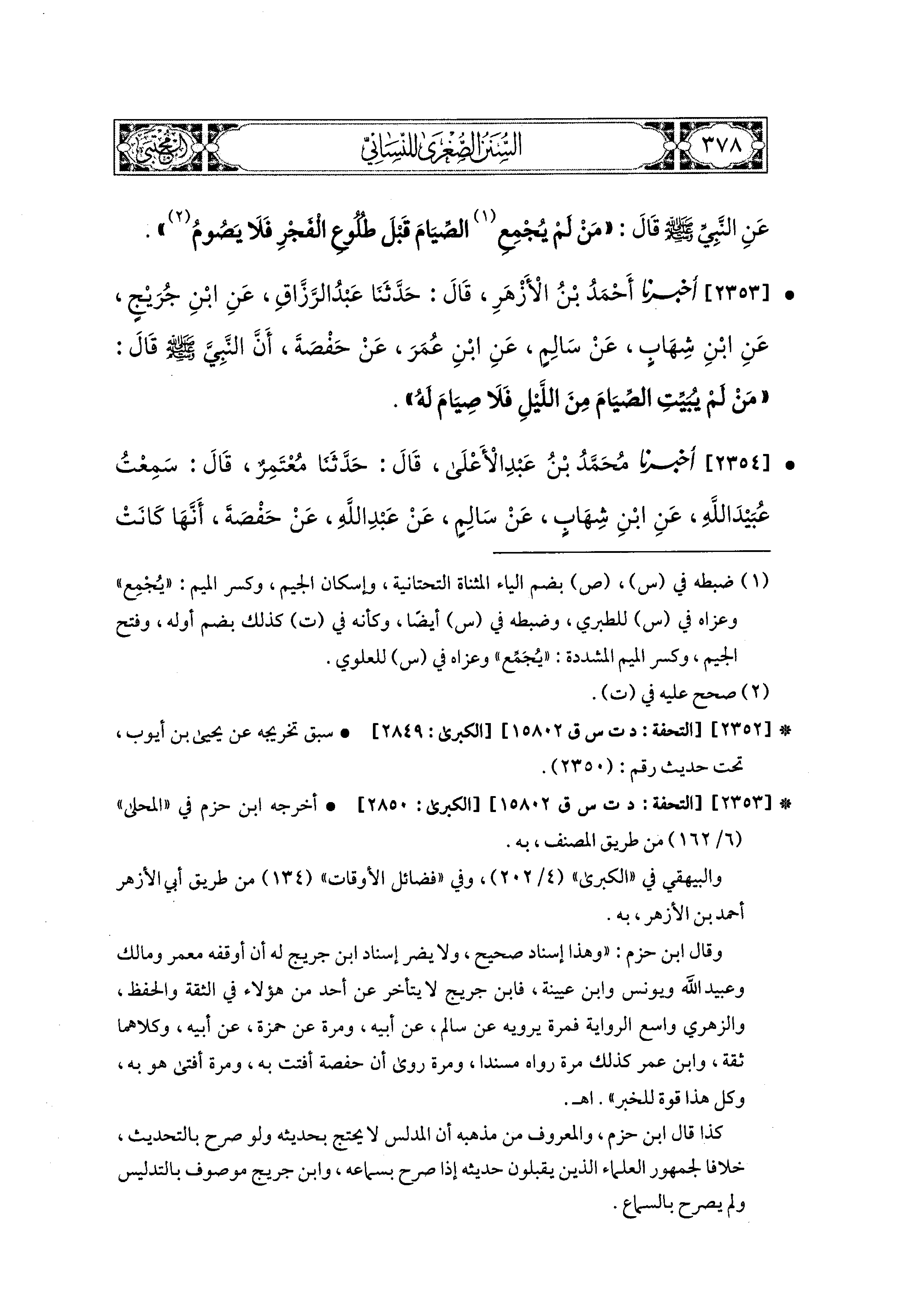 2353- أَخبَرَنا أَحْمَدُ بْنُ الأَزْهَرِ، قال: حَدثنا عَبدُ الرَّزَّاقِ، عَنِ ابنِ جُرَيْجٍ، عَنِ ابنِ شِهَابٍ، عَن سَالِمٍ، عَنِ ابنِ عُمَرَ، عَن حَفْصَةَ، أَنَّ النَّبيَّ صَلى الله عَليه وسَلم قَالَ: مَنْ لَمْ يُبَيِّتِ الصِّيَامَ مِنَ اللَّيلِ، فَلاَ صِيَامَ لَهُ.